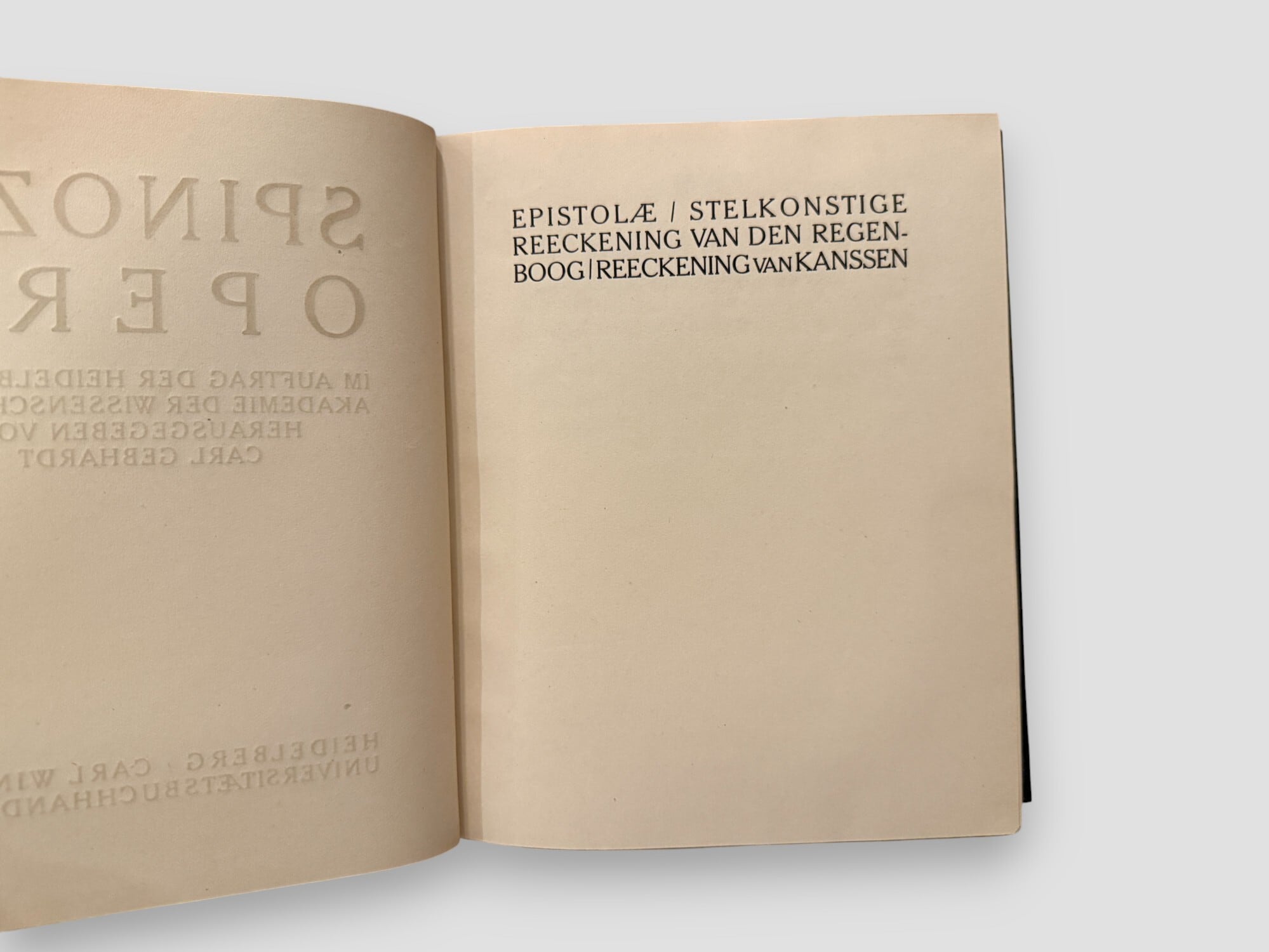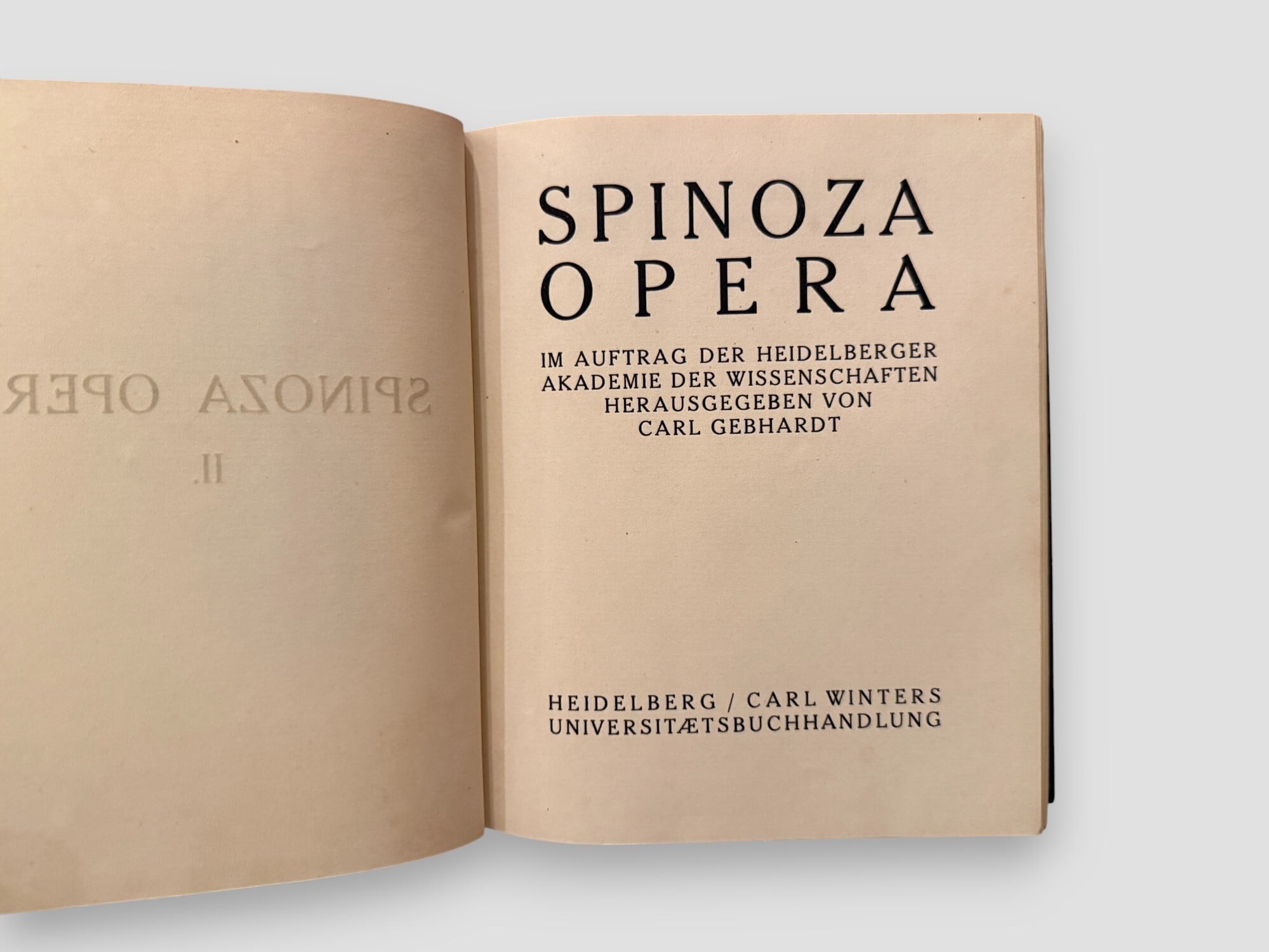 カール・ゲプハルト編によるスピノザの決定版全集『Spinoza Opera』全4巻セット。ハイデルベルク学術アカデミーの委託により刊行され、スピノザ研究の標準テキストとして20世紀以降の学術的参照に欠かせない基盤を築いた。内容は『エチカ』『神学政治論』『知性改善論』『政治論』をはじめとする主要著作、書簡、さらにヘブライ語文法書などを網羅し、批判校訂を経て整理されている。哲学・神学・政治思想・言語研究の諸領域を横断するスピノザ思想の全体像を示す重要資料。