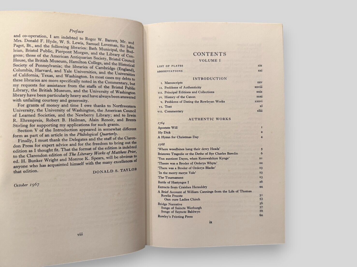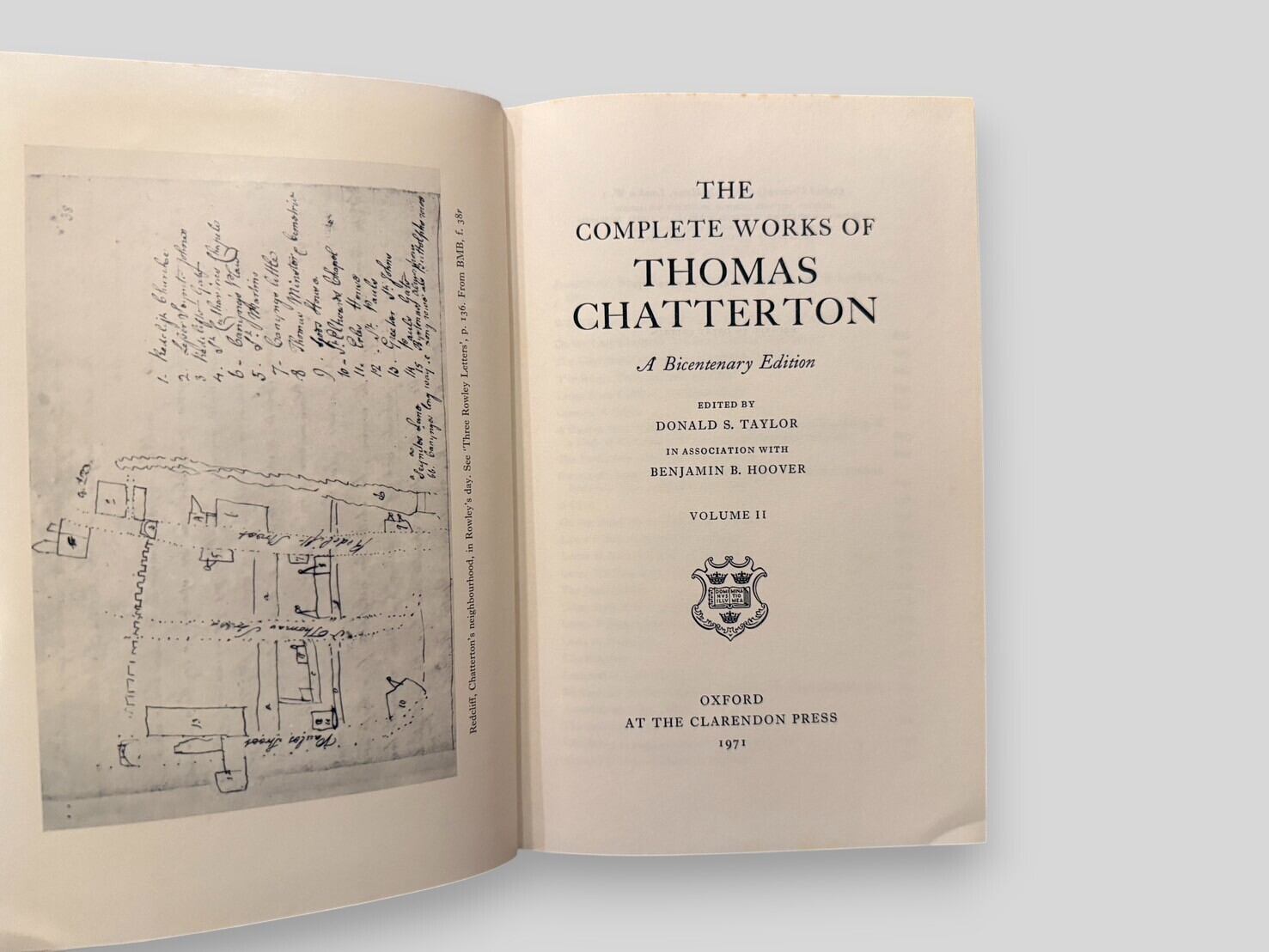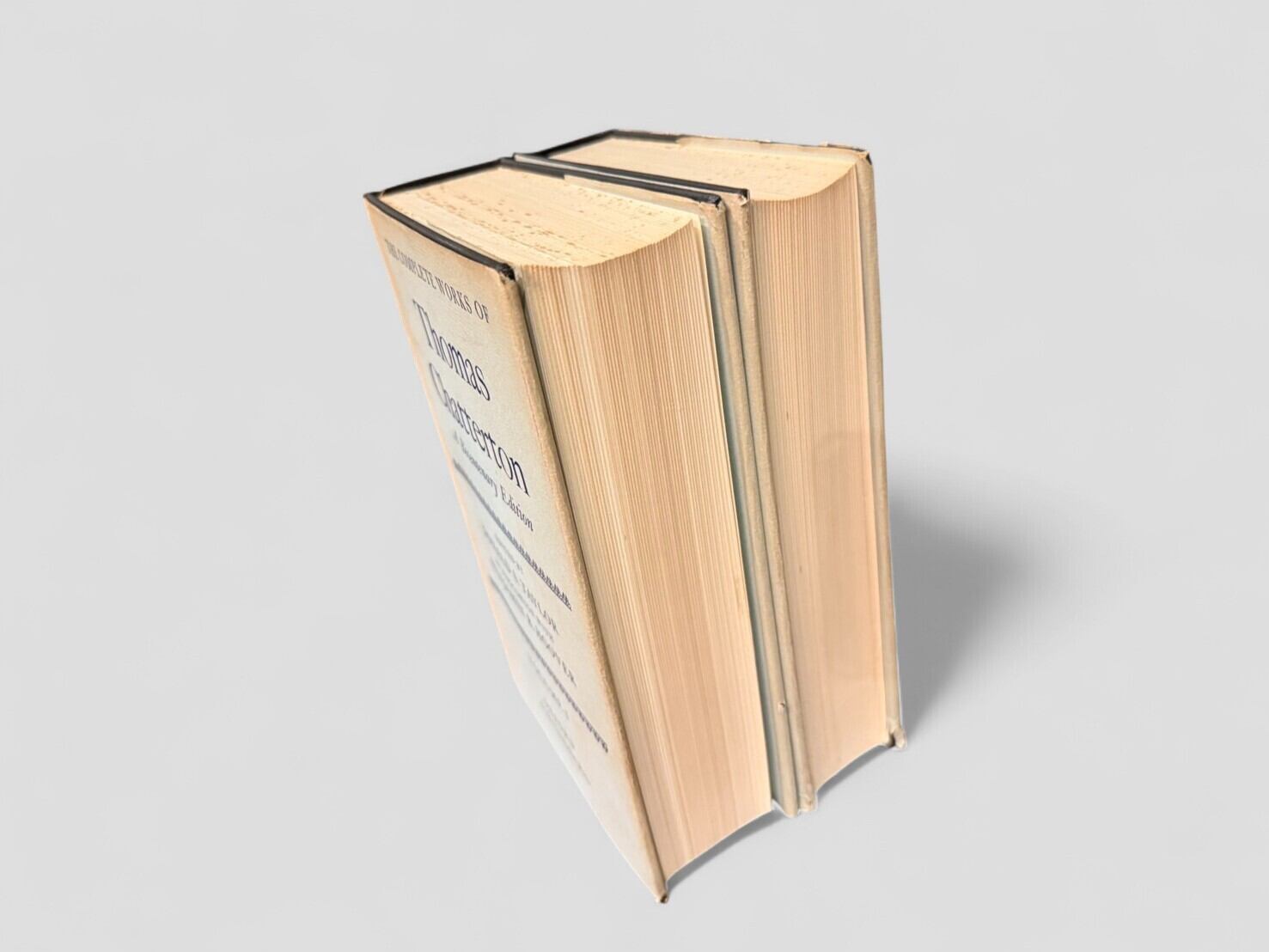 トマス・チャタートンは没後200年を記念して刊行された、クラレンデン・プレス版の決定的全集。第1巻には散文作品、書簡が収録されており、チャタートンの真作群を包括的に提示する。第2巻には「Works of Doubtful Authenticity」「Lost Works」「Items Not Printed」「Wrongly Attributed Works」をはじめ、詳細な注釈・用語集・索引を収録。学術的厳密さと資料的網羅性を兼ね備えた本書は、チャタートン研究および18世紀英文学研究において不可欠なテキストである。1971年刊行初版全2巻本揃。