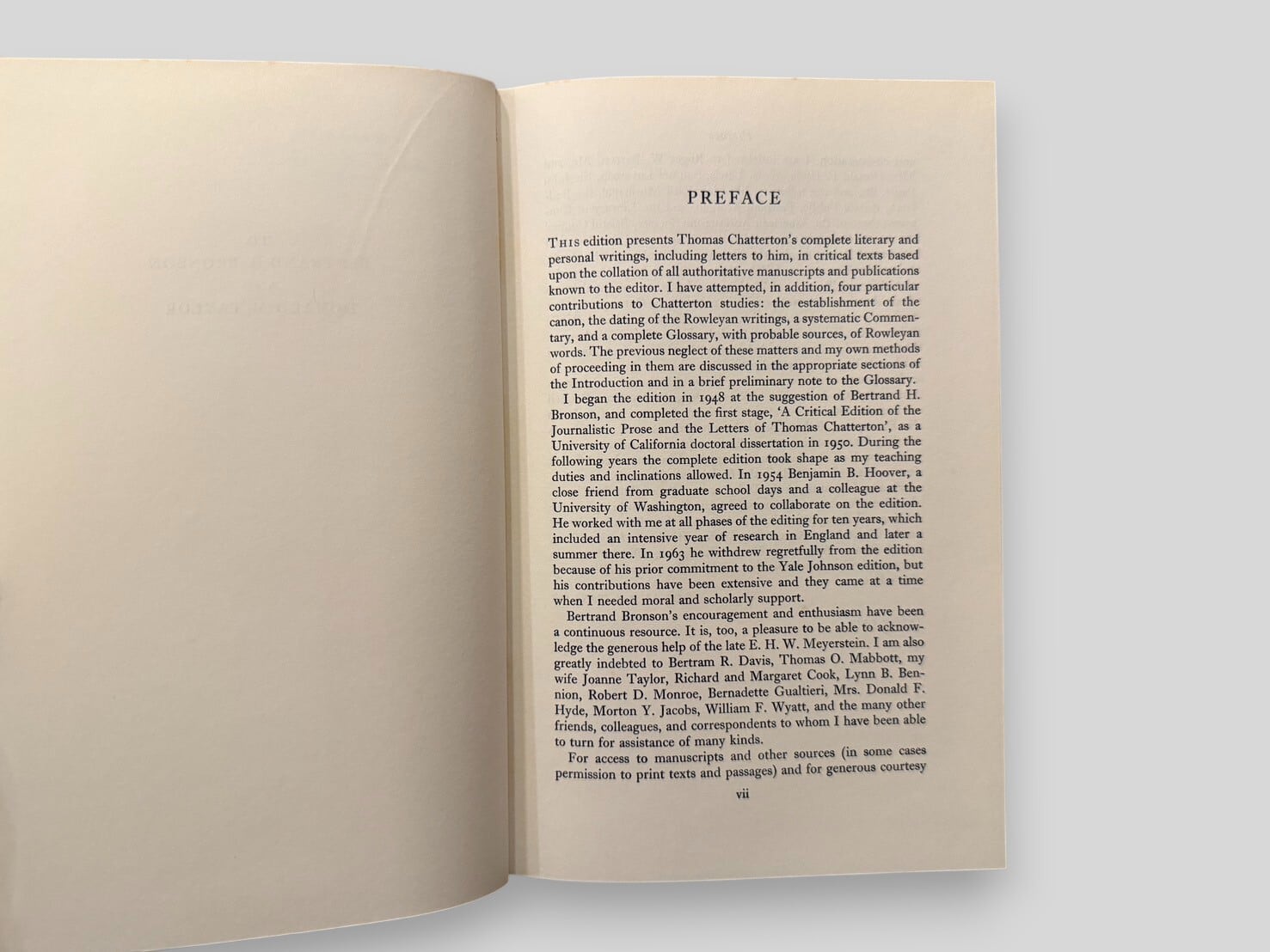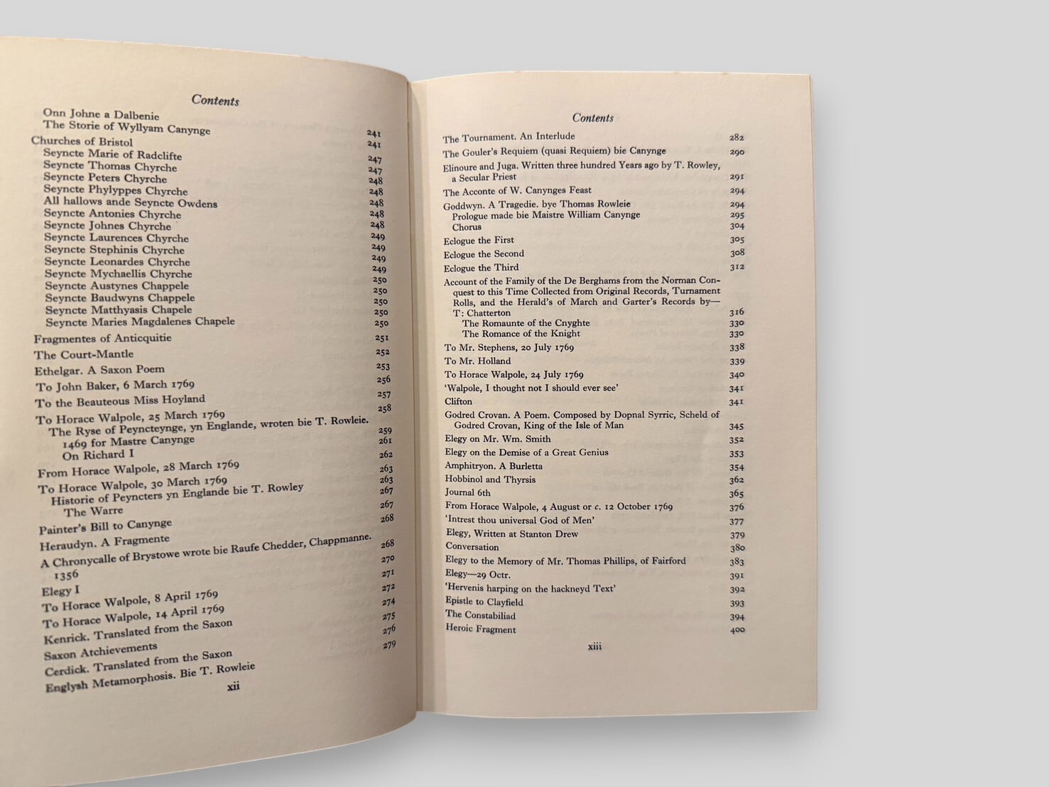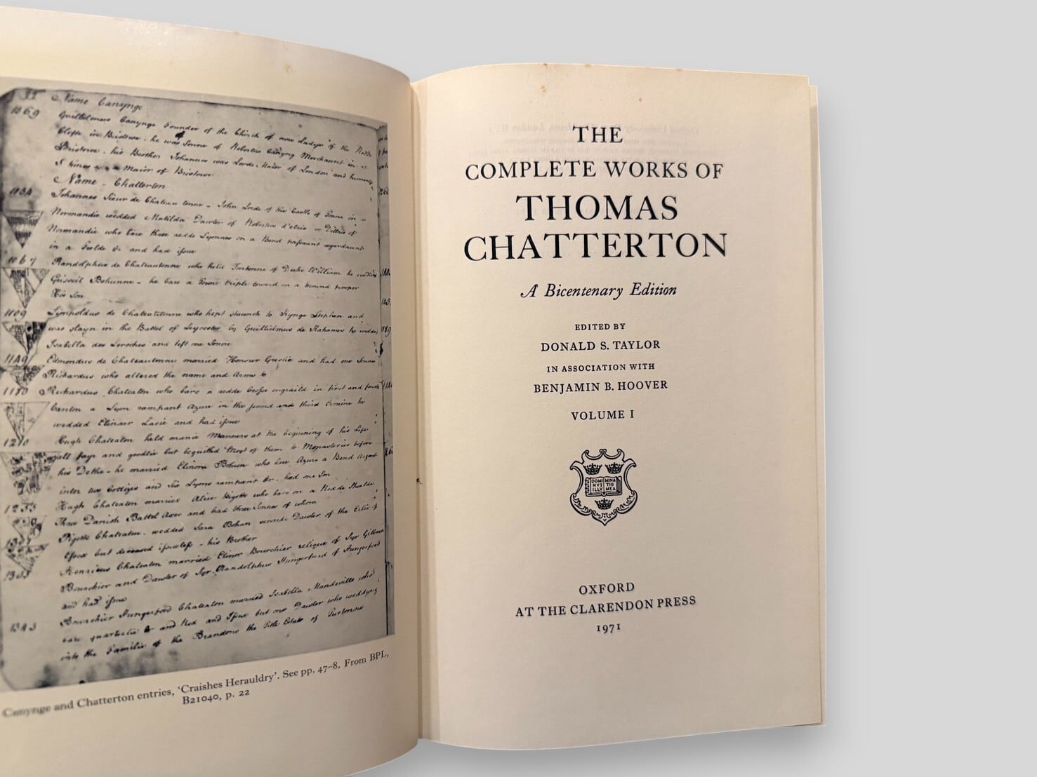 トマス・チャタートンは没後200年を記念して刊行された、クラレンデン・プレス版の決定的全集。第1巻には散文作品、書簡が収録されており、チャタートンの真作群を包括的に提示する。第2巻には「Works of Doubtful Authenticity」「Lost Works」「Items Not Printed」「Wrongly Attributed Works」をはじめ、詳細な注釈・用語集・索引を収録。学術的厳密さと資料的網羅性を兼ね備えた本書は、チャタートン研究および18世紀英文学研究において不可欠なテキストである。1971年刊行初版全2巻本揃。