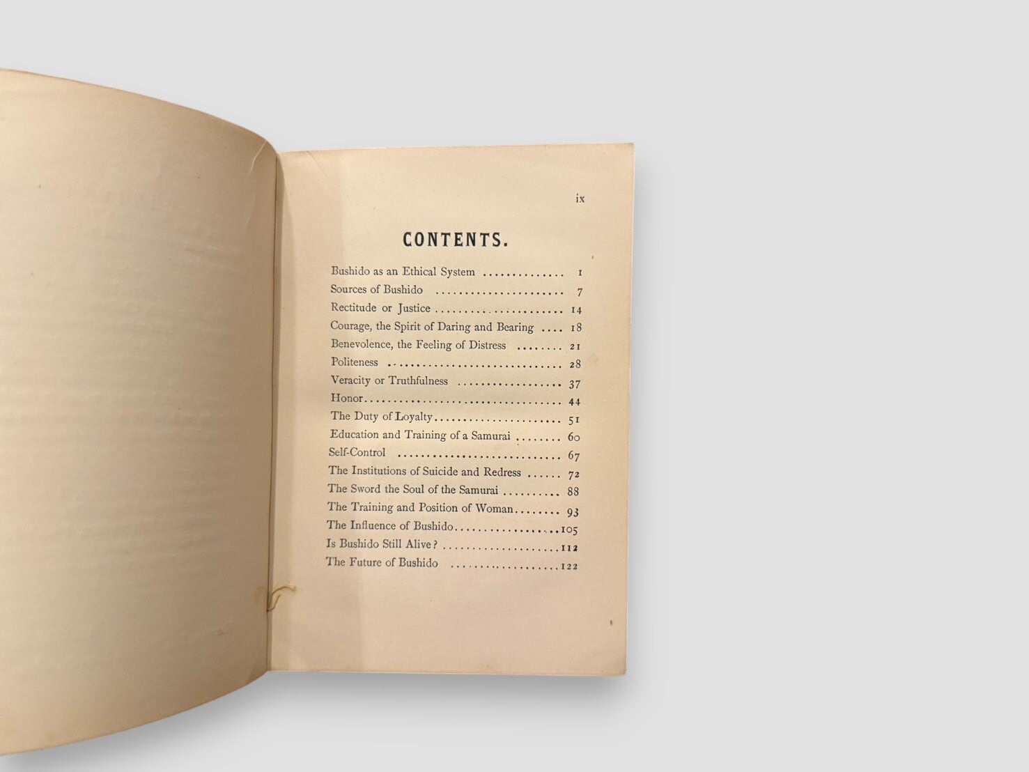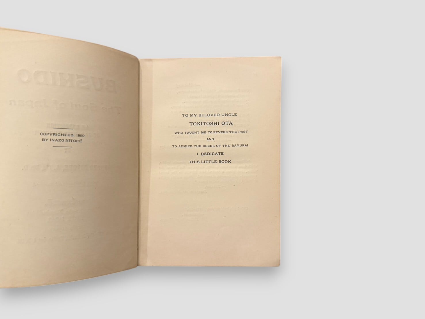 新渡戸稲造(1862–1933)による名著『武士道』。日本の武士道を西洋に初めて体系的に紹介した英文書。「正義」「勇気」「仁」「礼」「誠」「名誉」「忠義」などを中心に、武士道を西洋の騎士道や倫理思想と対比しつつ論じ、日本精神の核心を伝える。明治期日本の国際的思想交流を示す貴重な一冊。初版は1899年に米国で刊行、本書は国内で刊行された第5版。欧米社会に強い影響を与えた時期の重要な版。