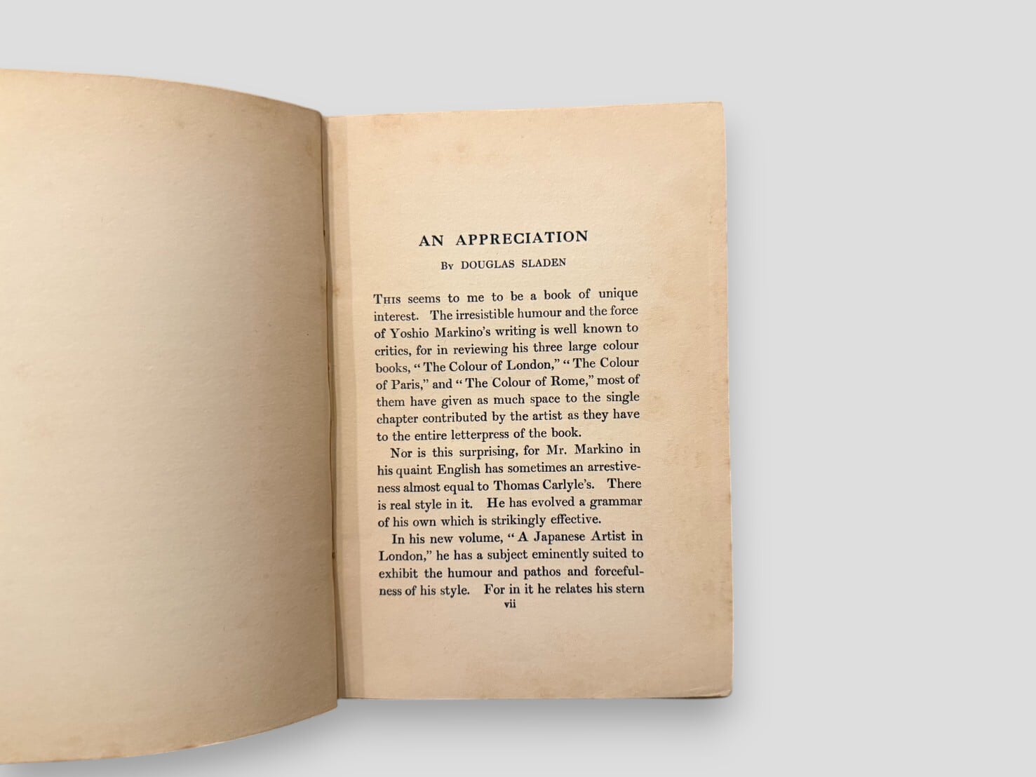 明治期に渡英した日本人水彩画家・牧野義雄(1874–1956)による自伝的エッセイ集。本文は著者による挿絵を含み、カラー口絵とモノクロ図版が収録されている。巻頭にはDouglas Sladenによる序文が付され、献辞はM.H. Spielmann夫妻に捧げられている。日本人が西洋社会に身を投じた希少な証言として、美術史・文化交流研究においても重要な一冊。1910年刊行初版。