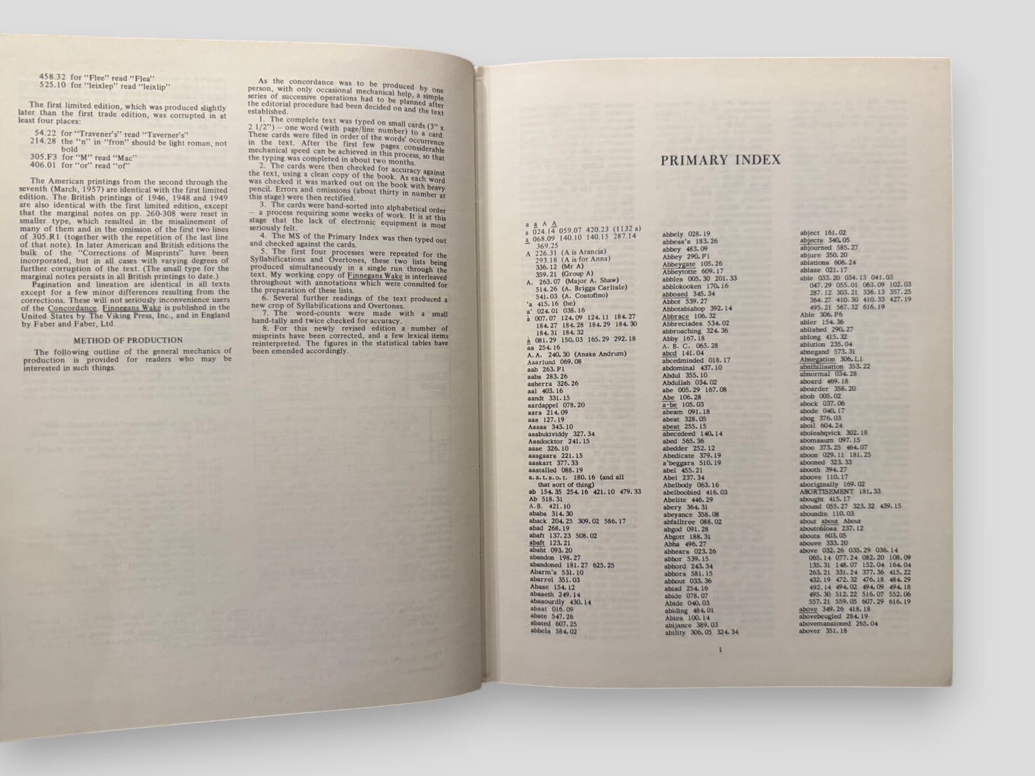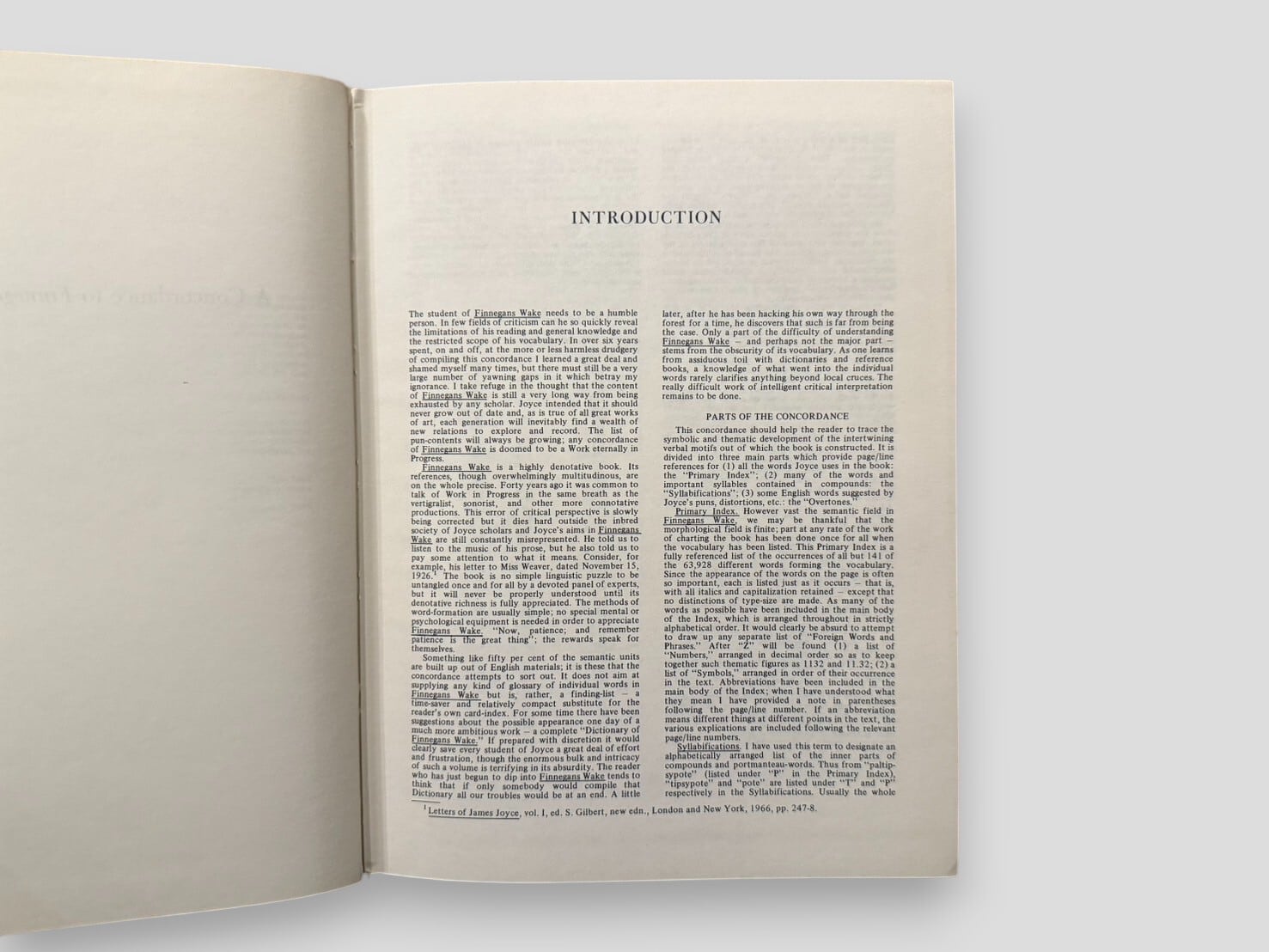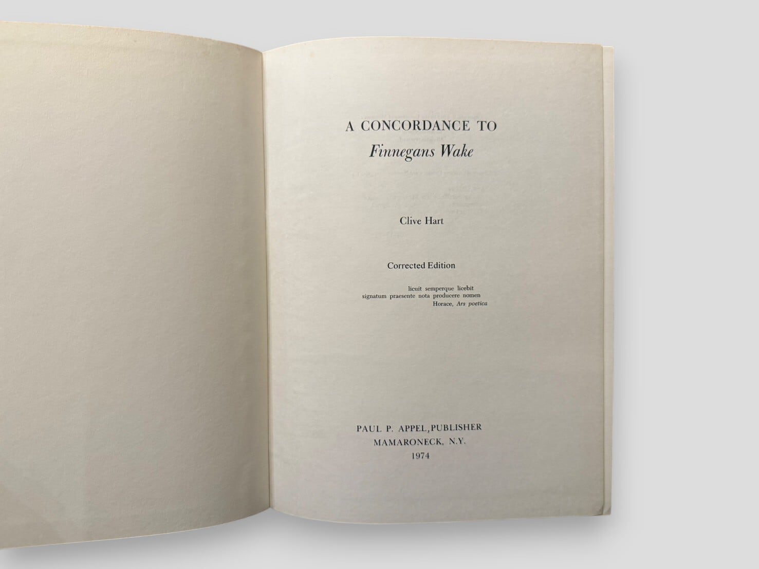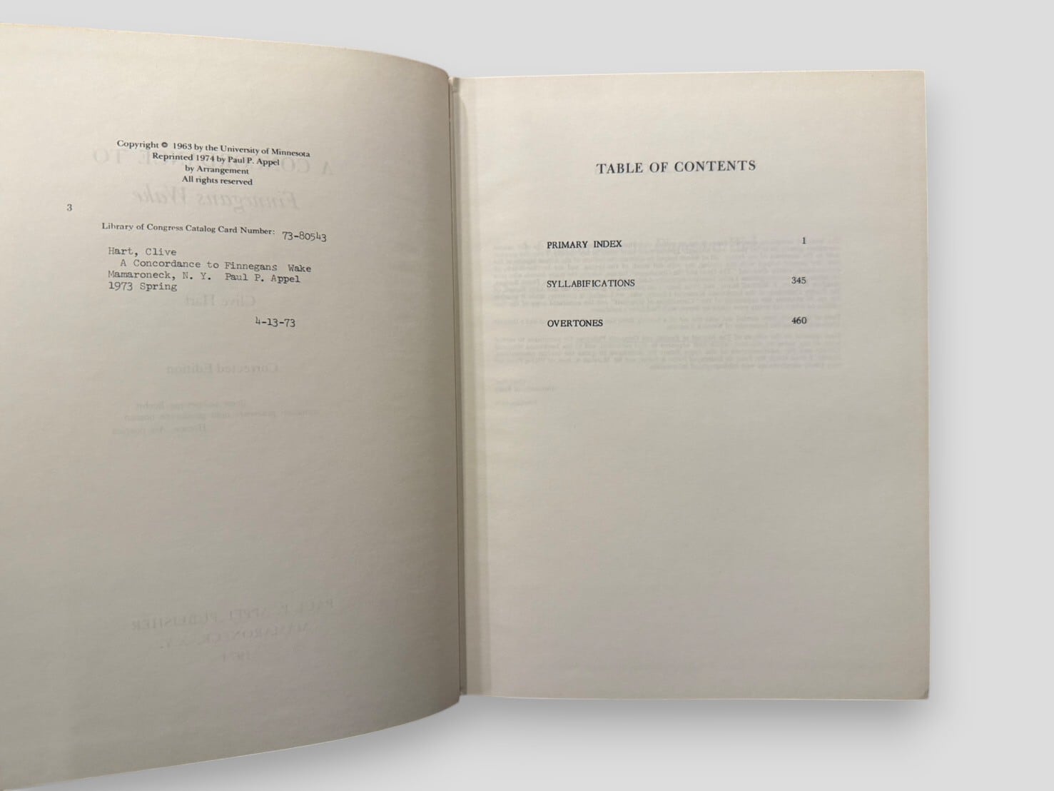 クライヴ・ハート(1932–2016)によるジェイムズ・ジョイス『Finnegans Wake』のための大規模な索引・注解集。初版は1963年にミネソタ大学出版局から刊行され、本書は1974年にPaul P. Appel社より再版された訂正版。全語彙を網羅する「Primary Index」に加え、音節分解を扱う「Syllabifications」、語の含意を探る「Overtones」を収録し、ジョイス研究における必携のリファレンスとなっている。複雑難解なテクストを解きほぐすための実務的かつ学術的な手引きとして、研究者・愛好家に広く利用され続けている1冊。