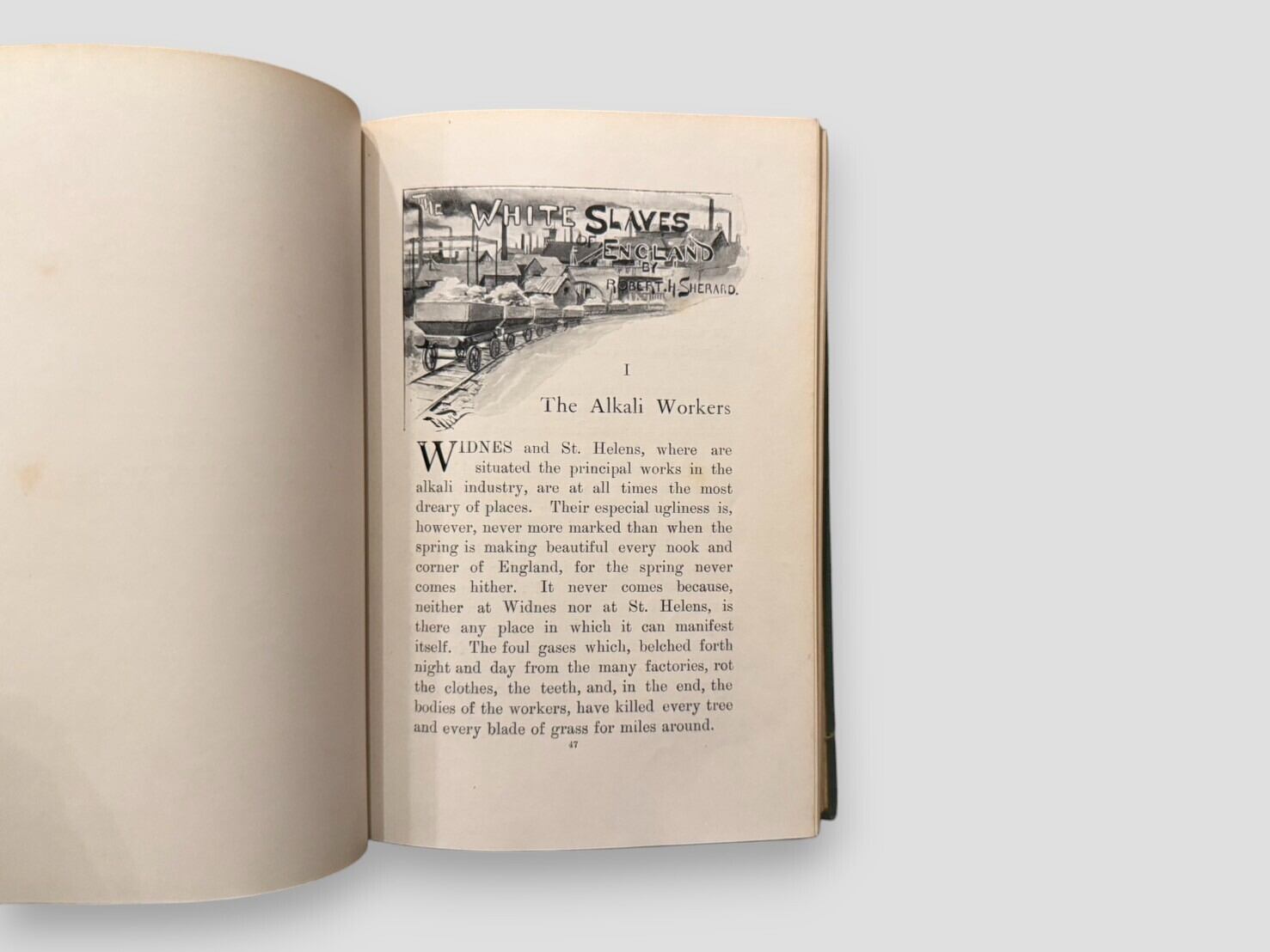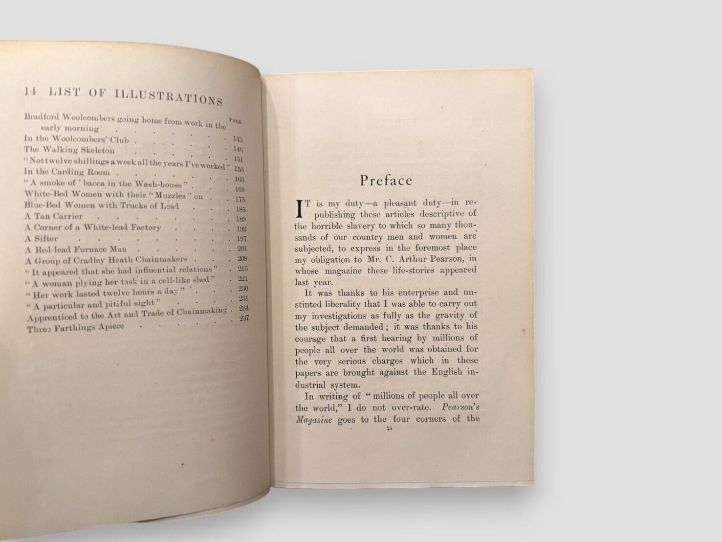 イギリスの工業都市における労働条件を克明に描き出し、アルカリ工場、釘職人、靴職人、羊毛梳き職人、ホワイトリード工場、鎖製造業など、産業革命期に酷使された労働者たちの生活と悲惨な労働環境を詳述する。特に女性や子供の労働の実態を鋭く描き出し、社会に大きな反響を呼んだ作品である。挿絵はHarold Piffardによるもので、フロントピースを含む40点の図版を収録。19世紀末イギリス社会批評の重要資料。