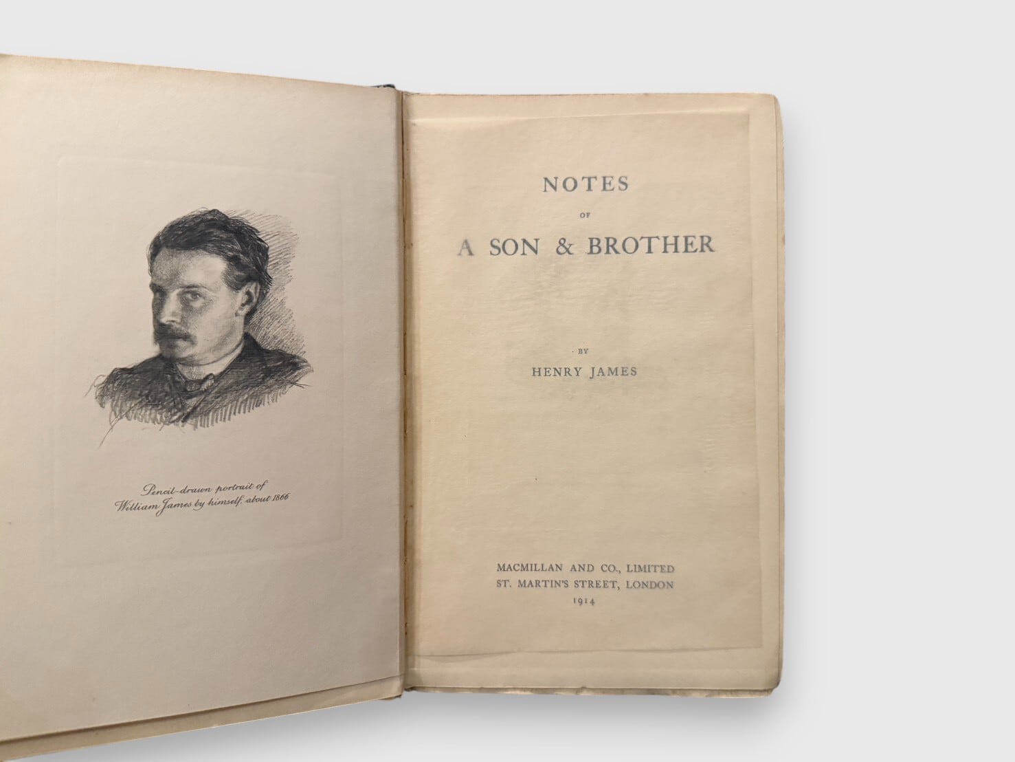 アメリカ出身の文豪ヘンリー・ジェイムズによる自伝的エッセイ集『ある息子と兄の覚え書』。前作『A Small Boy and Others』(1913)の続編として執筆され、兄ウィリアム・ジェイムズとの家族的・精神的な関わりを軸に、19世紀末から20世紀初頭にかけての知的世界を静謐に描く。6点の挿絵(ウィリアム・ジェイムズの自筆肖像を含む)を収録。1914年刊行、貴重な初版。