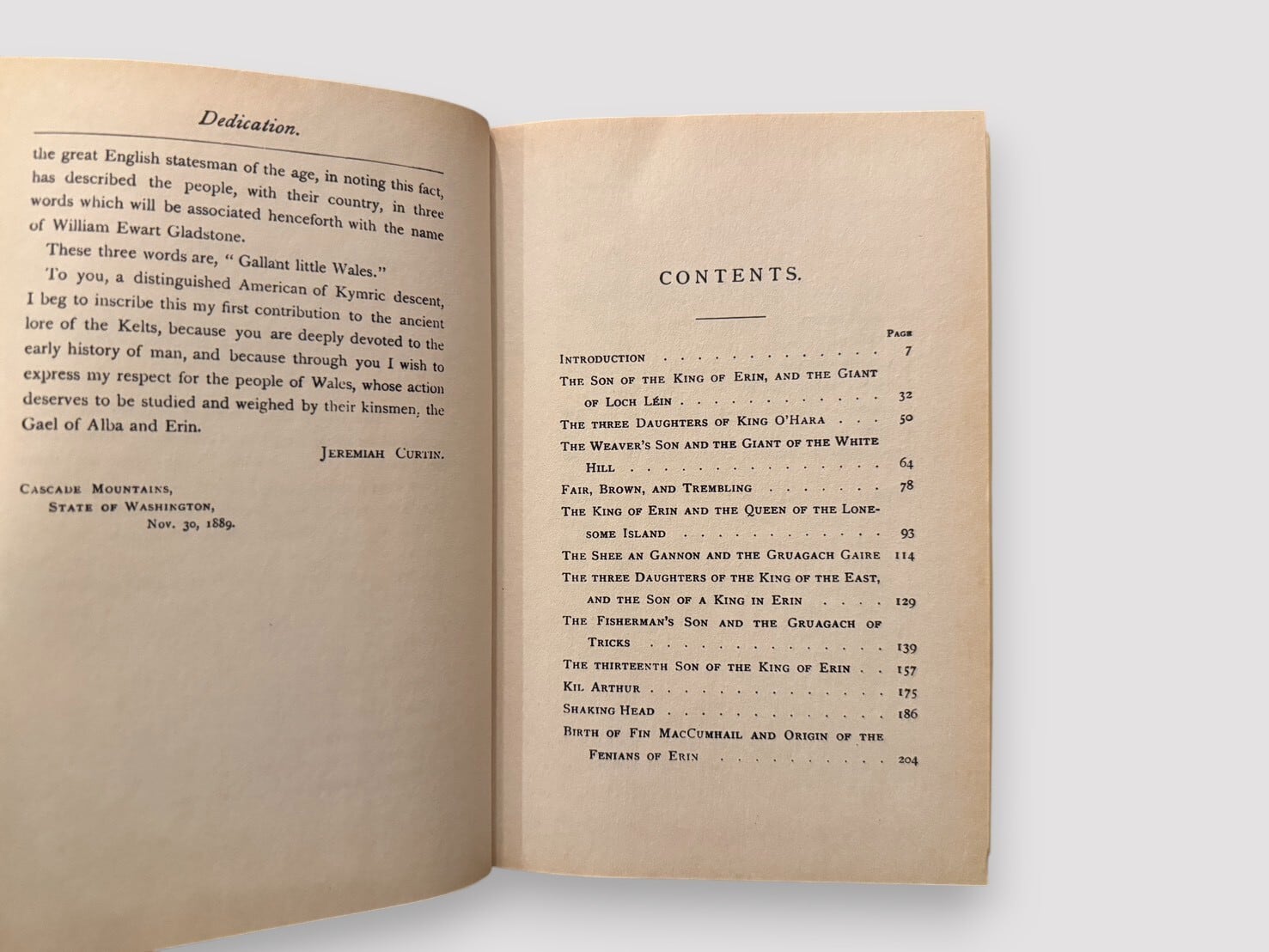 アイルランドの民俗学者ジェレマイア・カーティン(1835–1906)による代表的民話集。著者が19世紀後半にアイルランド西部で採集した口承伝承をもとに、神話・英雄譚・妖精譚を生き生きと英訳。古代ケルトの信仰や世界観が息づく20篇の物語が収められている。Wings Books版(1996)は、原書の構成と本文を忠実に再現した一冊で、ケルト民俗研究・文学研究双方において不朽の古典とされる。