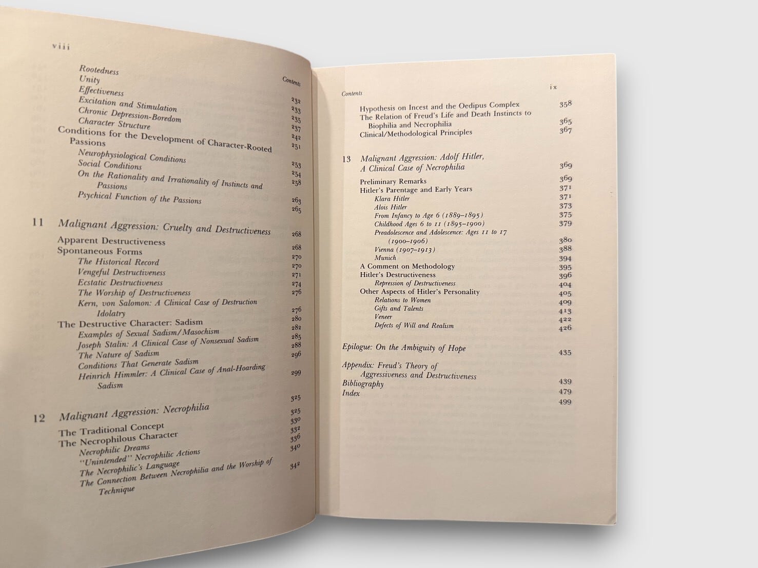社会心理学者エーリッヒ・フロムが、人間の「破壊性」とは何かを探った代表的著作『人間における破壊性の解剖』。フロイトの“死の本能”説を批判し、人間の内部に潜む二つの志向――生への愛(biophilia)と死への愛(necrophilia)――の対立として、暴力や残虐性の根源を理論化する。精神分析、神経生理学、動物行動学、人類学など多分野を横断しながら、「善悪」「愛と憎しみ」「創造と破壊」という人間存在の二面性を哲学的に描き出す。ナチズムの独裁者たちを例に「悪の構造」を心理学的に読み解き、20世紀思想の金字塔として読み継がれている1冊。1973年初版。
