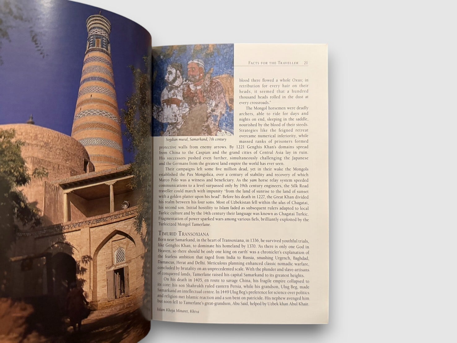 中央アジアの心臓部ウズベキスタン。古代シルクロードの要衝として栄えたサマルカンド、ブハラ、ヒヴァの街々を、文化史と現地の息づかいの中で描き出す写真紀行。歴史・建築・宗教・遊牧民の伝統など多彩なテーマを扱いながら、黄金に輝くタイルと青のモザイクに彩られた東方の古都を鮮やかに再現。豊富な写真と解説により、現地文化と歴史を学びたい旅人、研究者にも愛される定番の一冊。2017年改訂版。
