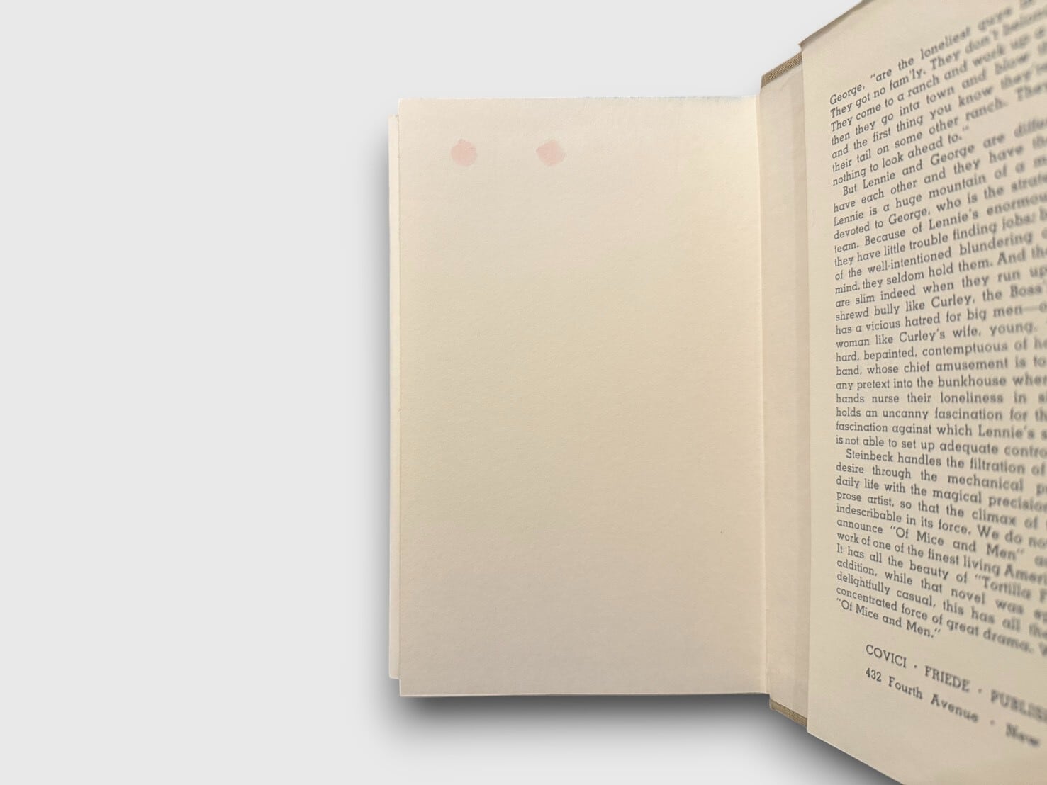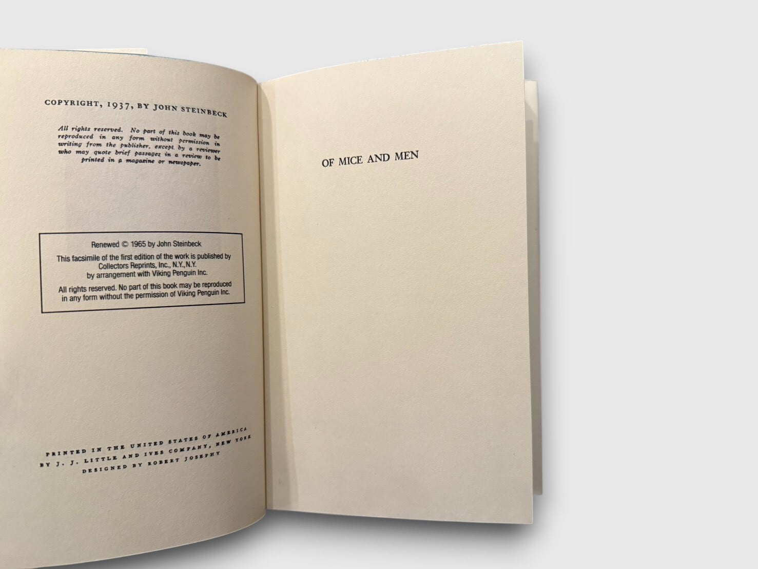 1937年にニューヨークのCovici Friede社より初版刊行された、ジョン・スタインベックの代表作『二十日鼠と人間』ファクシミリ復刻版。アメリカ大恐慌下のカリフォルニアを舞台に、貧しい農場労働者ジョージとレニーの友情、夢、そして喪失を描く名作である。本書はCollectors Reprints Inc. により、初版の装丁・タイポグラフィ・レイアウトを忠実に再現した特別版。