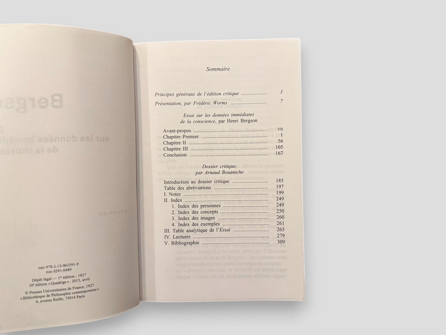フランスの哲学者アンリ・ベルクソンによる記念すべき処女作『意識に直接与えられたものについての試論』批判校訂版。時間を「量」ではなく「質」として捉える独自の時間概念「持続(durée)」を提示し、意識の流れと自由意志の関係をめぐって、近代哲学に新しい地平を開いた名著。本書はフレデリック・ウォルムス監修による校訂版で、アルノー・ボアニシュによる批判的資料集(Dossier critique)を併載。ベルクソン哲学の原点をたどるうえで欠かせない研究版となっている。
