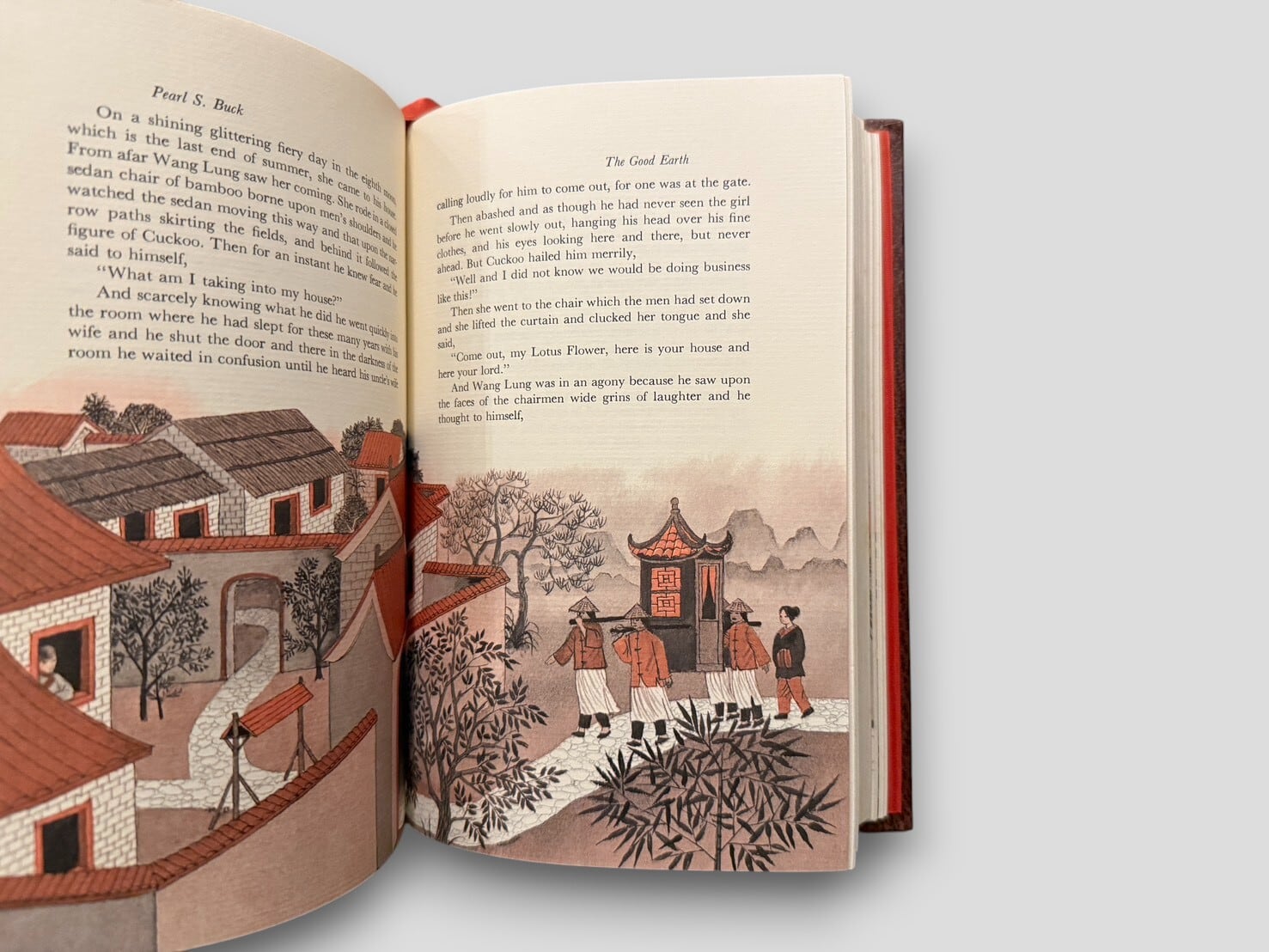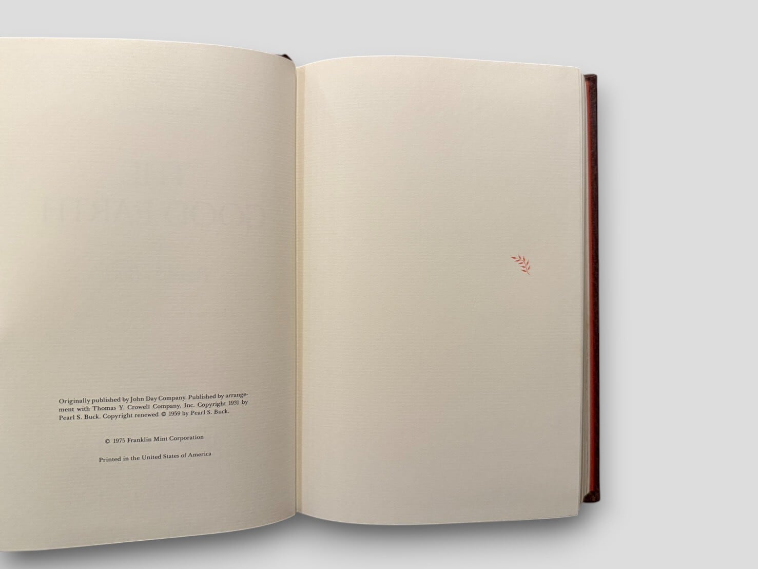 アメリカ人作家パール・S・バック(1892–1973)が中国の農民の生活を描いたピューリッツァー賞受賞作『大地』。アジア文化への深い理解と人間の普遍的な尊厳へのまなざしをもって、土地とともに生きる一家の興亡を壮大に描き上げた。1938年にはノーベル文学賞受賞の決定的要因ともなった作品である。1975年にフランクリン・ライブラリーより刊行された限定版。アメリカ文学と書物芸術の双方を代表する、時を超えて愛される名作。