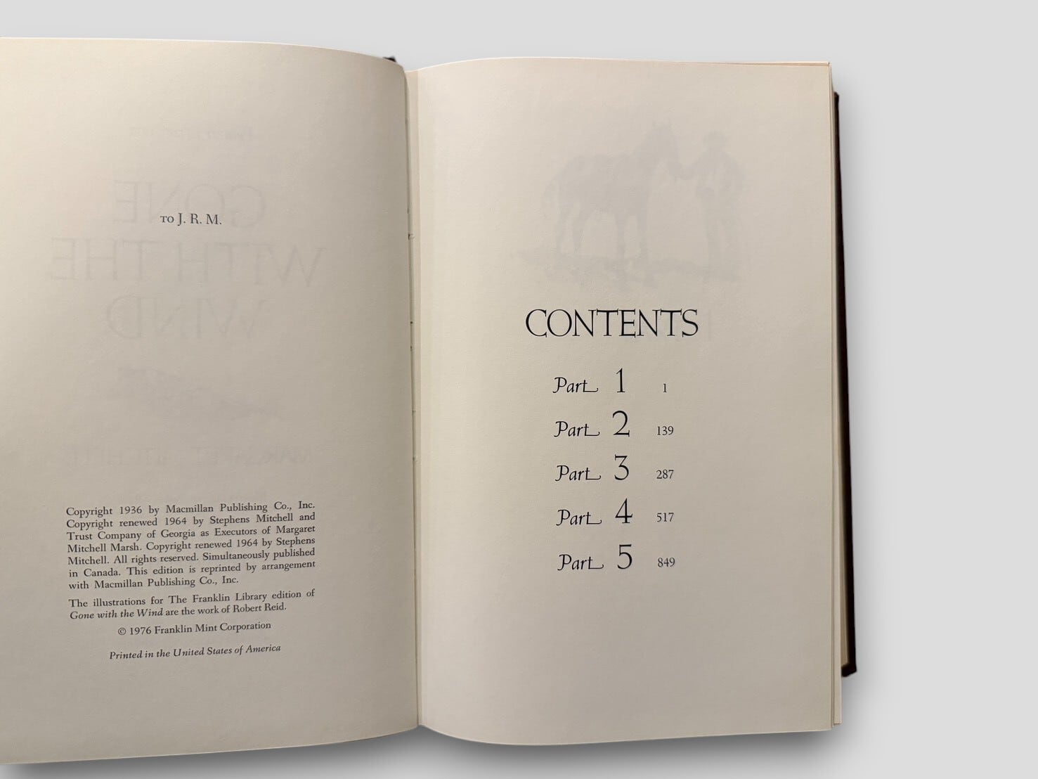アメリカ文学史上に燦然と輝く不朽の名作『風と共に去りぬ』。南北戦争とその復興期を背景に、激動の時代をたくましく生き抜く女性スカーレット・オハラの愛と喪失を描いた壮大な物語である。刊行翌年である1937年にはピューリッツァー賞を受賞し、世界的なベストセラーとなった。本書は1976年、フランクリン・ライブラリーより刊行された豪華限定版。挿絵はアメリカの画家ロバート・リードによるもので、作品世界の壮大さと人間の激情を繊細に描き出している。