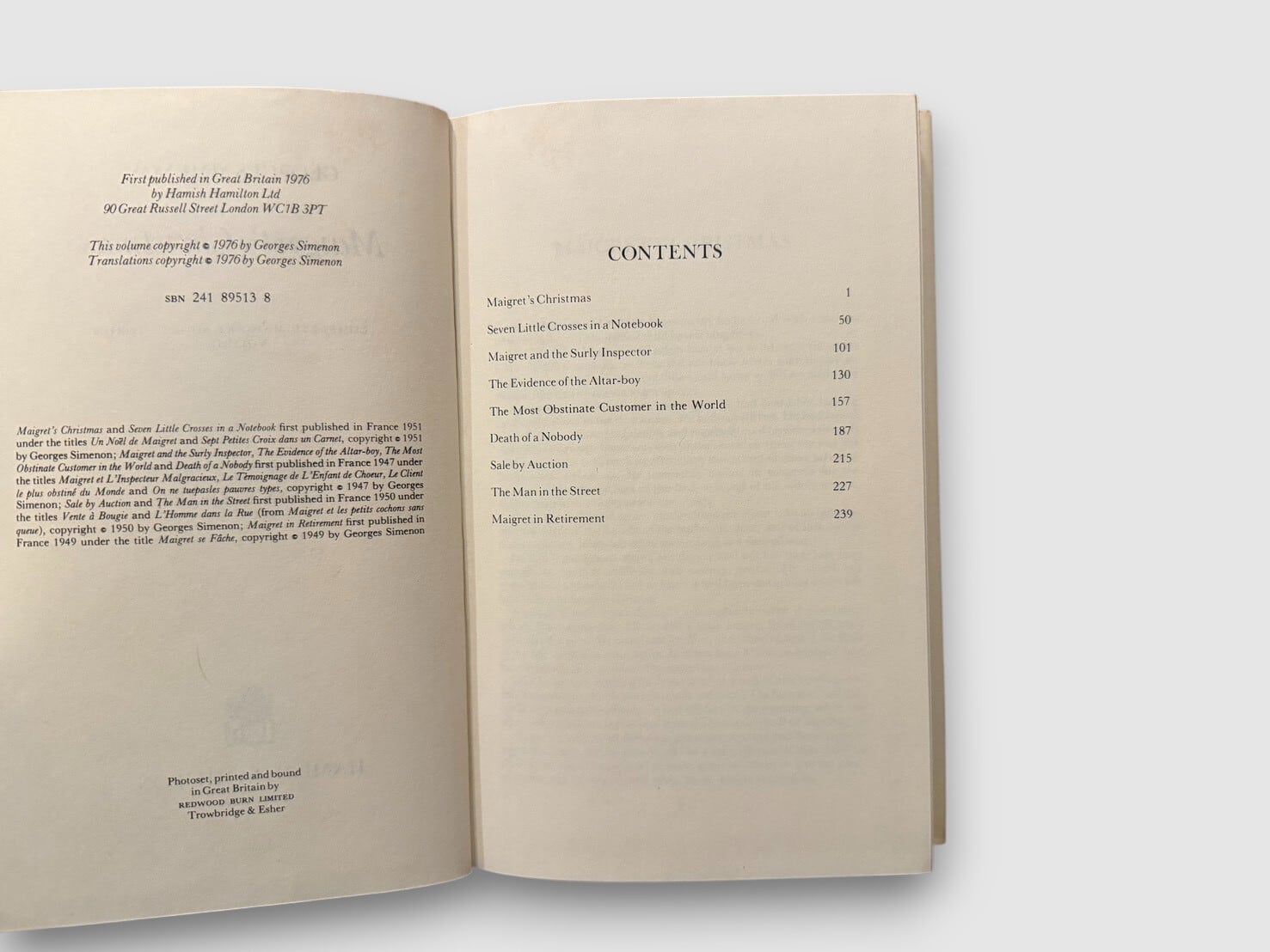 ベルギー出身の作家ジョルジュ・シムノンによる、警視メグレを主人公とした短篇集。本書は “Complete Maigret Short Stories Volume I” にあたり、シリーズ中でも特に人間味あふれるエピソードを収めている。表題作「Maigret’s Christmas」をはじめ、「Seven Little Crosses in a Notebook」「The Evidence of the Altar-boy」「Maigret in Retirement」などを収録。犯罪や謎解きにとどまらず、人生の静けさと孤独、そして人間の温もりを描く短篇群であり、Hamish Hamilton社による1970年代の英国初版らしい重厚な装幀も魅力的な1冊。