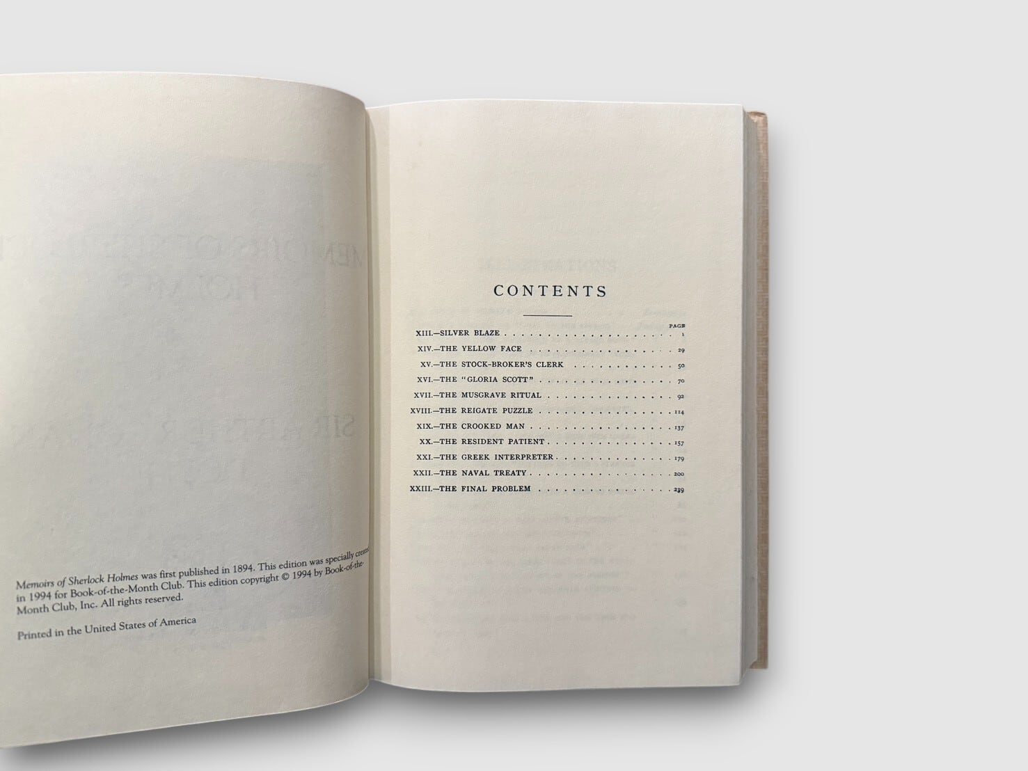 アーサー・コナン・ドイルによるシャーロック・ホームズ・シリーズ第5作『シャーロック・ホームズの思い出』。1894年に初版が刊行された短編集で、「最後の事件(The Final Problem)」を含む全11篇を収録。本書は1994年にBook-of-the-Month Clubより刊行された特別版。ヴィクトリア朝探偵小説の雰囲気を現代に伝える、上質なクラブ会員向けリイシューである。