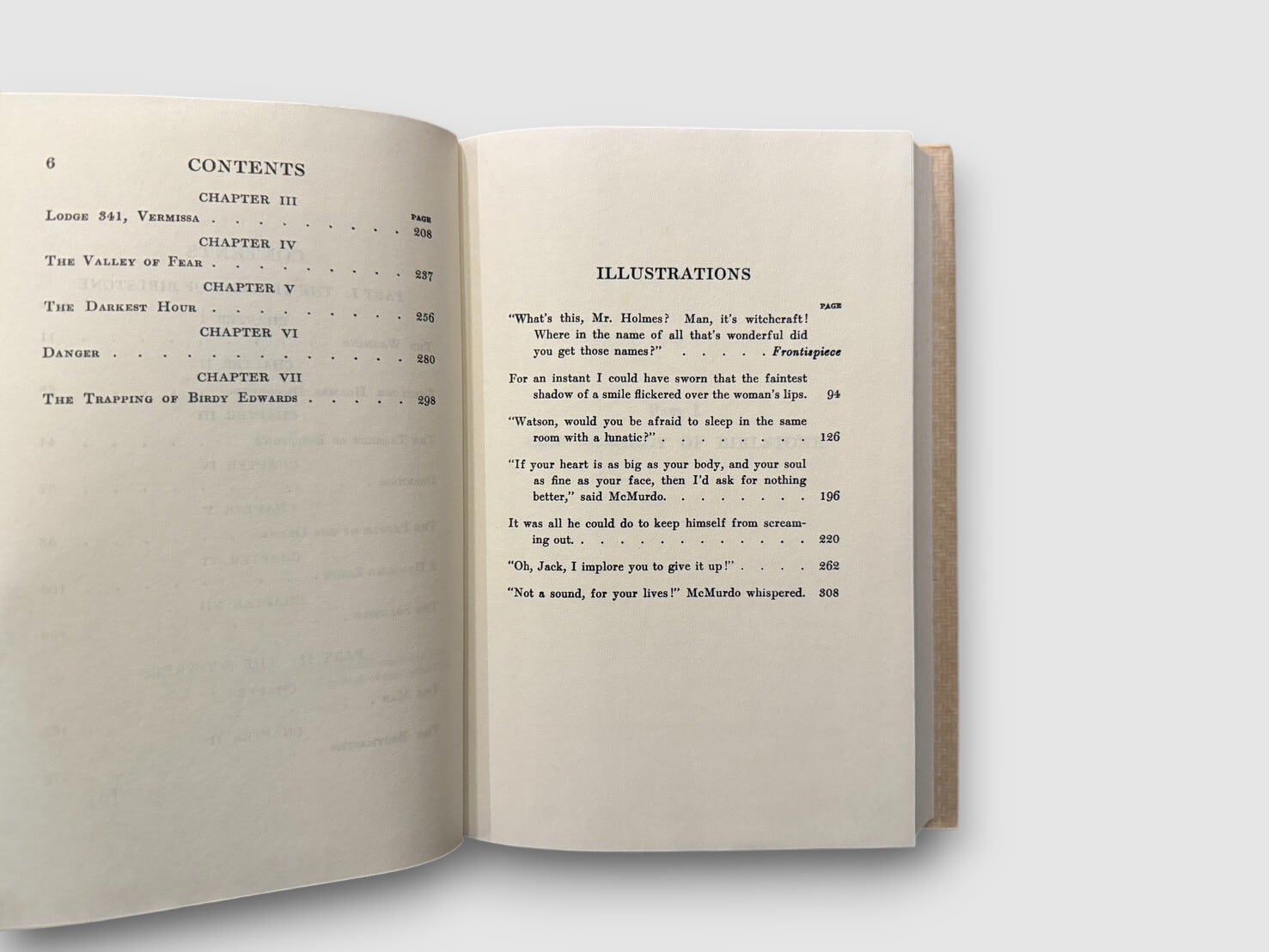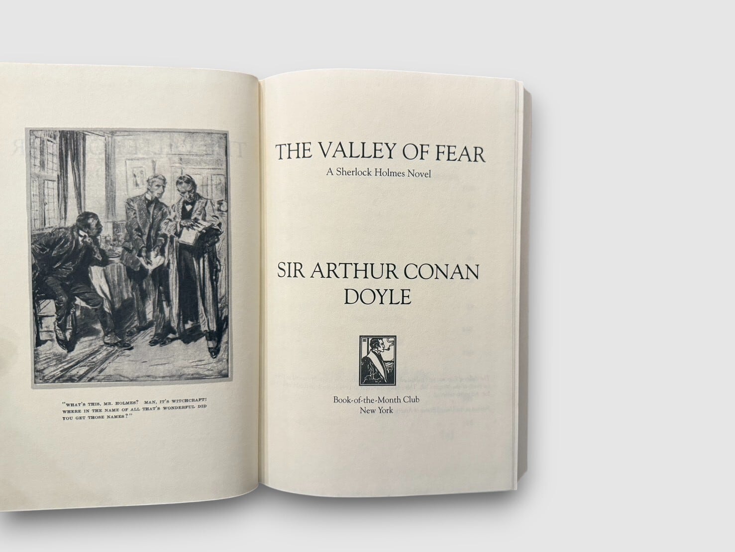 アーサー・コナン・ドイルによるシャーロック・ホームズ最後の長編小説『恐怖の谷』。1915年に初版刊行された本作は、ホームズとワトスンが再び凶悪な犯罪に挑む壮大な物語で、前半は英国の田園屋敷での密室殺人事件、後半はアメリカの秘密結社を描く二部構成のスリリングな展開が特徴である。社会的主題と緻密な推理が見事に交錯するこの作品は、ホームズ・シリーズの中でも異色かつ重厚な印象を残す一冊として知られている。本書は1994年にBook-of-the-Month Clubが刊行したクラブ会員向け特別版。当時の雑誌連載版を想起させる雰囲気を再現している魅力的な1冊。