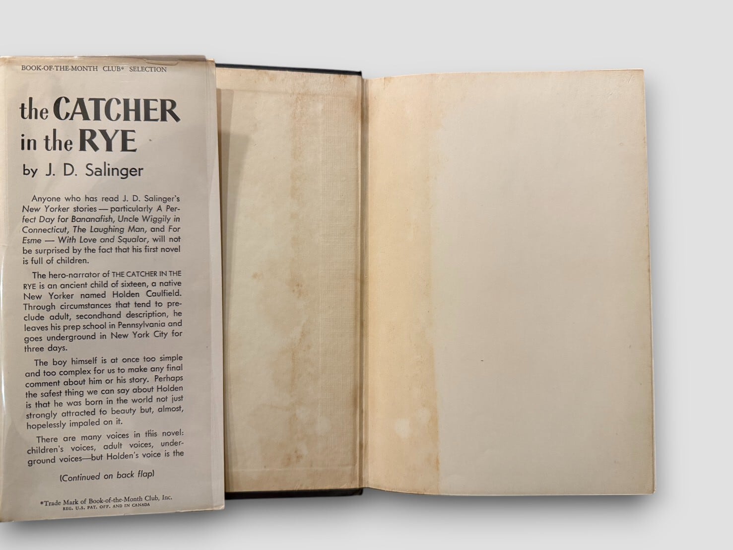 J・D・サリンジャーによる戦後アメリカ文学を代表する青春小説『ライ麦畑でつかまえて』。孤独と反抗の象徴ホールデン・コールフィールドを主人公に、16歳の少年が体験する都会の彷徨と自己喪失、そして未成熟な純粋さの輝きを描いた。1951年の刊行直後から熱狂的な支持を得て、いまもなお青春文学の古典として読み継がれている名作。本書は初版と同年に刊行されたBook-of-the-Month Club向けリプリント版。初期刷特有のデザイン要素を保つ、文学史的にも価値の高い貴重な1冊。
