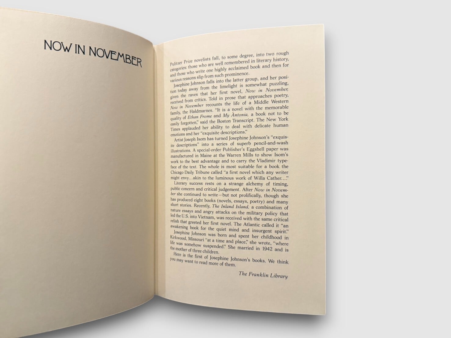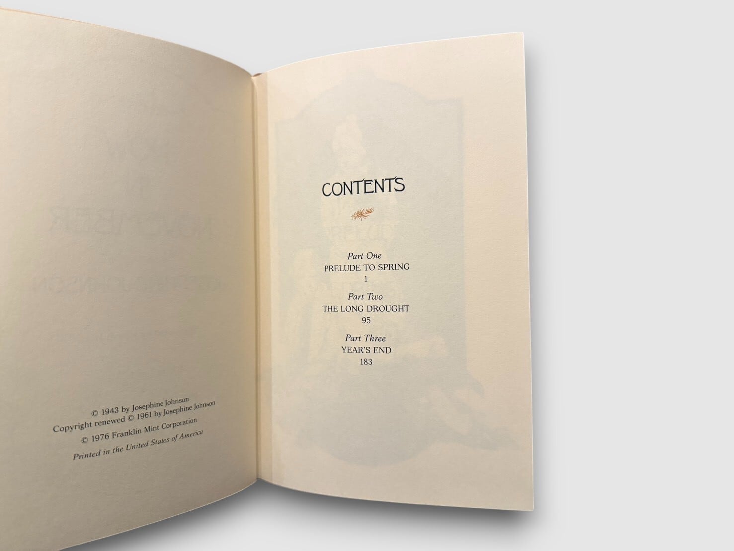 アメリカの作家ジョセフィン・ジョンソンによる長編小説『十一月の今』。アメリカ中西部の農村を舞台に、自然と人間、家族、貧困、そして精神的成長を静謐な筆致で描いた作品である。ジョンソンは本作によって1935年のピューリッツァー賞(小説部門)を最年少で受賞した。本書は1976年にThe Franklin Libraryより刊行された限定特装版。