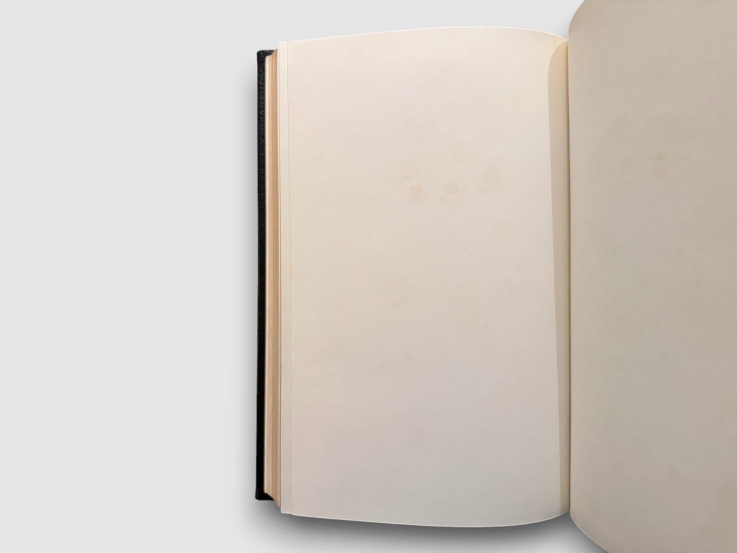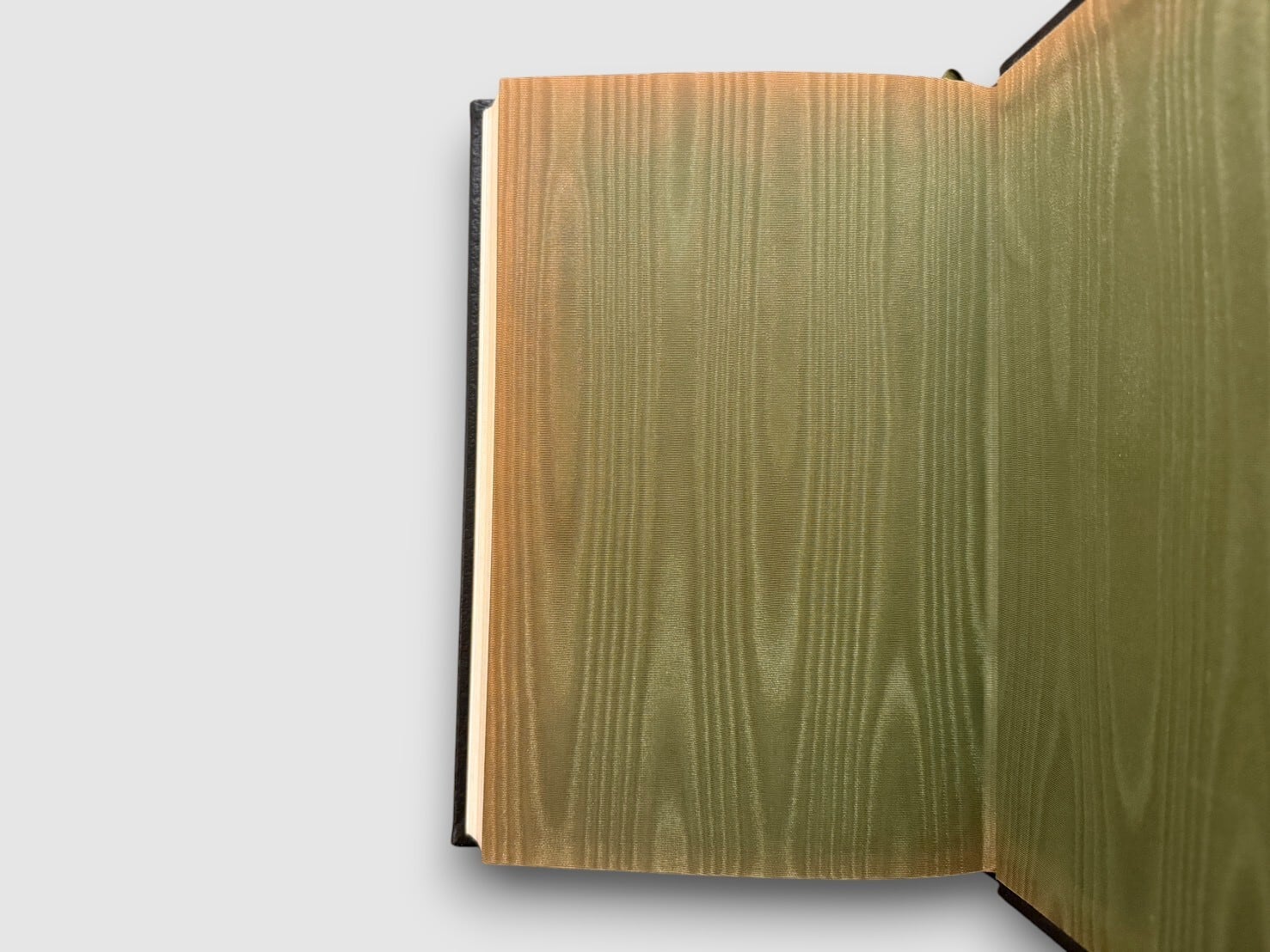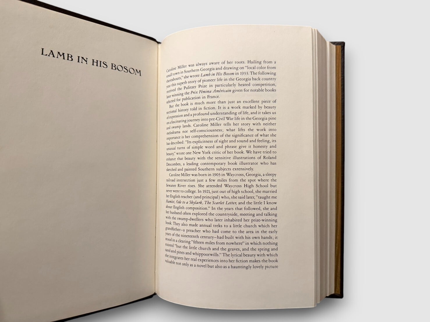 アメリカ南部ジョージア州出身の作家キャロライン・ミラーによる長編小説『胸に抱ける仔羊』(1933)は、南北戦争以前の農村を舞台に、女性の成長と家族の営みを詩的に描いた作品である。翌1934年、ピューリッツァー賞(小説部門)を受賞し、同年“Prix Femina Américain”にもノミネートされた。南部文学の潮流の中で、地域的リアリズムの代表作として評価されている。本書は1978年にThe Franklin Libraryより刊行された限定特装版。深いエンボス装飾と美しいガラモンド書体が、物語の静かな詩情をいっそう引き立てる仕上がりである。