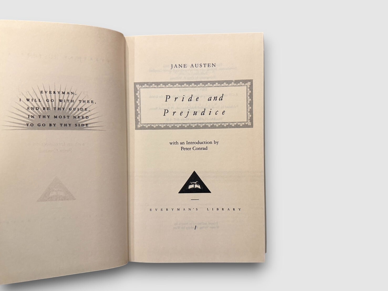 ジェイン・オースティンの代表作『高慢と偏見』。19世紀初頭のイギリスを舞台に、才気あふれるエリザベス・ベネットと傲慢な貴族ダーシー氏の恋愛を描く。社会階級、結婚観、そして人間の誇りと偏見を軽やかなユーモアと鋭い洞察で描き出した英国文学の古典である。本書は1991年に刊行されたEveryman’s Library版で、Peter Conradによる序文を収録。シンプルで上品な装丁が、長く読み継がれる名作にふさわしい一冊となっている。