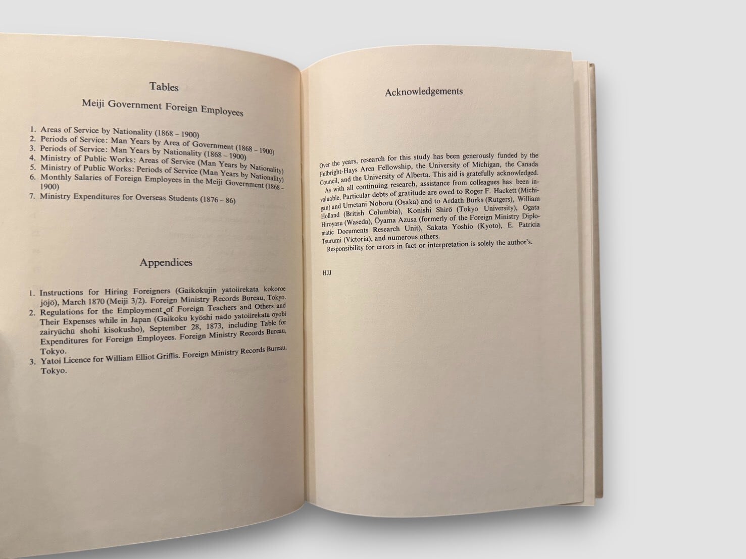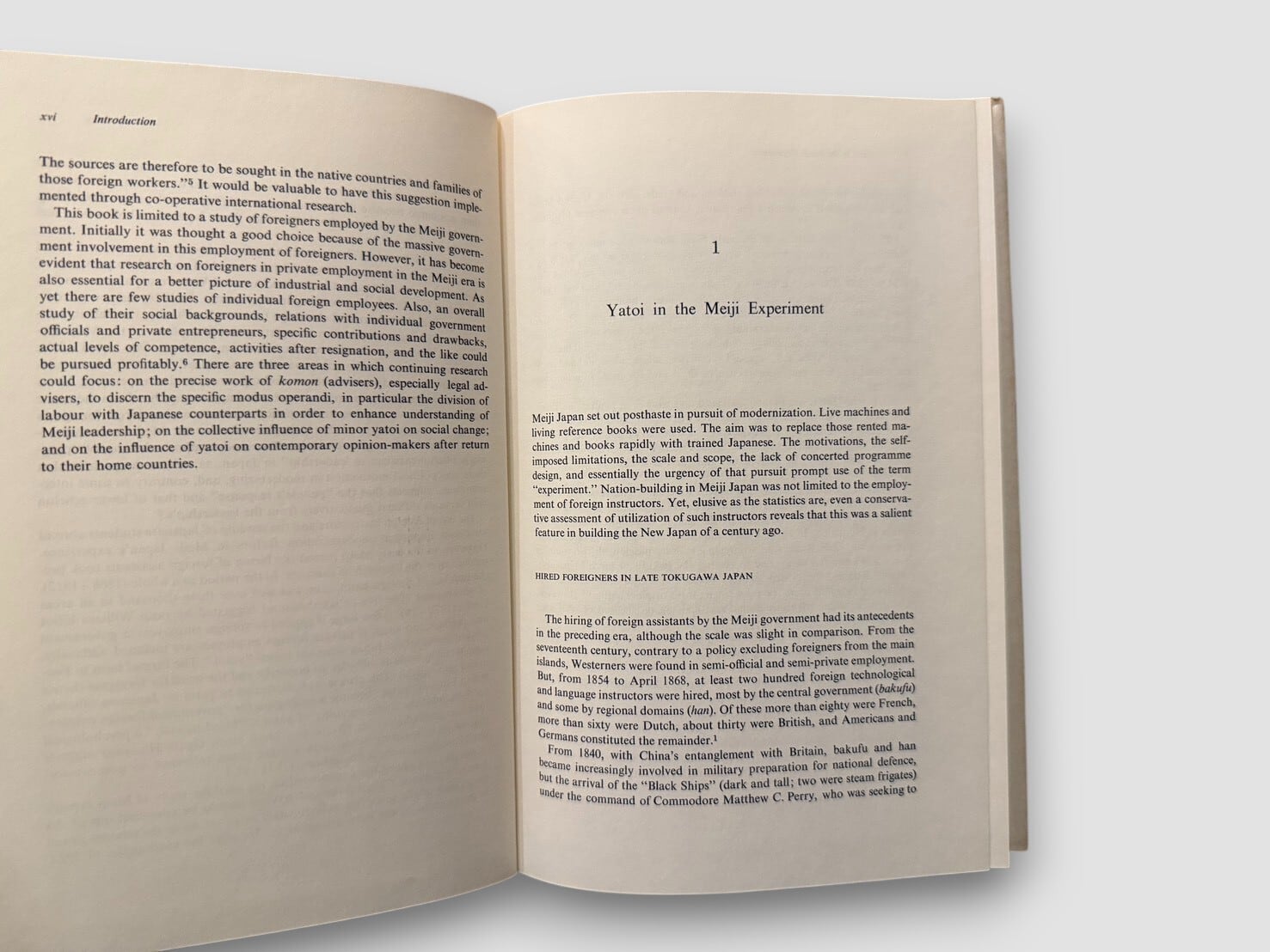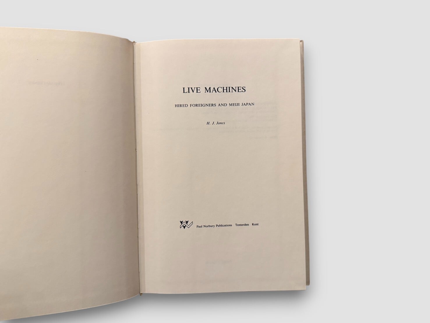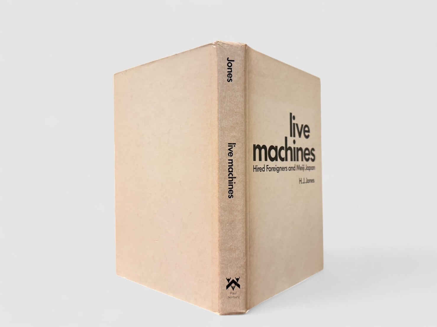 明治日本における「お雇い外国人(yatoi)」制度を多角的に検証した重要研究書。。著者H. J. Jonesは、政府が近代化のために雇用した数千人におよぶ外国人専門家たちの実態を、統計資料と外交文書をもとに詳細に分析している。本書が描くのは、近代国家を築こうとする日本の壮大な試みと、そこに関わった「生きた機械(live machines)」と呼ばれた人々の姿である。経済・技術・教育・外交など多分野におよぶ外国人雇用の実像を通じて、明治維新の裏にあった国際的ネットワークと文化的摩擦を浮かび上がらせている。シンプルな造本と硬質な学術的筆致ながら、ページの奥には「文明開化」の熱を伝える生々しい息づかいが感じられる一冊。1980年刊行初版。