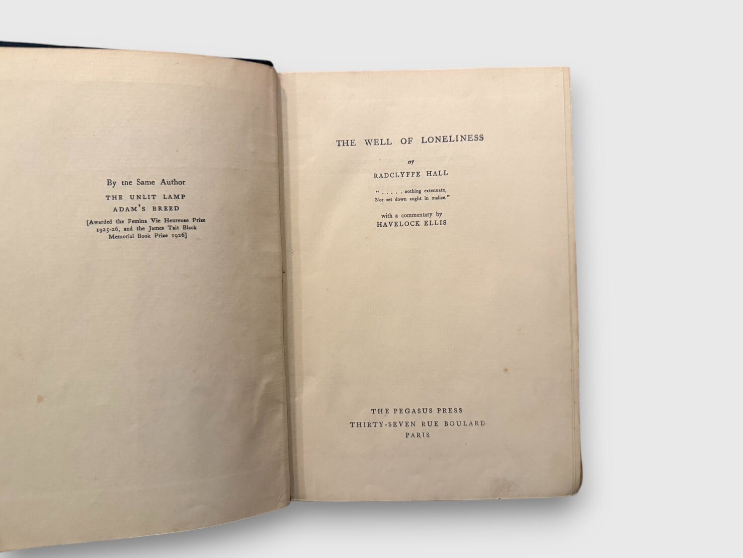英国作家ラドクリフ・ホールによる代表作にして、文学史上最も議論を呼んだ小説のひとつとされる『孤独の井戸』。第一次大戦後のイギリス社会を舞台に、生まれながらにして「他者」であることを背負った主人公スティーヴン・ゴードンの孤独と自己受容を描く。その文学的勇気と誠実な人間描写は、今日もなおジェンダーと自己の在り方を問う古典として読み継がれている。1928年、Jonathan Cape版として刊行されるも、「不道徳」な内容として発禁裁判にかけられた。その後、自由な出版を求めてThe Pegasus Press(パリ)版が同年9月に再発行され、国外から文学的自由の象徴として広く読まれることとなった。本書はその貴重なパリ版。1928年刊行。