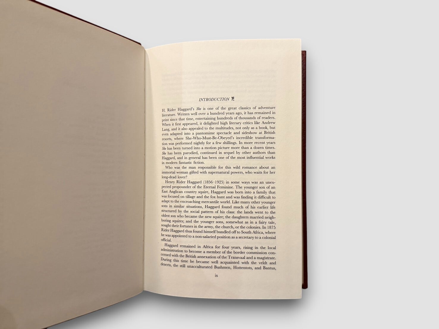 H.ライダー・ハガードによる冒険幻想文学の金字塔『シー』。1886年初版の本作は、永遠の女性をめぐる神秘と探検を描いたヴィクトリア朝文学の代表作であり、後のファンタジーやSF作品にも多大な影響を与えた。本書は1992年にThe Easton Pressより刊行された豪華革装版。ヴィクトリア期の冒険譚と神秘思想が交錯する不朽の名作である。