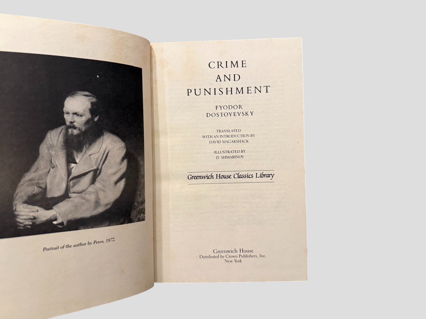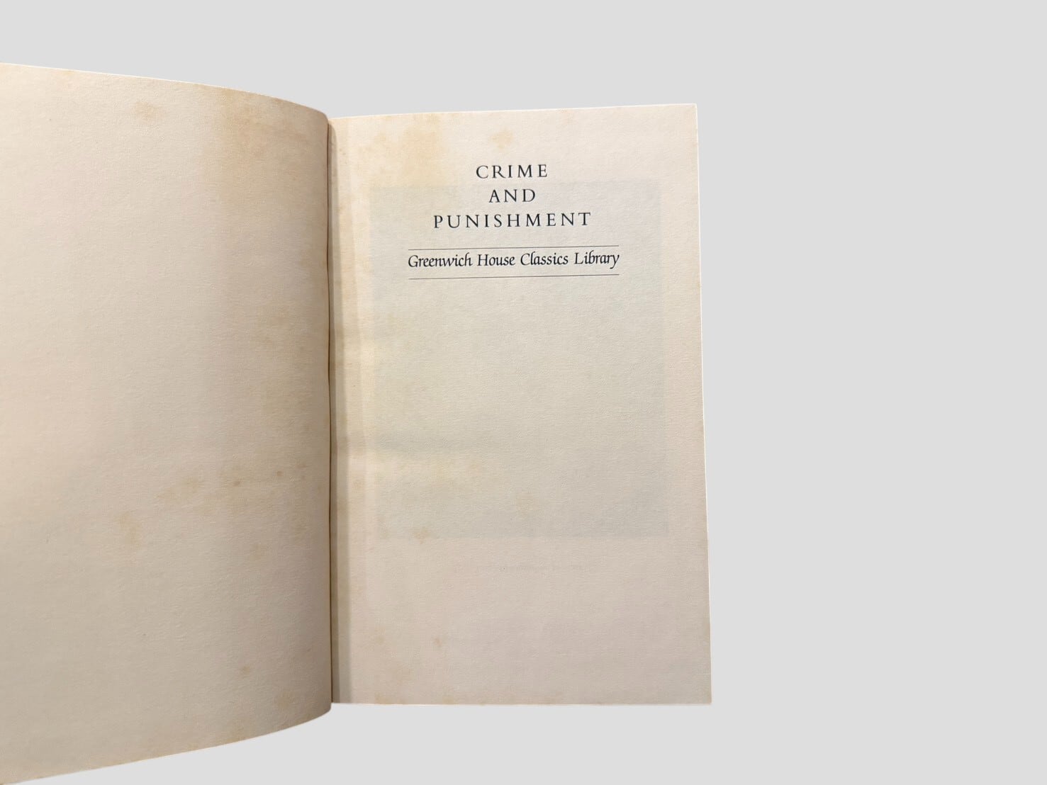 ロシア文学の巨匠フョードル・ドストエフスキーによる代表作『罪と罰』の英訳版。本書はGreenwich House Classics Libraryシリーズの一冊として1982年に刊行されたエディションである。ラスコーリニコフの罪と贖罪を通して、道徳・信仰・人間存在の深淵を描き出したこの長編は、世界文学史上における永遠の古典として読み継がれている。挿絵入りの装幀は重厚で、書棚にも映える一冊。