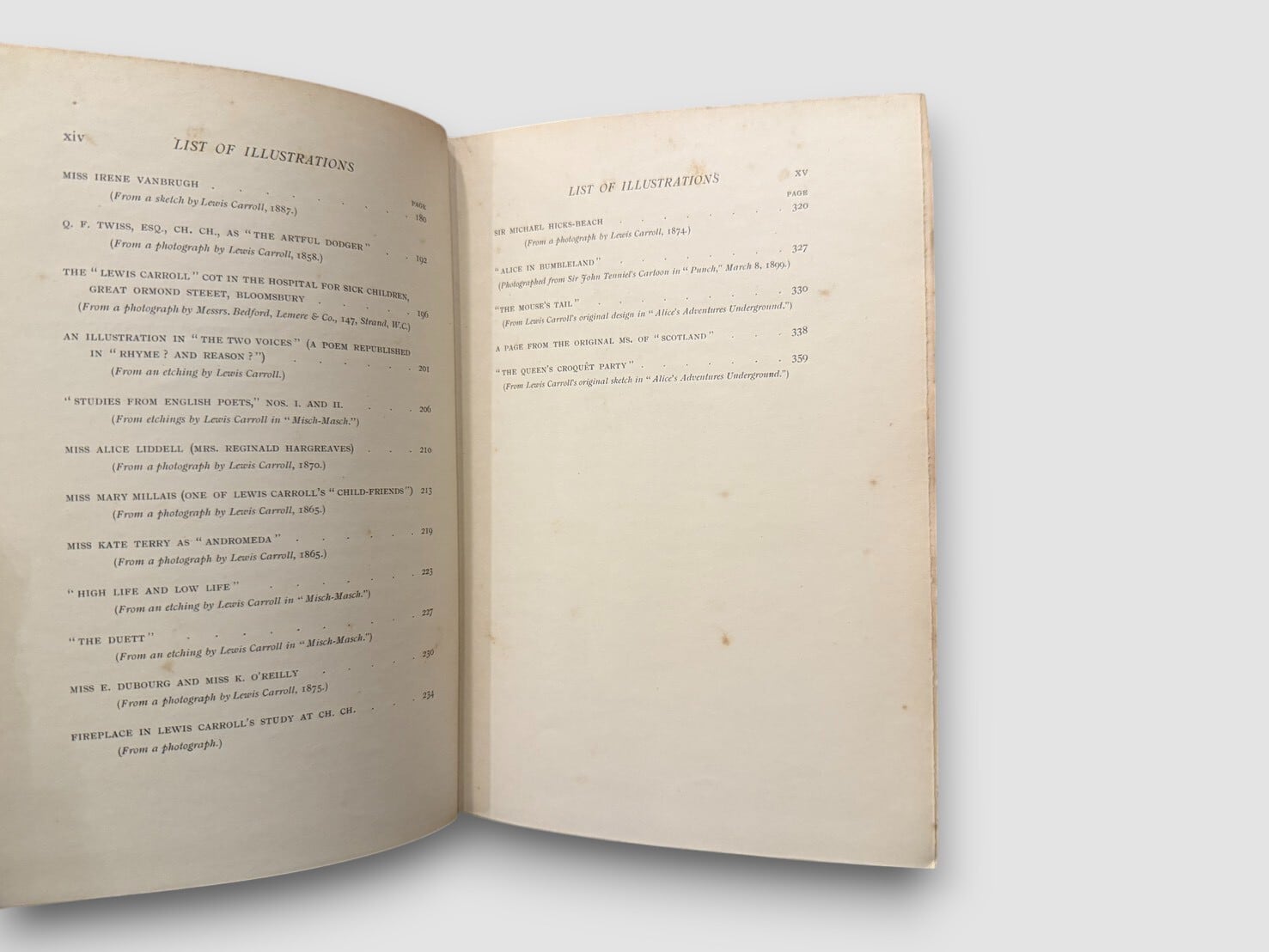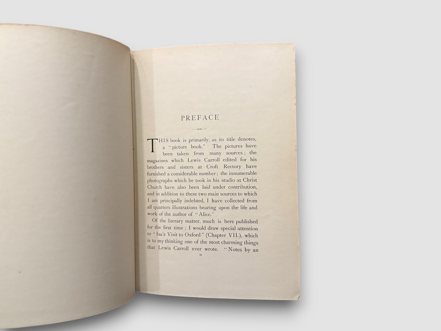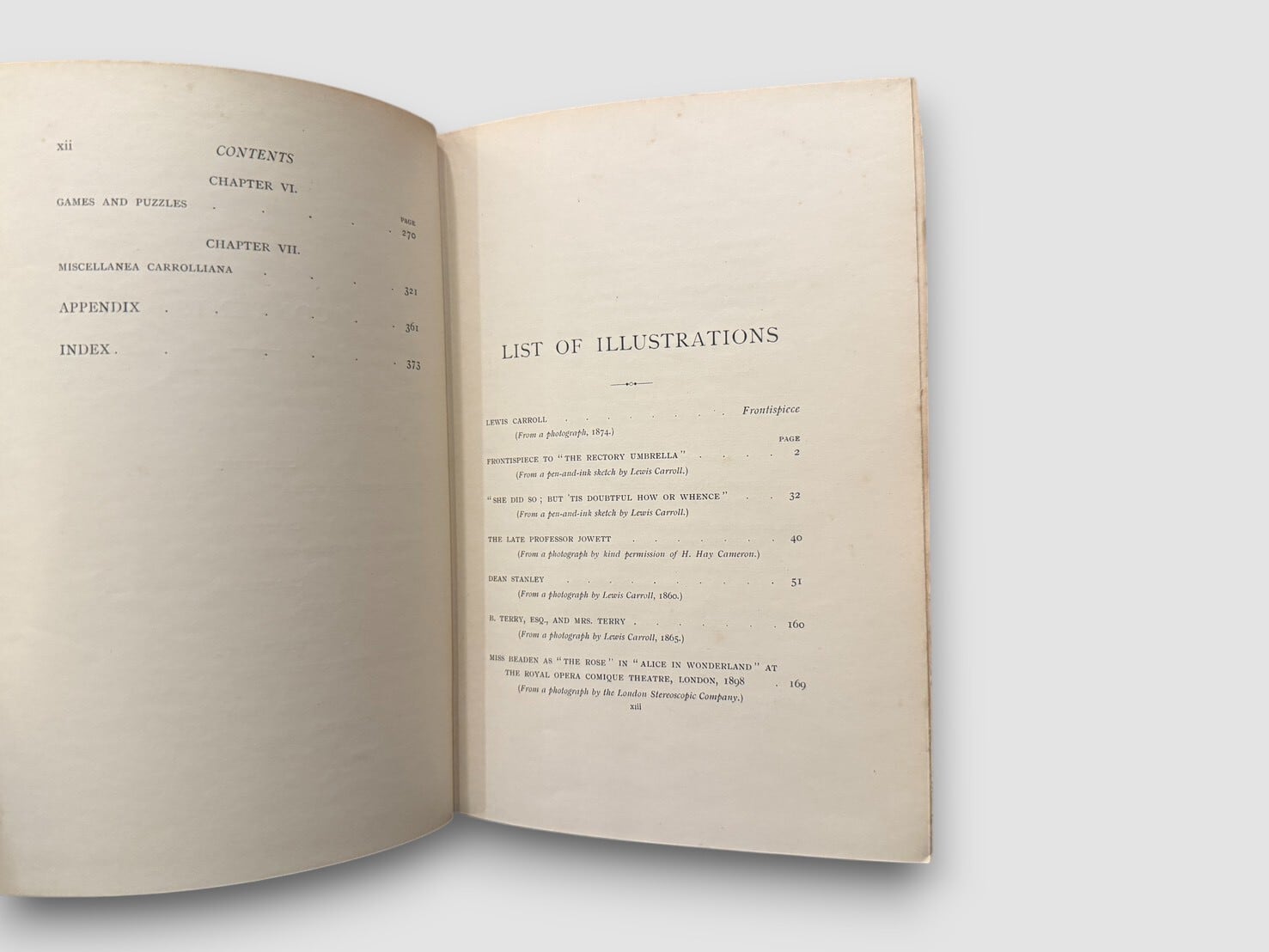 『不思議の国のアリス』の作者ルイス・キャロルの未発表原稿、詩、書簡、スケッチ、そして自身が撮影した写真をまとめた貴重な資料集。編集を手がけたのは甥のスチュアート・ドジソン・コリングウッドで、キャロル研究の中心人物として知られる。本書には、キャロルが親しく交流した人物たちの肖像を含む挿絵や写真が多数収録され、彼の文学的・芸術的世界を視覚的に辿ることができる。赤布装に金箔押しのグリフィンとマーチヘアを配した美装版で、19世紀末の英国出版文化を象徴する一冊。1899年刊行初版。
