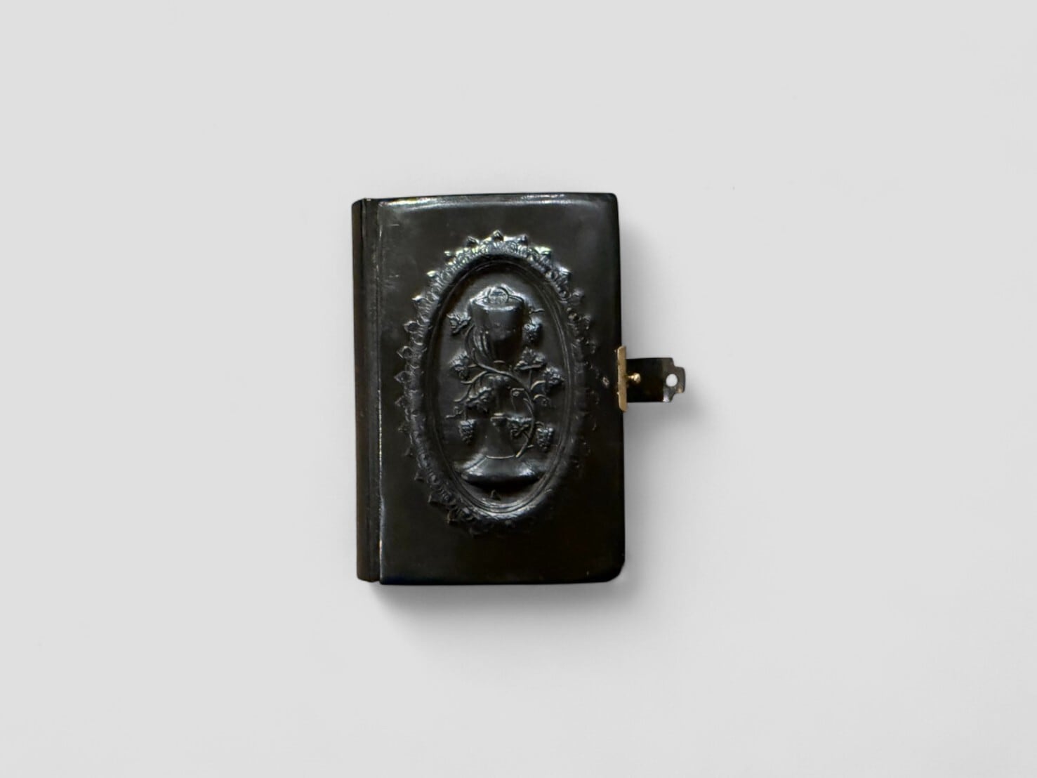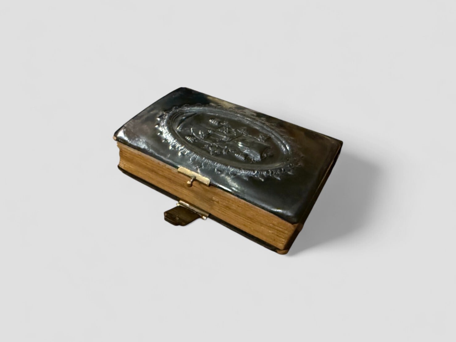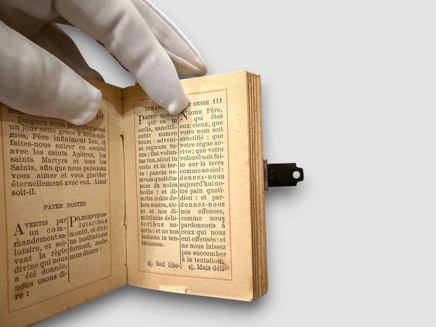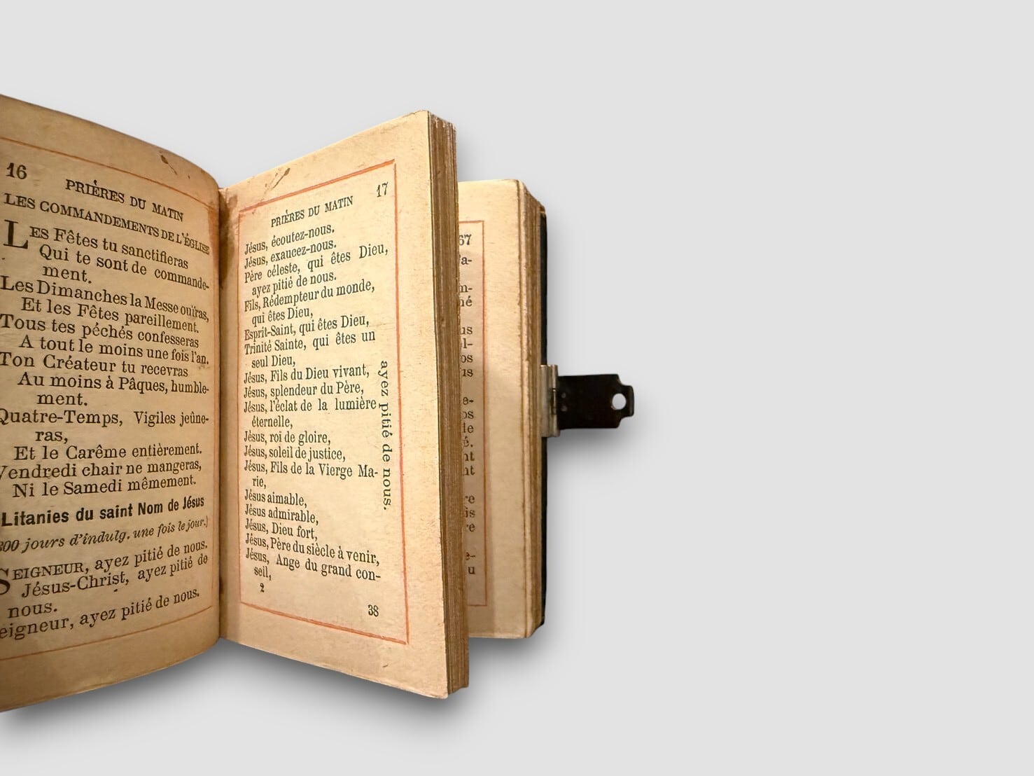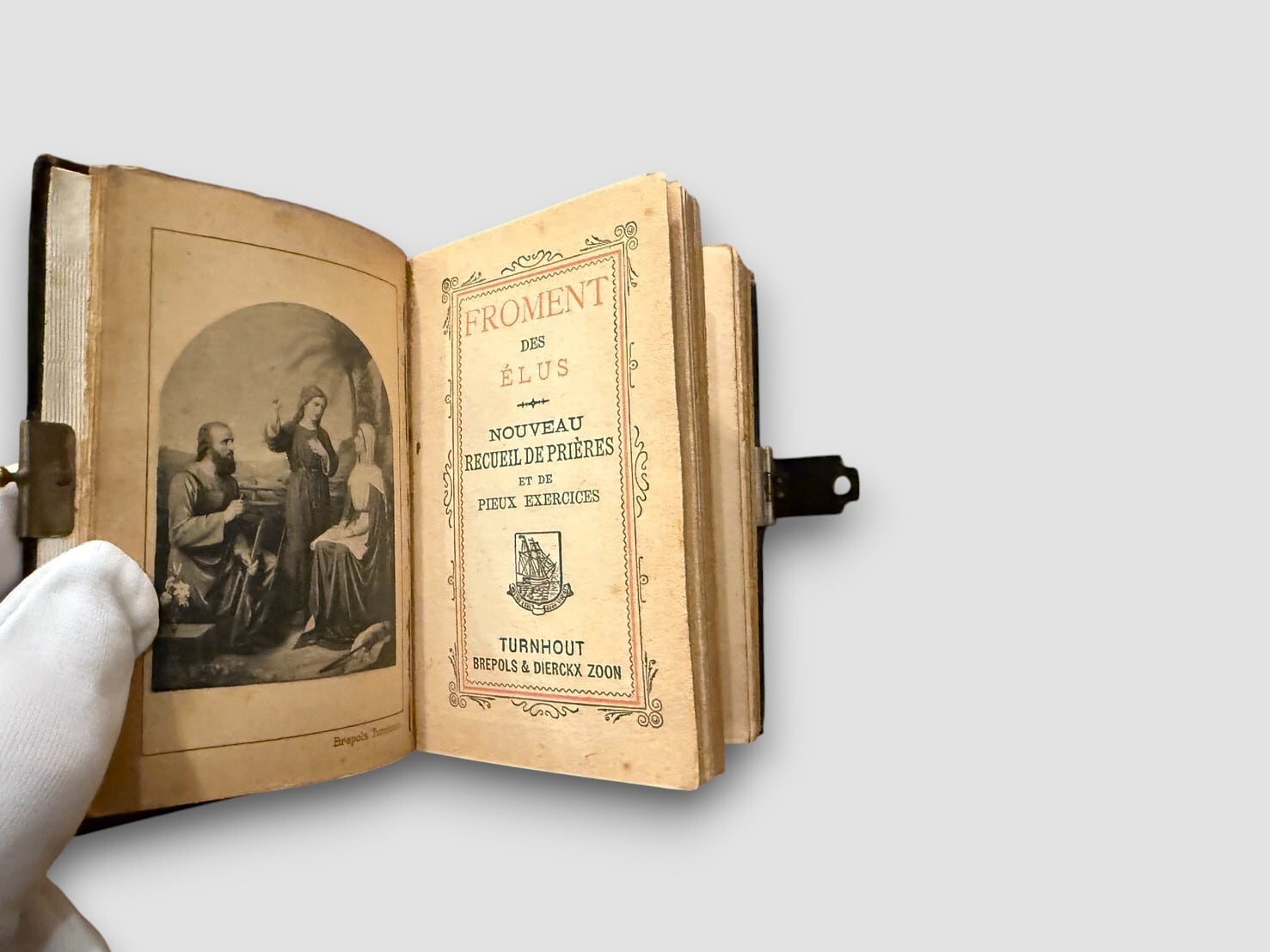 ベルギーの老舗宗教出版社Brepols & Dierckx Zoonより1902年に刊行された、カトリック信徒のための祈祷書『Froment des Élus(選ばれし者の糧)』。日々の祈りや聖人・聖母への祈祷、聖体礼拝、十字架の道行などを収めた小型の信心書で、フランス語圏で長く用いられてきた祈祷集の一つである。堅牢な黒色カバーには宗教的象徴をあしらったレリーフ装飾が施され、金属製の留め具を備えるなど、19世紀末〜20世紀初頭のBrepols社らしい繊細な造本様式が見られる。携帯用サイズのポケット・デヴォーショナル(小祈祷書)として、当時の信仰生活を今に伝える静謐な祈りの書。