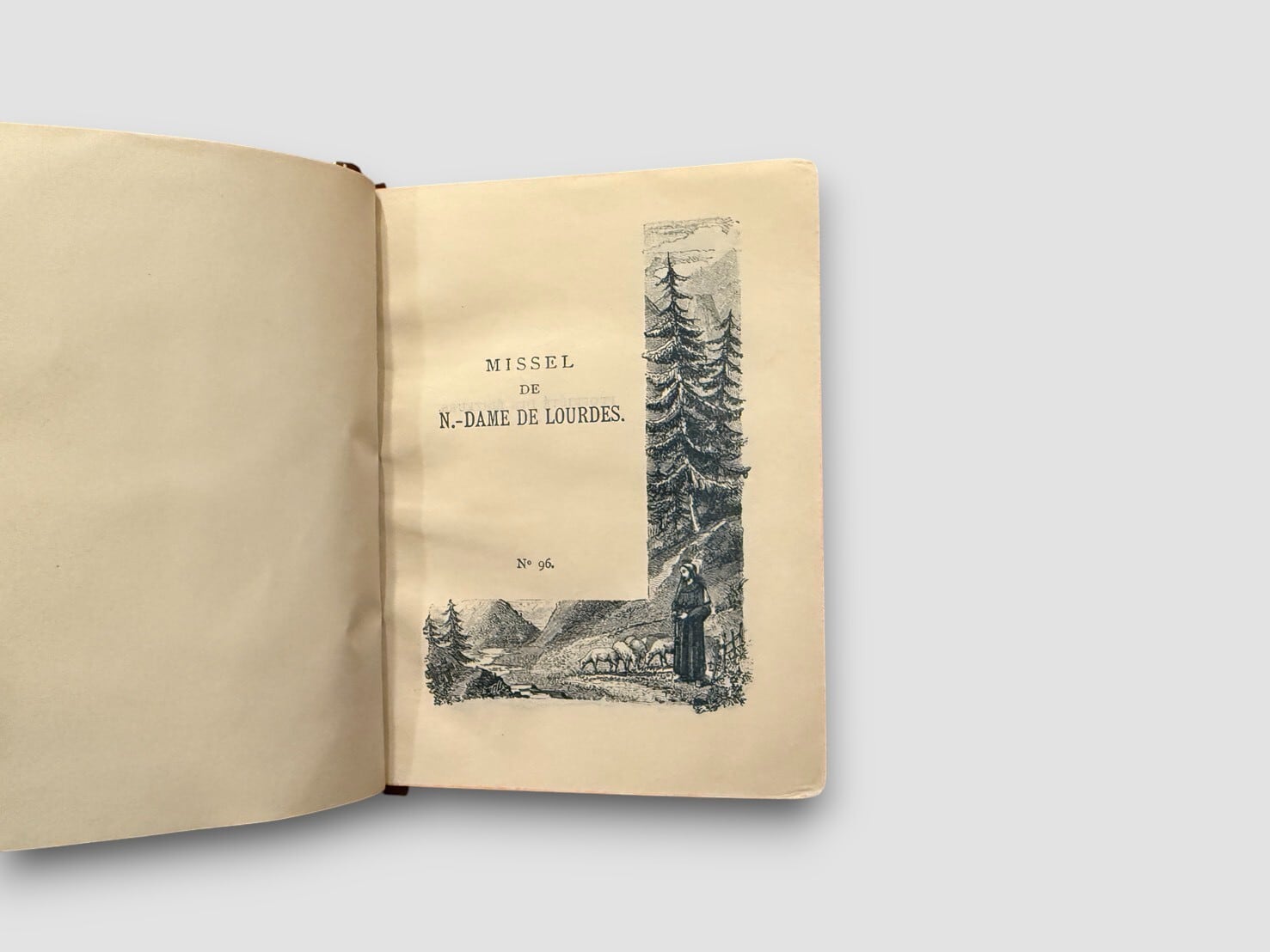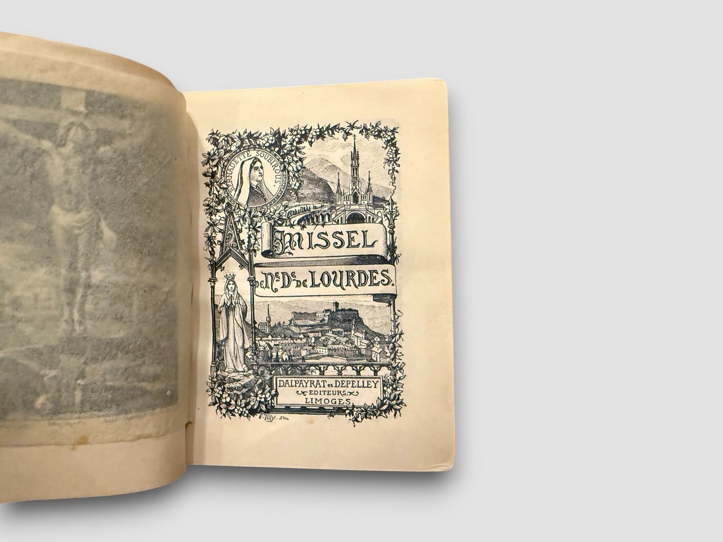 フランス・リモージュの出版社Dalpayrat & Depelleyより、19世紀末から20世紀初頭にかけて刊行されたカトリックのミサ典書『Missel de N.-D. de Lourdes(ルルドの聖母のミサ典書)』。ルルド信仰に基づく祈祷とローマ典礼文を収録し、巡礼者や修道者の個人礼拝に広く用いられた。本文には複数の挿絵によりルルドの聖母や聖ベルナデットの信仰を象徴的に描き出している。本書はリモージュ司教ベンジャマン=ジョゼフス(Benjamin-Josephus, Episcopus Lemovicensis)によるImprimatur(司教認可)を受けた正式な典礼書であり、当時の巡礼文化と信仰生活を伝える。“yapp edges(丸みを帯びた端)”を併せ持つ美しい1冊。