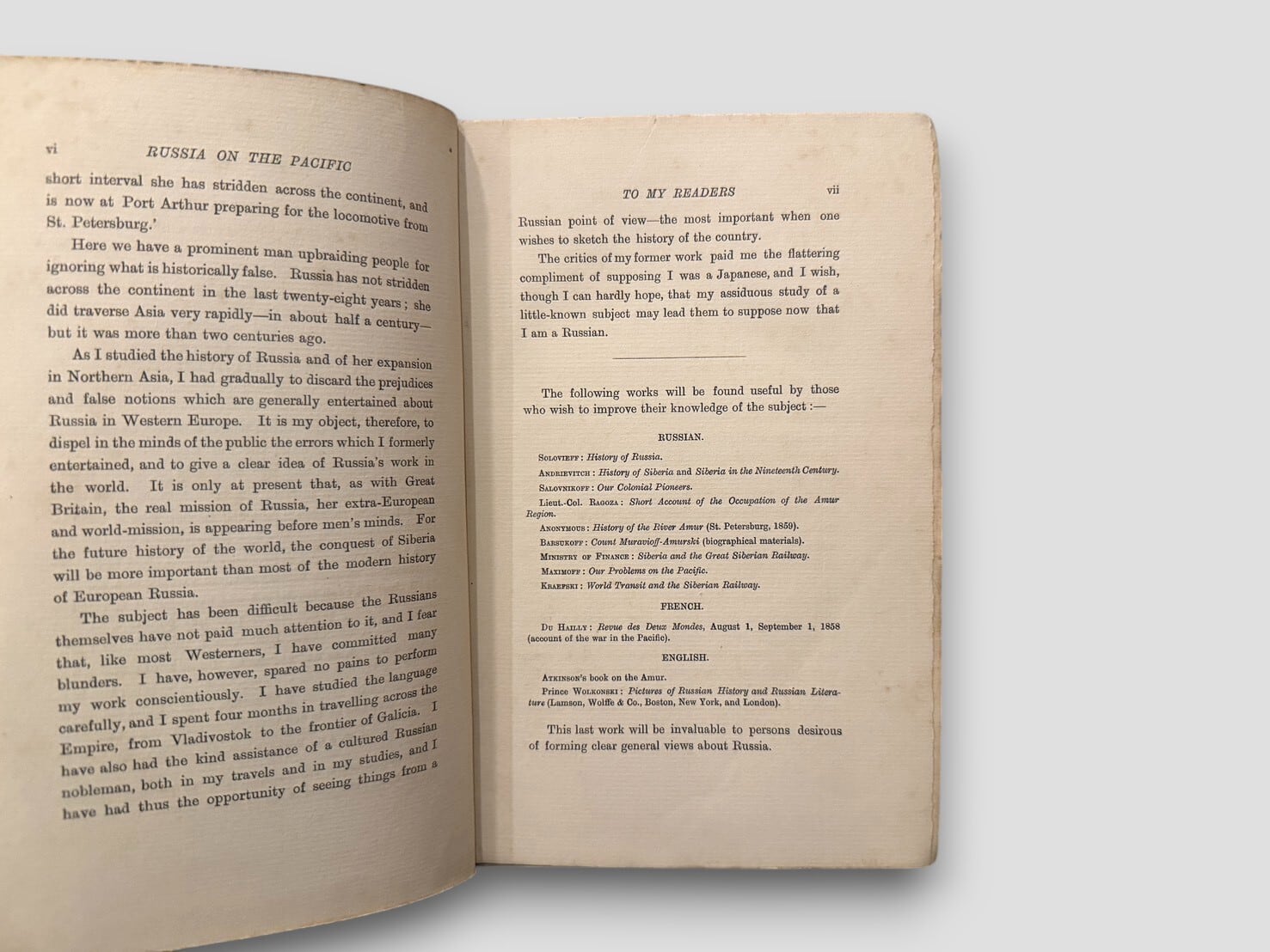 帝政ロシアの極東進出とシベリア鉄道建設を扱った歴史地理的研究書。著者ウラジミールは、前著『The China-Japan War』(1895)に続き、19世紀末におけるロシアの東方政策とアジア進出を包括的に論じている。本書では、ウラル山脈からアムール川流域、ウラジオストクに至るロシアの領土拡張と鉄道計画を、政治・軍事・地理の観点から詳細に検証。全7章および付録5項から成り、アムール地域の併合や極東鉄道の意義を中心に、ロシア帝国のアジア戦略を歴史的背景とともに分析する。多数の地図と図版を収録し、帝政ロシアがアジアにおける存在感を拡大していった過程を視覚的にも示す。19世紀末という国際関係の転換期に刊行された本書は、日露戦争前夜の状況を理解するための貴重な一次資料であり、極東とロシアを結ぶ地政学史上の重要文献である。1899年刊行初版。