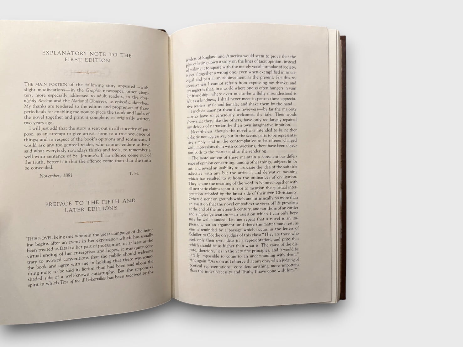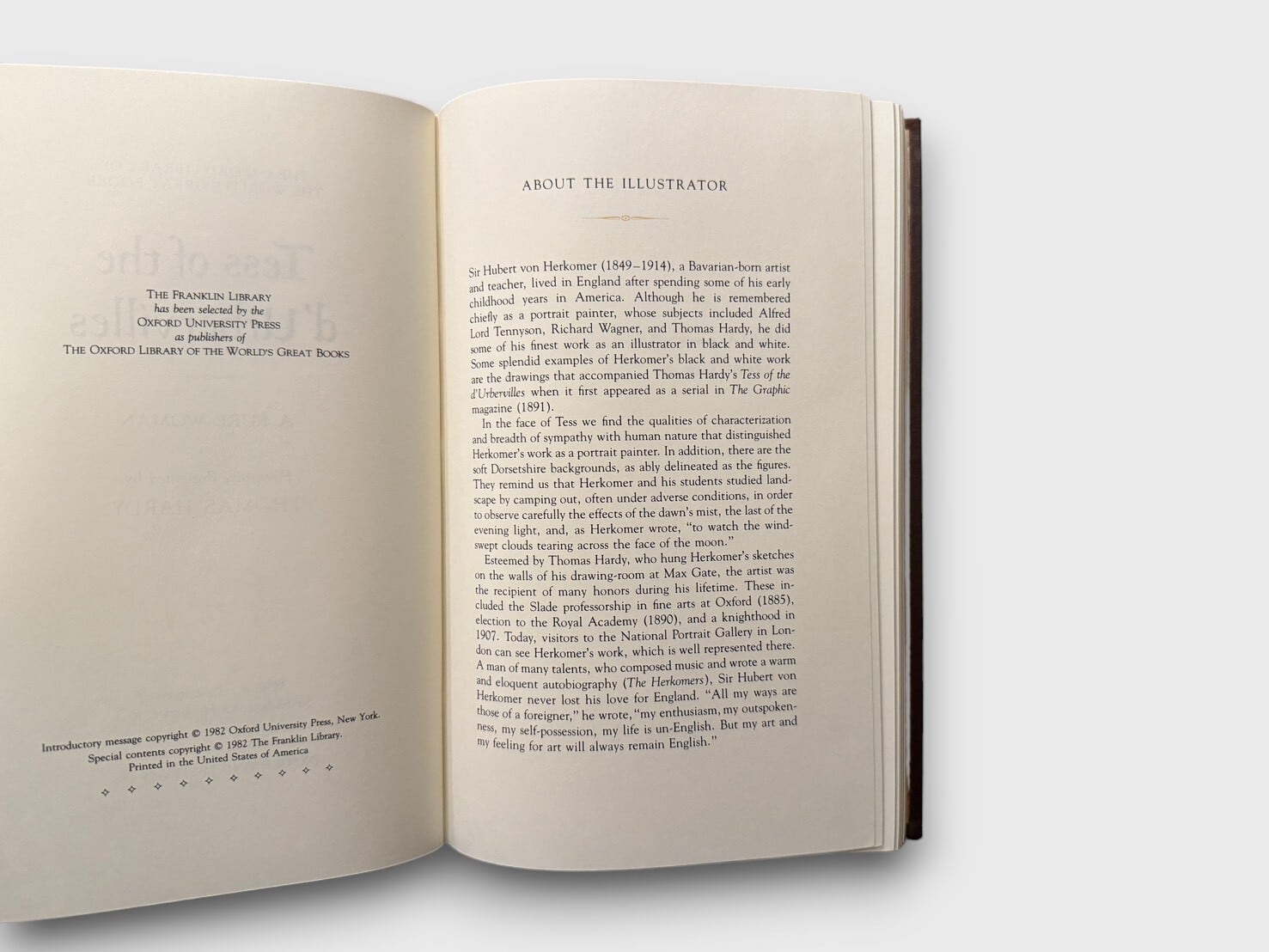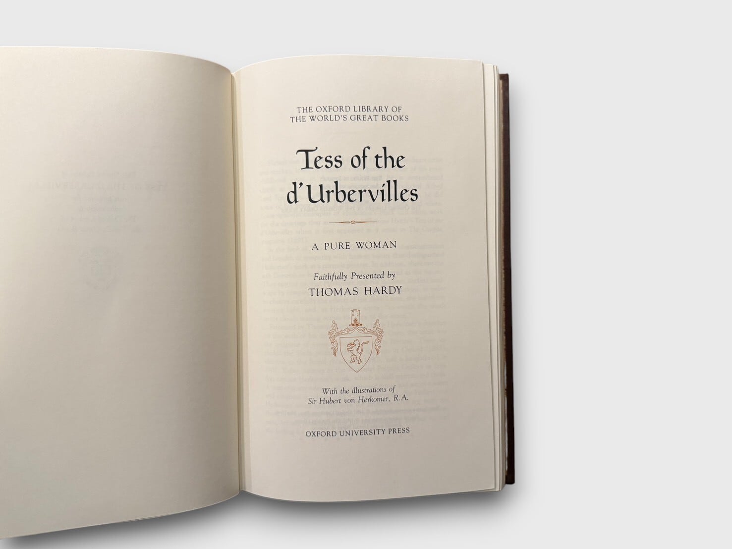 イギリスの文豪トマス・ハーディが1891年に発表した代表作『テス』。自然主義と社会批判の精神が結晶した傑作として知られる。農村に生きる女性テスの悲劇を通して、運命・純潔・階級・道徳といったテーマを鋭く描き、ヴィクトリア朝文学の転換点を刻んだ作品である。本書は The Franklin Library が Oxford University Press と提携し、“The Oxford Library of the World’s Great Books” シリーズとして刊行した1982年版。