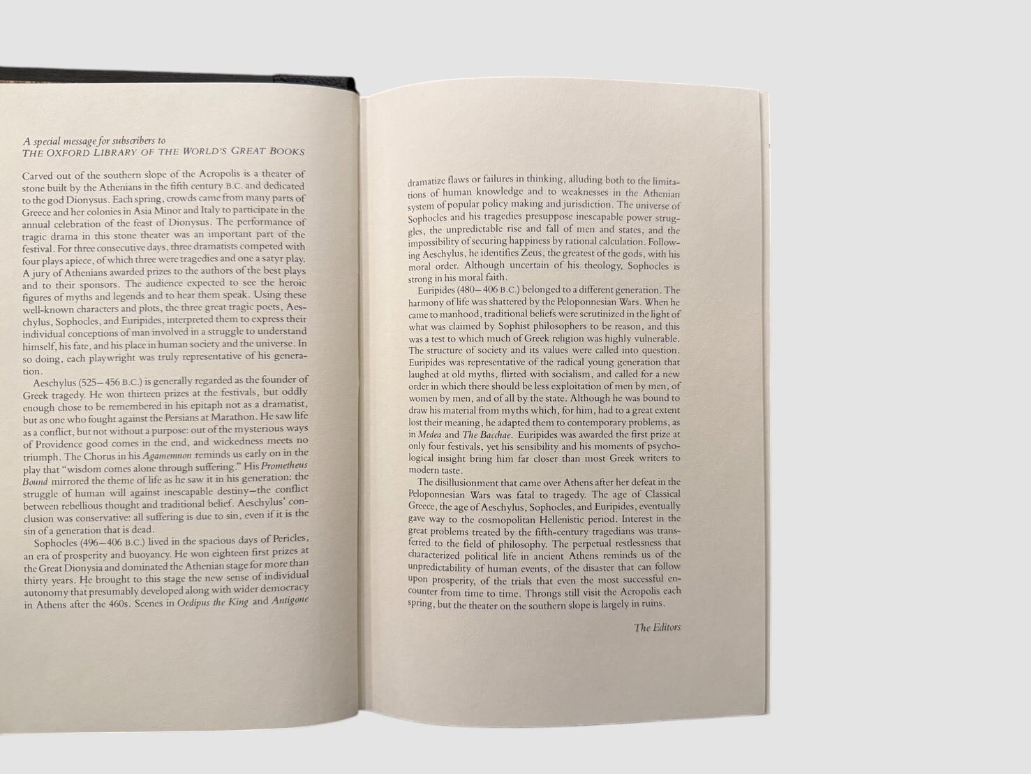 古代ギリシャ三大悲劇詩人――アイスキュロス、ソポクレス、エウリピデスの代表作を収めた豪華版。人間の宿命、罪と贖い、神々との葛藤といった古代悲劇の根源的主題が、明快な英訳と気品あるレイアウトで蘇る。The Franklin Libraryによる特製版で、Oxford University Pressの“The Oxford Library of the World’s Great Books”シリーズの一冊として刊行。荘厳な古典の世界を際立たせている1冊。