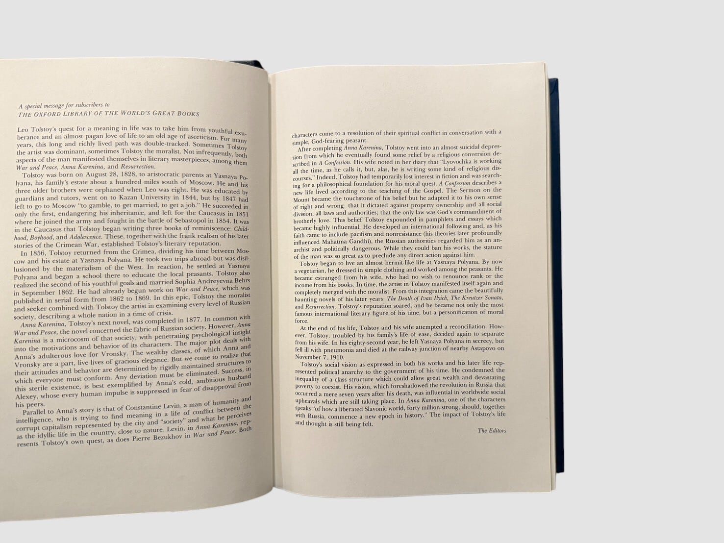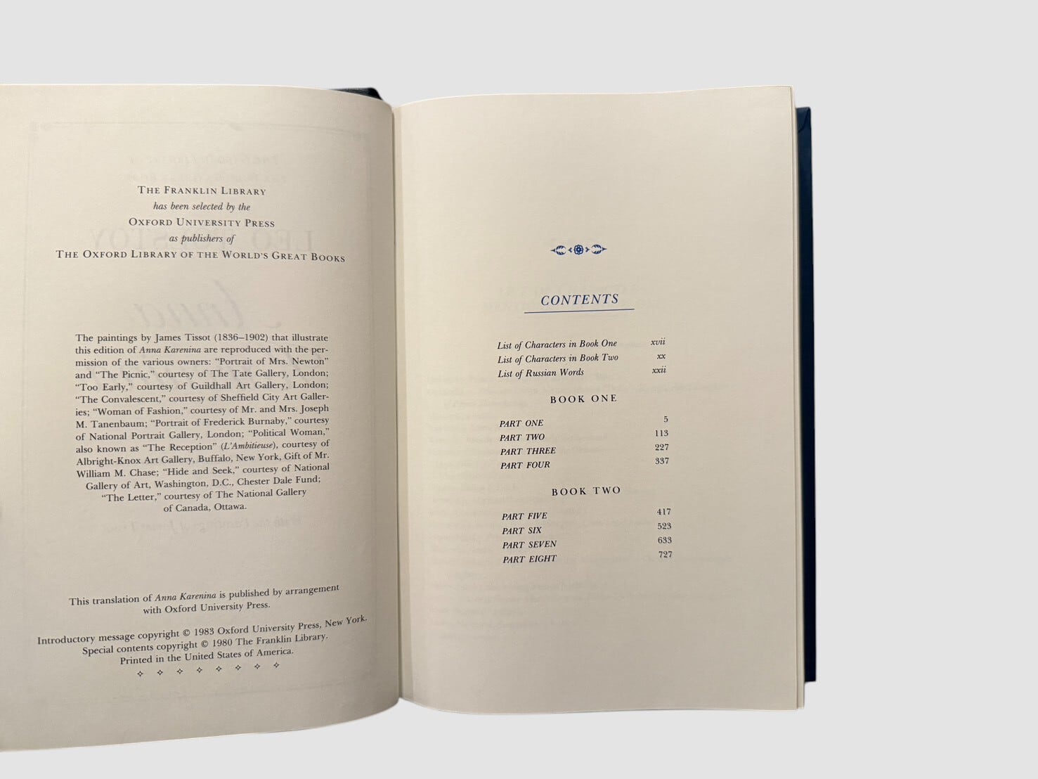 人間の情熱と道徳、愛と孤独を描き出したトルストイの傑作『アンナ・カレーニナ』。Louise & Aylmer Maude夫妻による名訳で収録した特装版。James Tissotの絵画を挿入図版として収めた豪華な造本。本書は、オックスフォード大学出版局監修による〈The Oxford Library of the World’s Great Books〉シリーズの一冊として、The Franklin Libraryより刊行された特装版。トルストイ文学の頂点を、芸術品のような装幀とともに味わえる逸品。