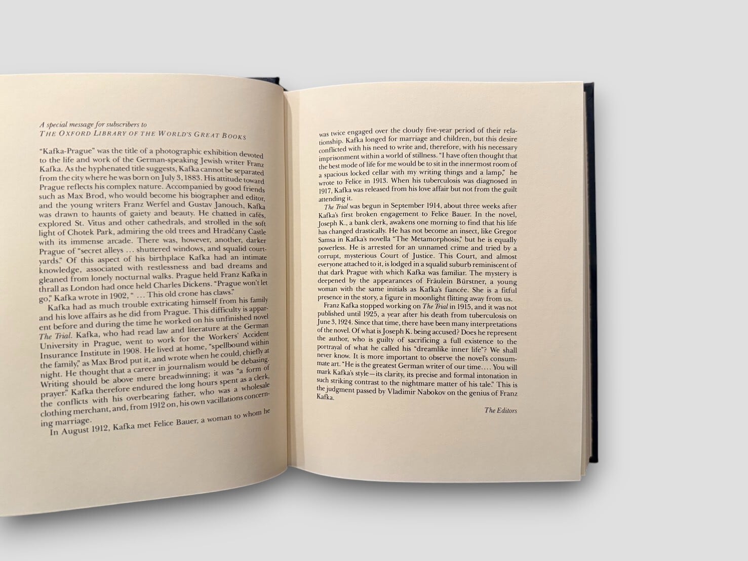主人公ヨーゼフ・Kは、ある朝突然理由も知らされぬまま逮捕され、終わりの見えぬ裁判に巻き込まれていく。社会的秩序の不在、孤独、そして存在そのものへの不安――カフカが描く世界は、現代人の魂の闇を鋭く照らし出す。本書は、ウィラ&エドウィン・ミュアによる定評ある英訳版に基づき、オックスフォード大学出版局とフランクリン・ライブラリーの共同刊行による The Oxford Library of the World’s Great Books シリーズの一冊。チェコの画家ヤルミラ・マラノヴァによる挿絵を収録した、荘厳な特装版。
