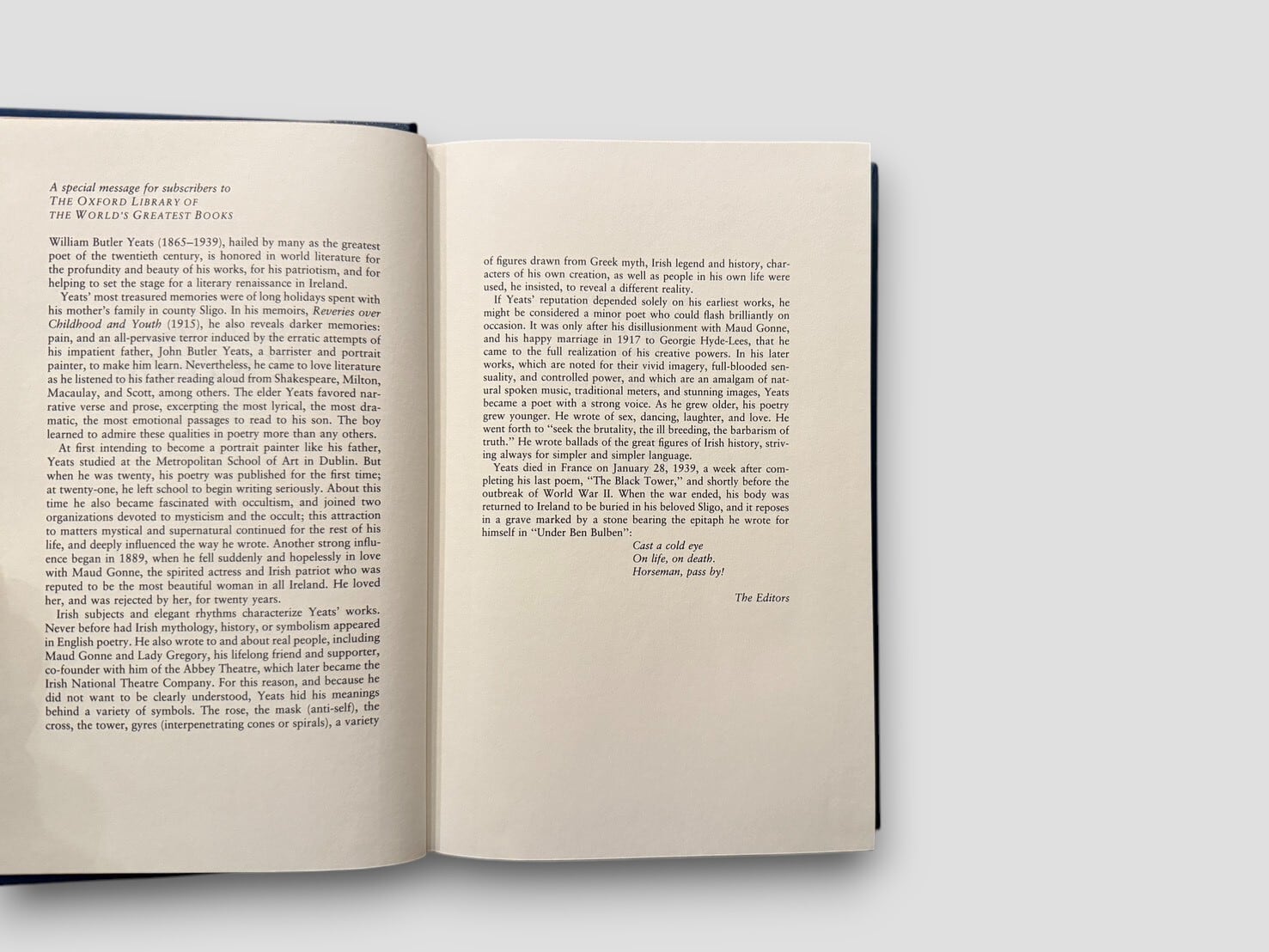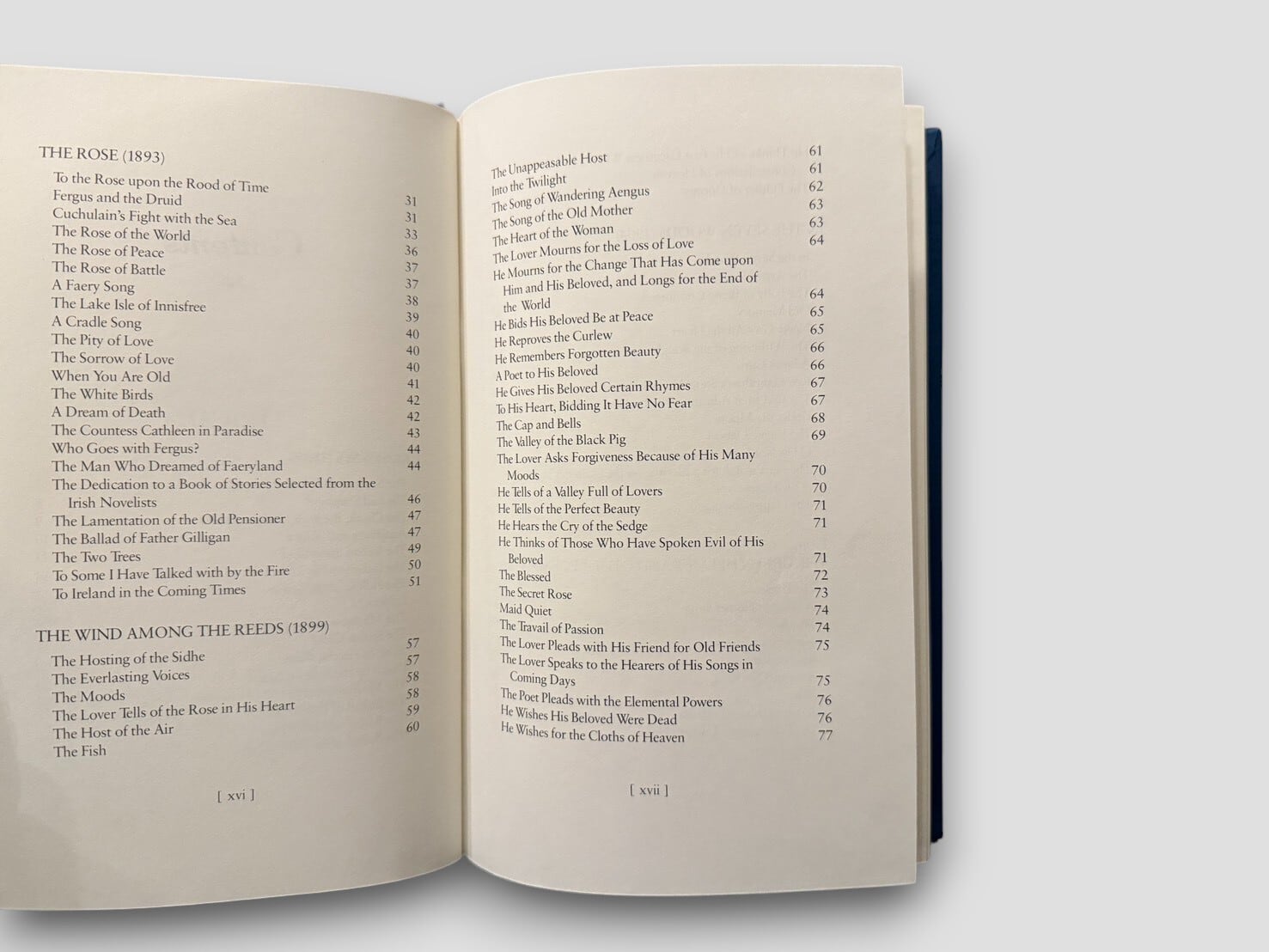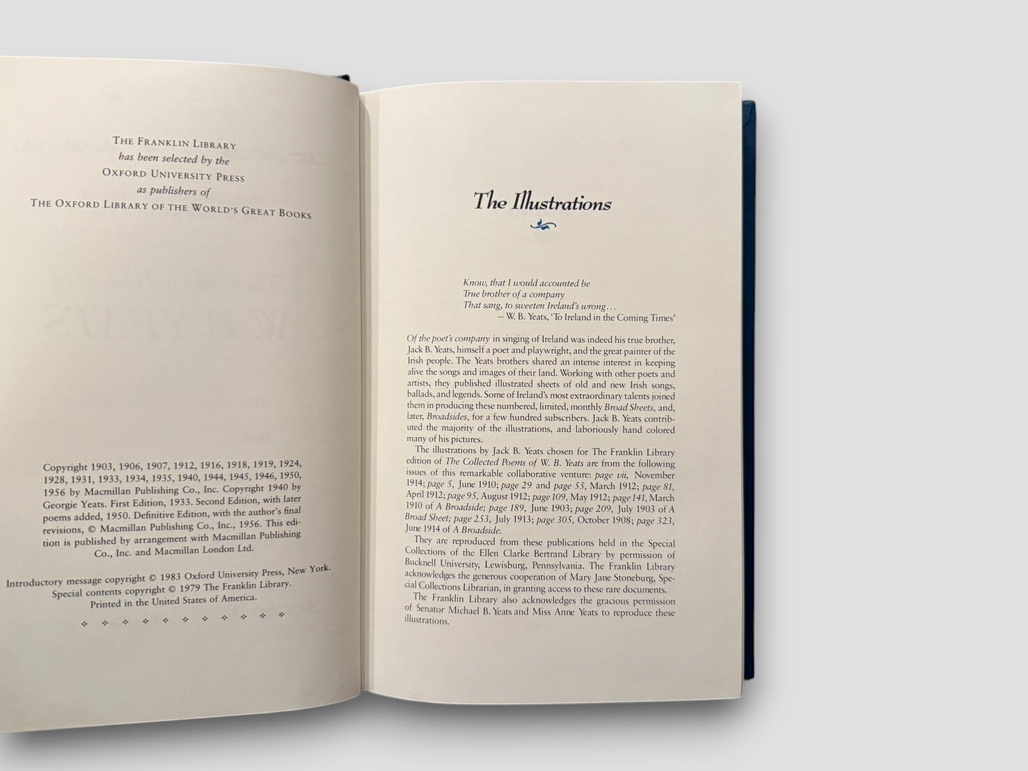 ケルト神話やアイルランドの伝承、魂の変容を主題とした象徴的な詩から、晩年の哲学的で静謐な詩篇までを網羅し、作者自身の最終改訂を経た「Definitive Edition」に基づく集大成である。本書は、オックスフォード大学出版局とフランクリン・ライブラリーの共同刊行による The Oxford Library of the World’s Great Books シリーズの一冊で、詩人の実弟であり画家としても知られるジャック・B・イェイツの挿絵を収録している。深い青の革背と金箔装飾が美しい装丁で、詩の神秘的世界を静かに包み込む一冊。
