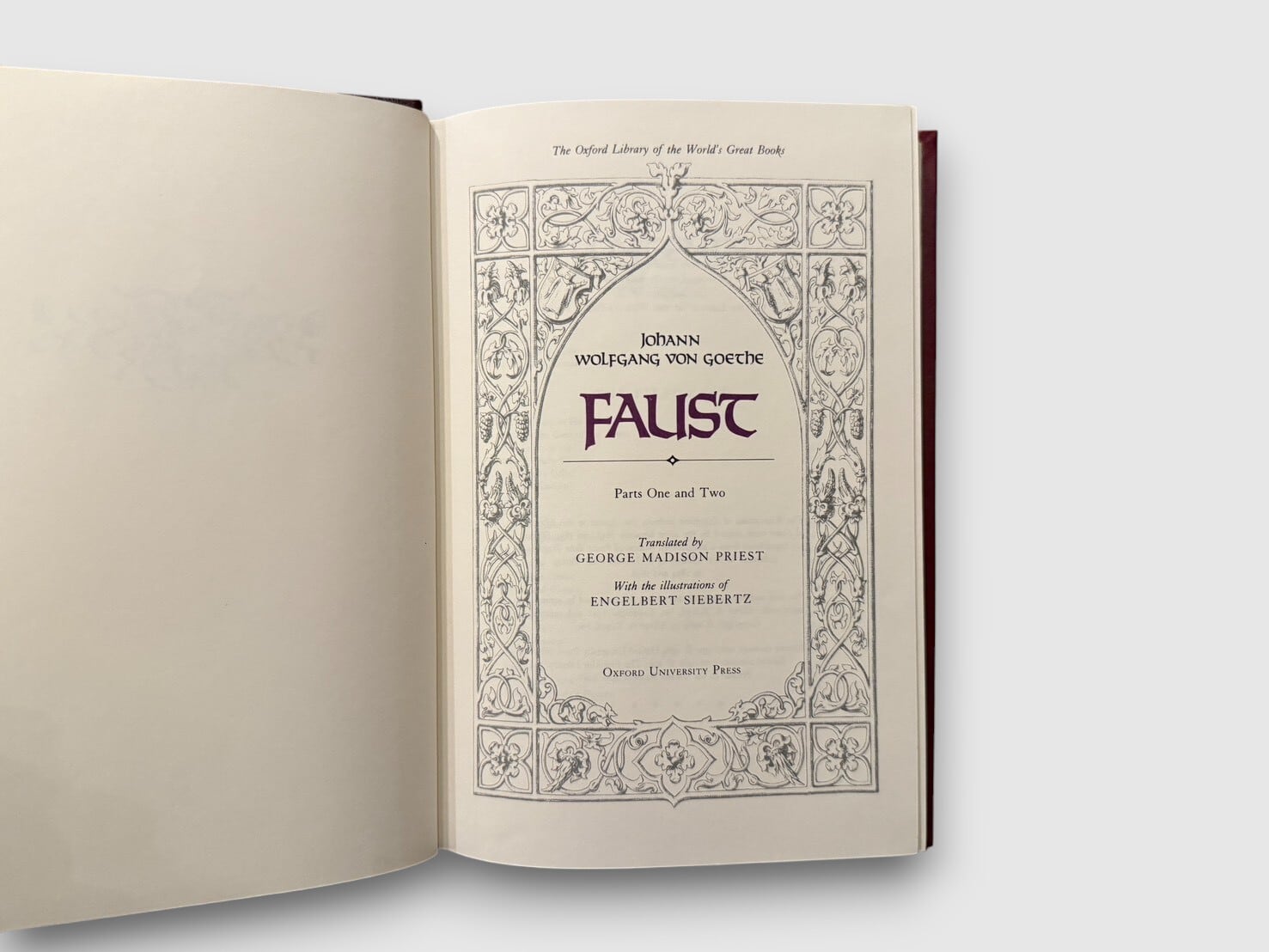 ヨーロッパ文学の金字塔にして、ドイツ精神の象徴――『ファウスト』は、知識と魂を悪魔に売り渡した男の物語を通して、人間存在の限界と永遠の探求を描いたゲーテ晩年の大作。本書は、オックスフォード大学出版局とフランクリン・ライブラリーの提携による "The Oxford Library of the World’s Great Books" シリーズの一冊。クラシックな気品と存在感を放つ特装版である。
