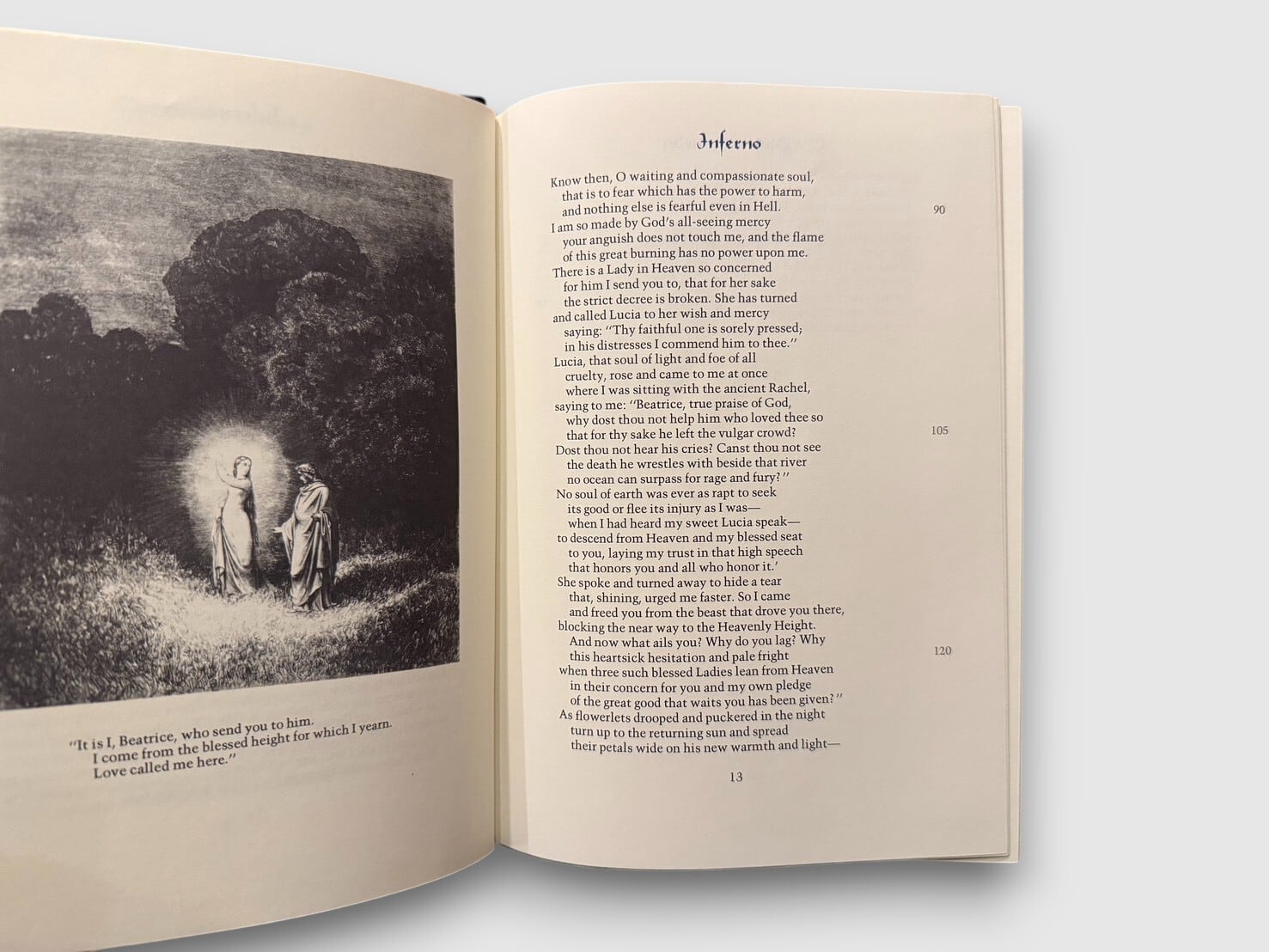 人類の精神史に燦然と輝く叙事詩『神曲』は、詩人ダンテが地獄・煉獄・天国を巡る旅を通して魂の救済と神の摂理を描いた永遠の文学である。本書は、ジョン・チャーディによる英訳と、ギュスターヴ・ドレの銅版画を収めたフランクリン・ライブラリー特装版で、オックスフォード大学出版局との共同刊行シリーズ「The Oxford Library of the World’s Great Books」に属する。荘厳で気高い装丁が作品の宗教的世界観を見事に体現している1冊。