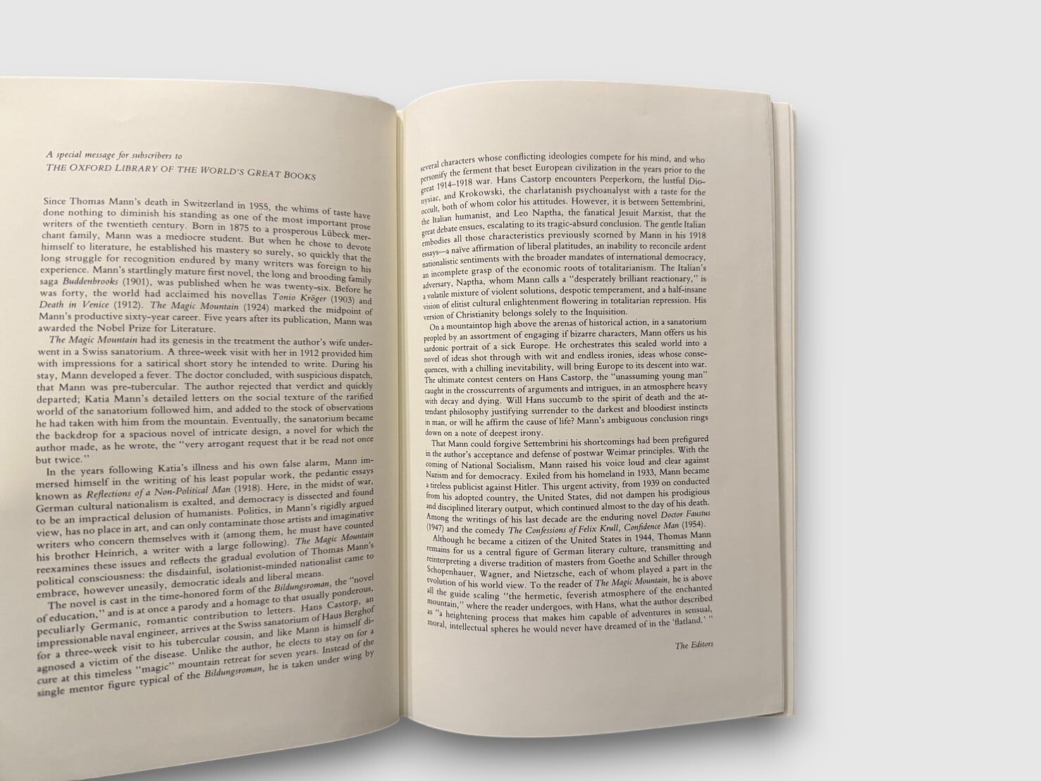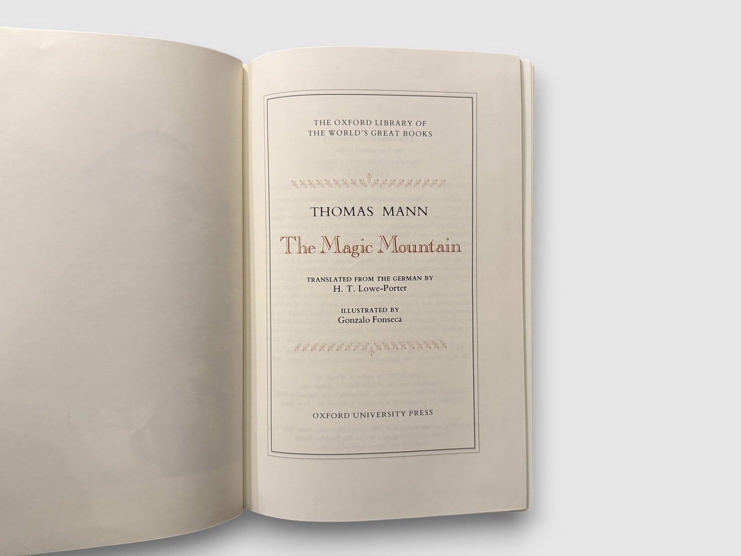 トーマス・マンの代表作『魔の山』は、第一次世界大戦前夜のヨーロッパを舞台に、人間精神の葛藤と病的な時代の気配を描いた20世紀文学の傑作である。青年ハンス・カストルプが訪れた高地のサナトリウムを舞台に、時間・生・病・死といった主題が象徴的に展開される。本書は、オックスフォード大学出版局とフランクリン・ライブラリーの共同刊行による The Oxford Library of the World’s Great Books シリーズの一冊。知的で重厚な存在感を放つ特装版である。