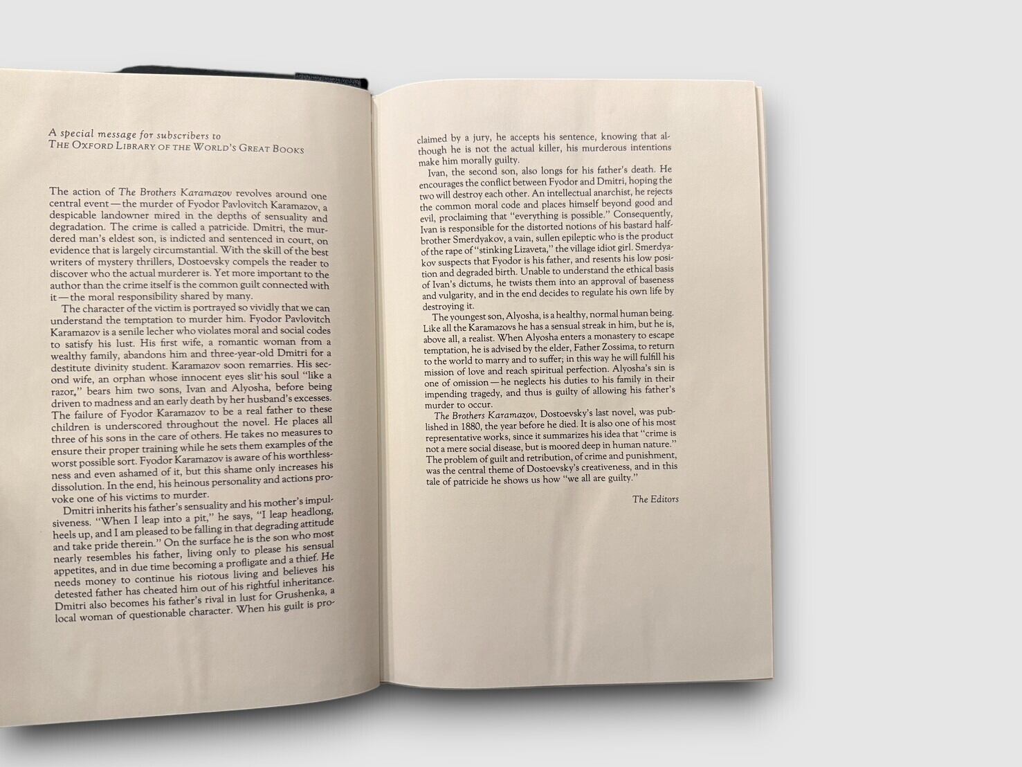 ロシア文学の巨匠フョードル・ドストエフスキーが生涯の集大成として1880年に発表した大長編『カラマーゾフの兄弟』。人間の内面に潜む信仰と理性、愛と罪、そして神の存在を問うこの作品は、哲学・倫理・心理のすべてを融合させた人類文学の最高峰と評されている。父殺しという根源的罪を軸に、三兄弟イワン、ドミートリイ、アリョーシャの魂の葛藤を描いた壮大な物語は、読む者を深い思索へと誘う。本書は The Franklin Library が Oxford University Press と提携し、“The Oxford Library of the World’s Great Books” シリーズとして刊行した1985年版。