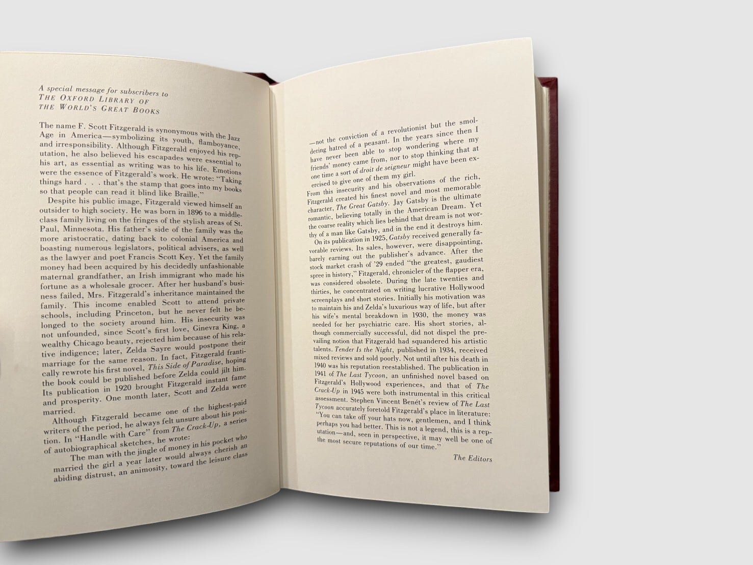 ジャズ・エイジ(狂騒の20年代)を背景に、富と夢、愛と喪失をめぐる人間の欲望と虚無を描き出したフィッツジェラルドの代表作『グレート・ギャツビー』。アメリカ文学の象徴的名作。華やかなパーティーの光の裏に潜む孤独と崩壊、アメリカン・ドリームの終焉を描いたこの小説は、20世紀文学における不朽のモダニズム作品として今日も読み継がれている。本書は The Franklin Library が Oxford University Press と提携し、“The Oxford Library of the World’s Great Books” シリーズとして刊行した1982年版。