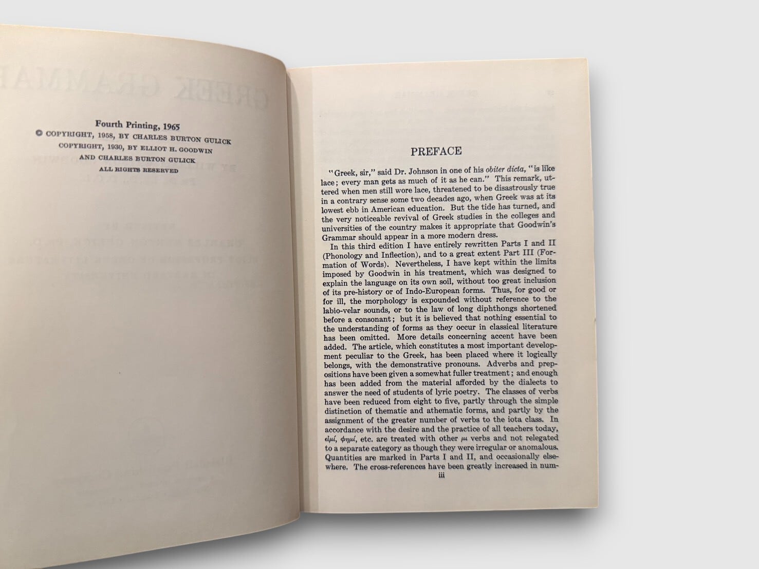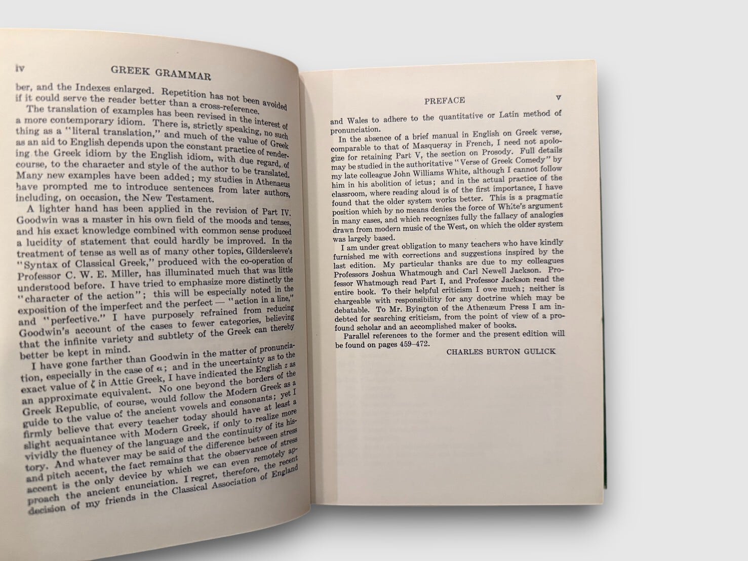 William Watson Goodwin による古典ギリシア語文法の古典的著作を、Harvard University の Charles Burton Gulick が大幅に改訂した学術的定本。語形変化・語法・構文・アクセントなど、古典ギリシア語を体系的に理解するための主要項目が総合的に整理されており、20世紀の大学レベルの古典語教育において長く参照されてきた。