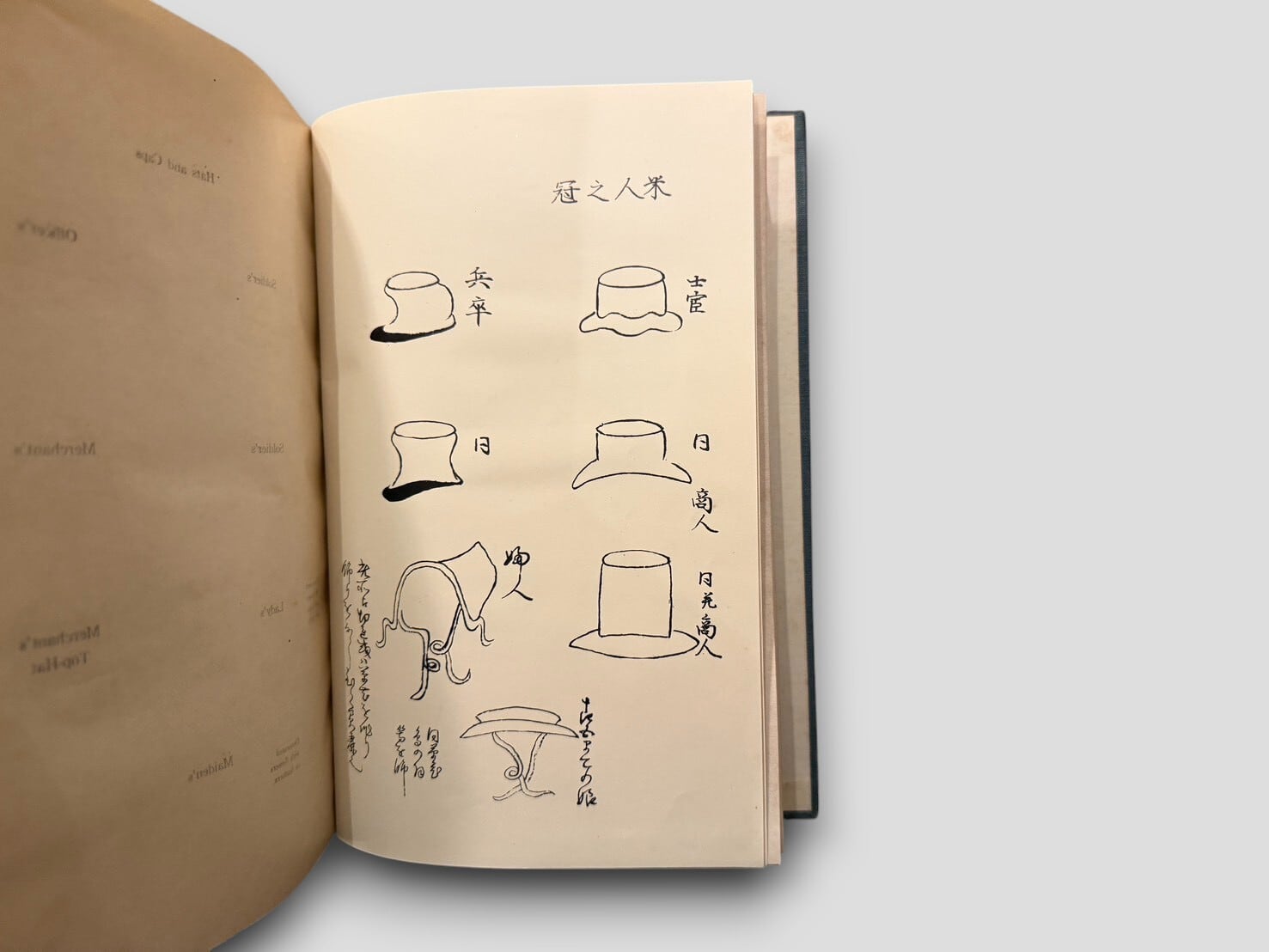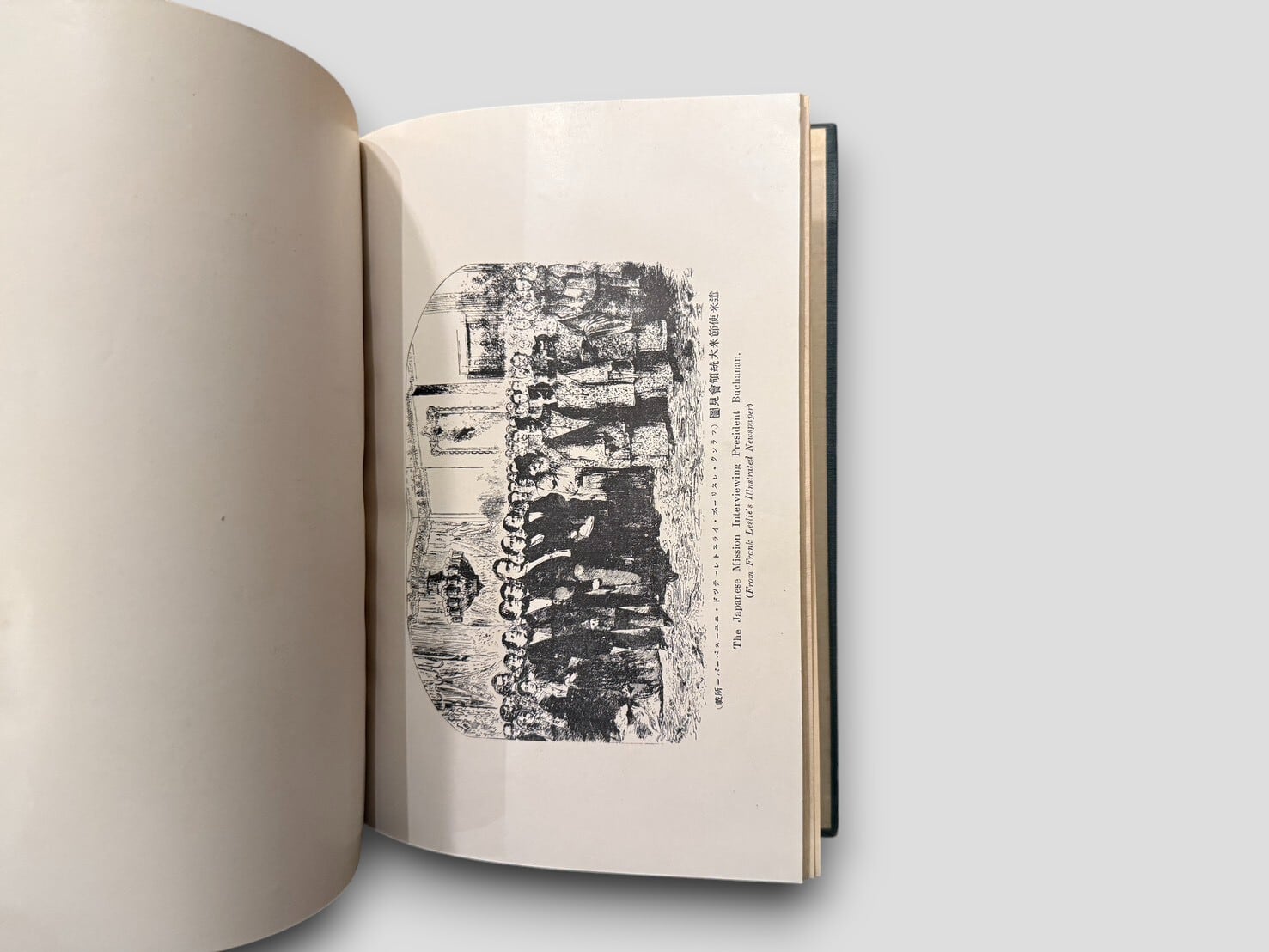万延元年(1860)に派遣された「遣米使節団」の航海日記の英訳本。幕府の公式使節によって記録された詳細な航海記録は、江戸末期の国際関係と、日米間における最初期の接触を知るうえで欠かせない一次資料。折込カラー図版として黒船「Powhatan」の精緻な図が収録され、さらに巻末には多数の挿絵も付されている。タイトルページに編集者M. G. Moriによる献呈署名と、フロントフライリーフに『森氏蔵書』と印有。1937年刊行、特別な初版。