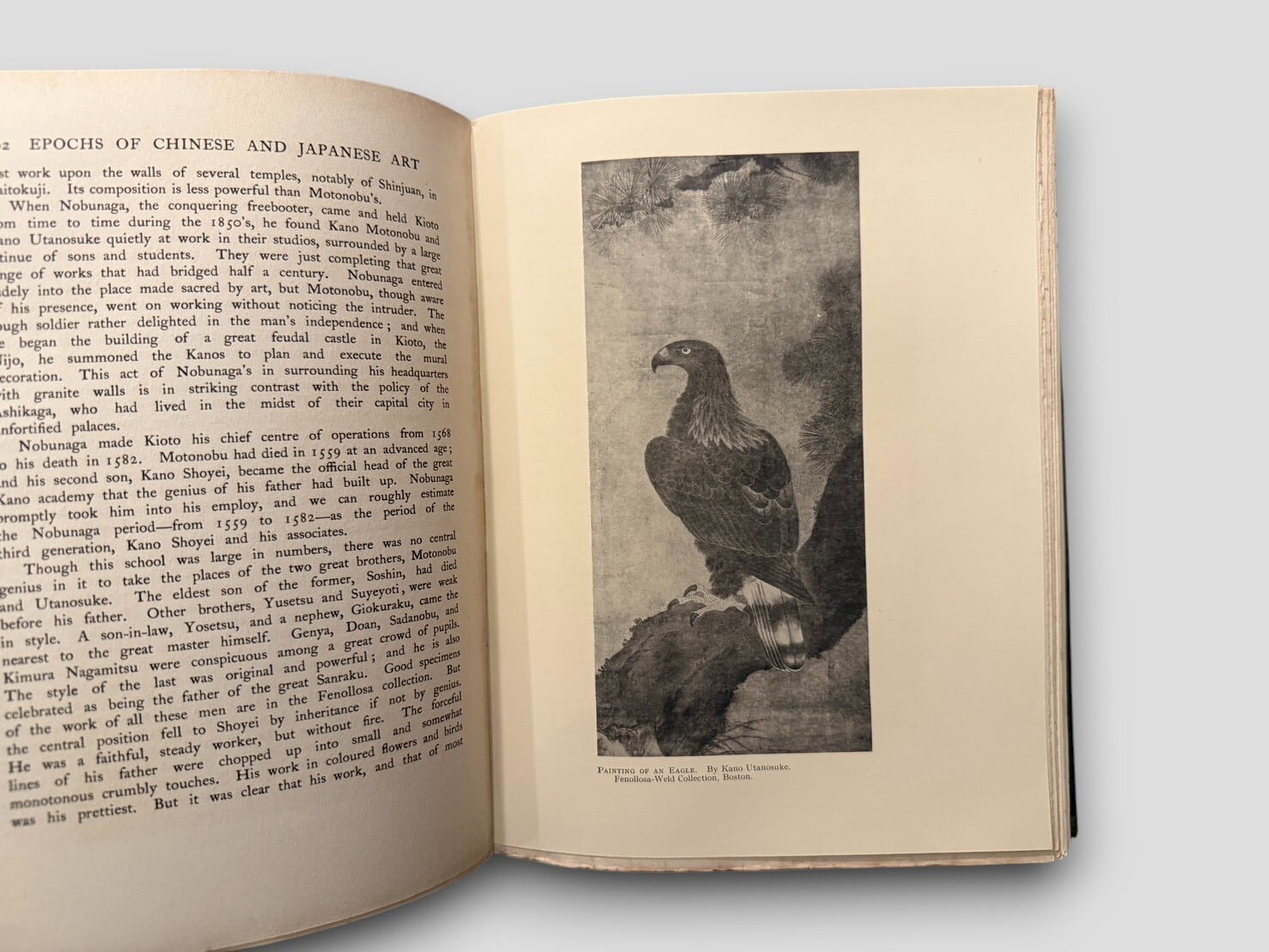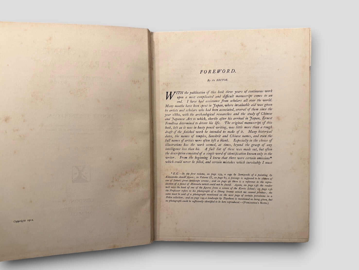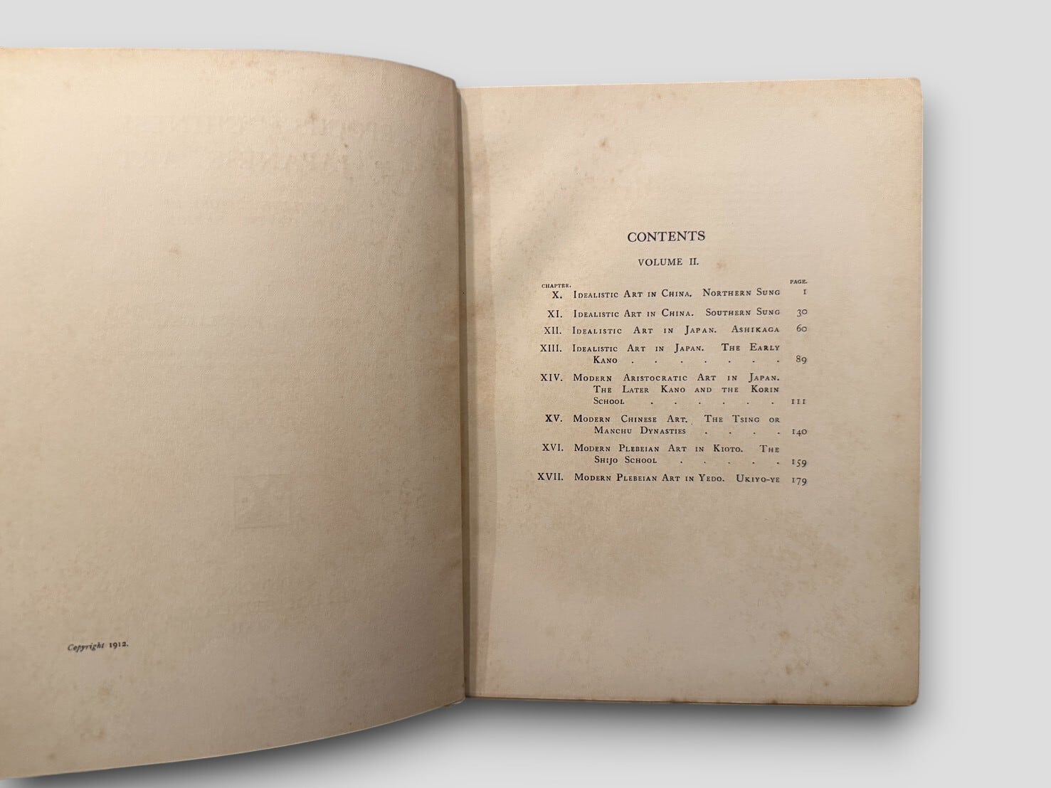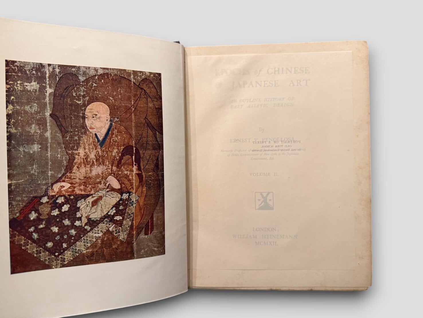 アメリカ生まれで明治期の日本美術研究を牽引したアーネスト・F・フェノロサによる、東洋美術史の古典的名著。中国美術と日本美術の発展を「時代(Epochs)」ごとに整理し、思想・宗教・政治文化との関係を踏まえながら体系的に描き出す2巻構成の大作。編集には妻メアリー・フェノロサが携わり、フェノロサ没後に残された膨大な原稿を基に世に送り出された。各巻の冒頭や巻末には多様な図版が収められ、初期仏教美術から鎌倉期の絵画、南宋の理想主義美術、浮世絵まで、東洋美術を横断する壮大なスケールの2冊セット。1912年刊行初版。