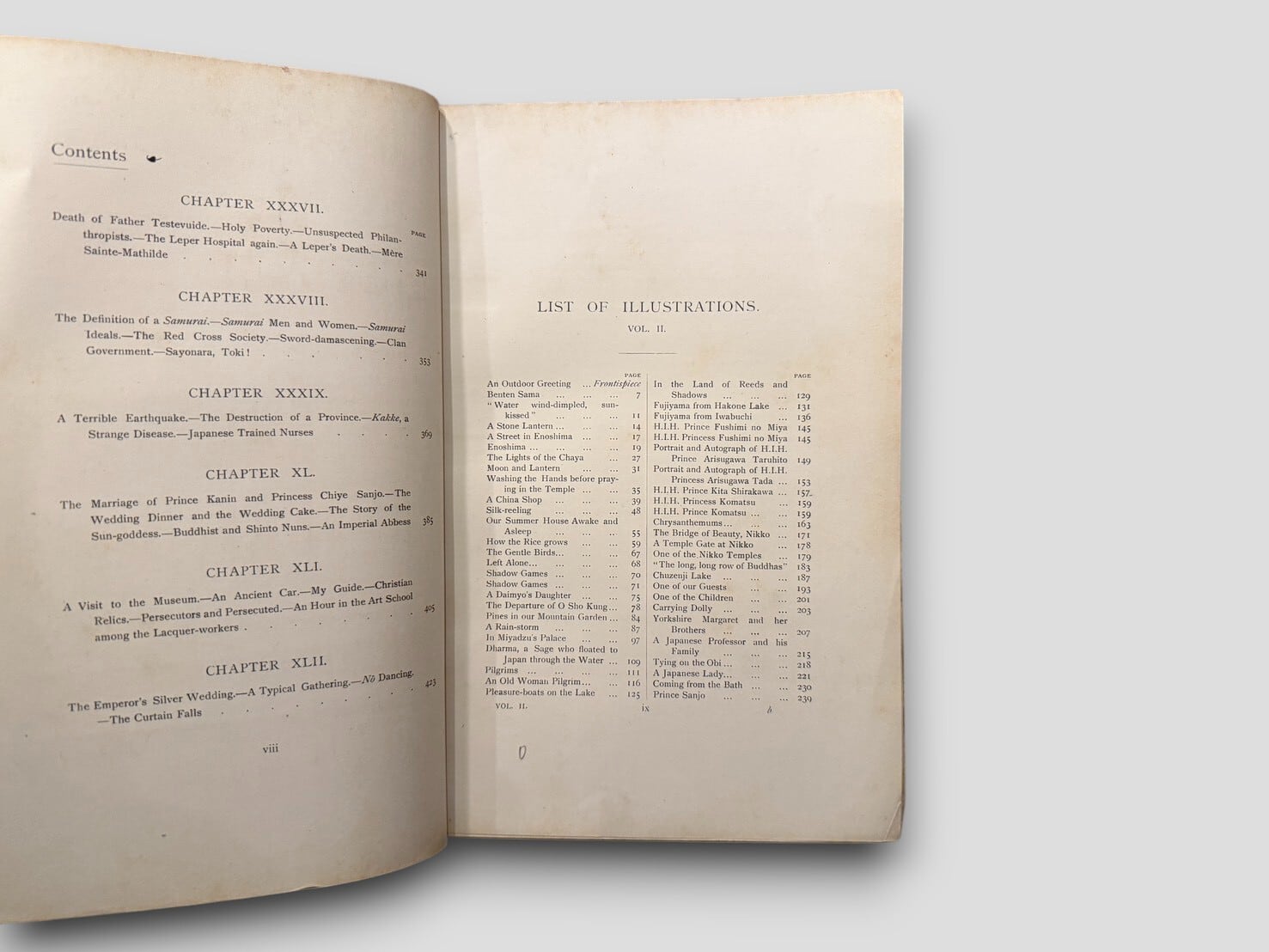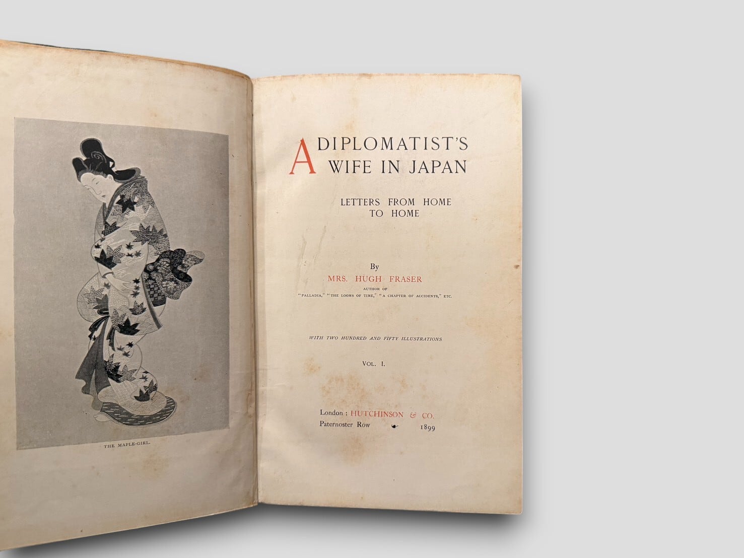 英国外交官夫人メアリー・C・フレイザーが、明治期の日本での生活を家族へ宛てた手紙の形で綴った回想記。1890年代の東京・鎌倉・箱根・三浦半島などの風景、宮廷行事、四季の行事、人びとの暮らしやしきたりを、外国人女性の視点から生き生きと描き出す。250点におよぶ挿絵が各巻に収録され、当時の日本の風俗史を知る貴重な記録資料として評価が高い。外交官夫人ならではの視座と柔らかい語り口が魅力で、19世紀末の日本文化を味わう上でも重要な文献。1899年刊行初版、全2巻本揃。