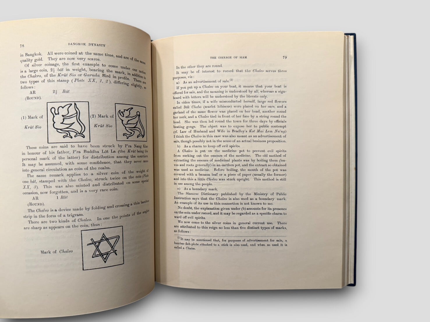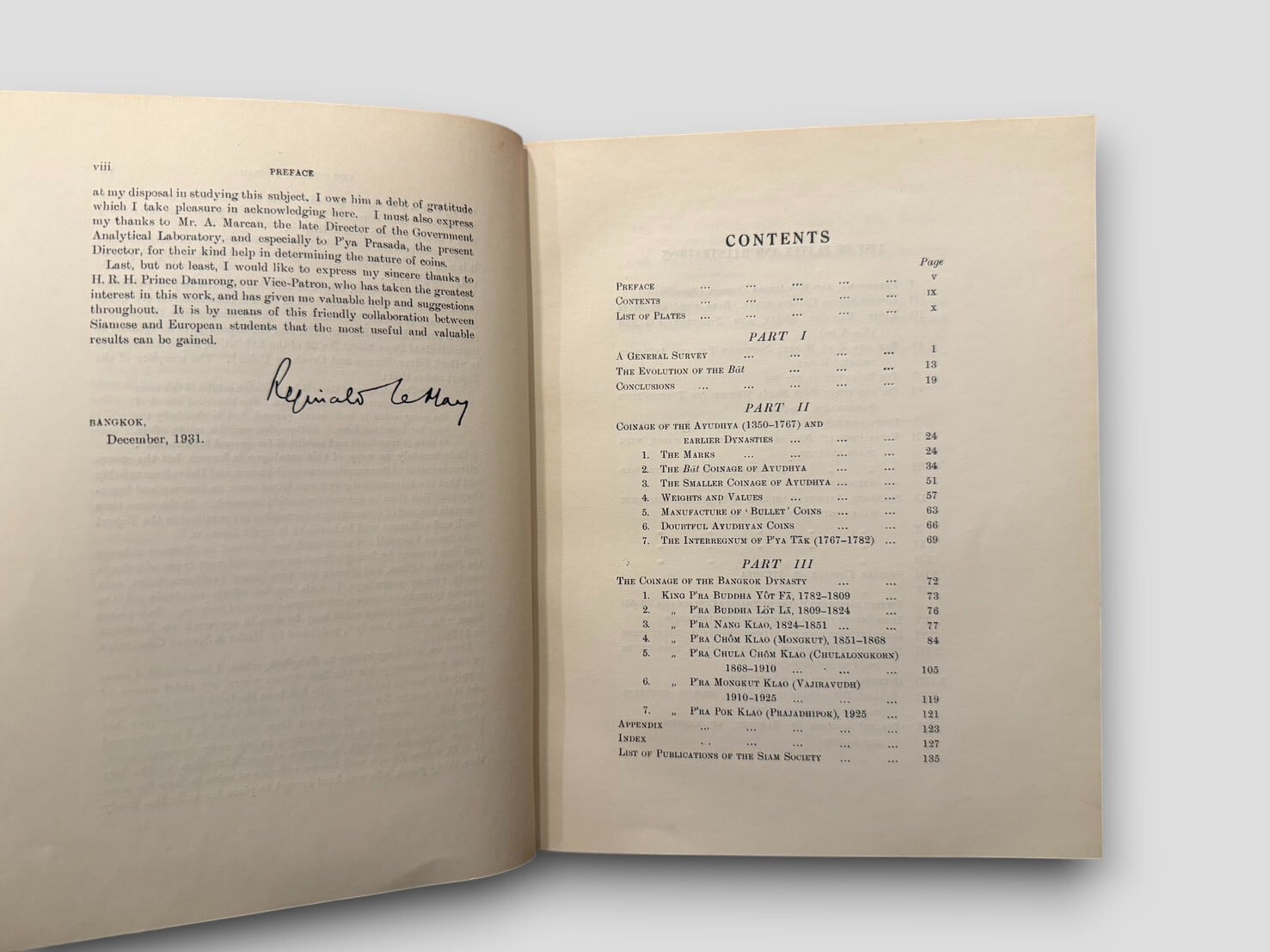 英国人研究者レジナルド・ル・メイがまとめた、タイ(旧名シャム)貨幣史の決定版的研究書。シャム王朝以前の古代通貨から、アユタヤ王朝、トンブリー王朝、ラタナコーシン朝(バンコク王朝)の発展と改変を、詳細な図版とともに体系立てて解説。貨幣の形状・刻印・用途・材質など、考古学・歴史学・貨幣学の視点を横断しながら包括的に扱った一冊。図版も多数収録され、実物貨幣の細部まで確認できる。1932年刊行、貴重な初版。