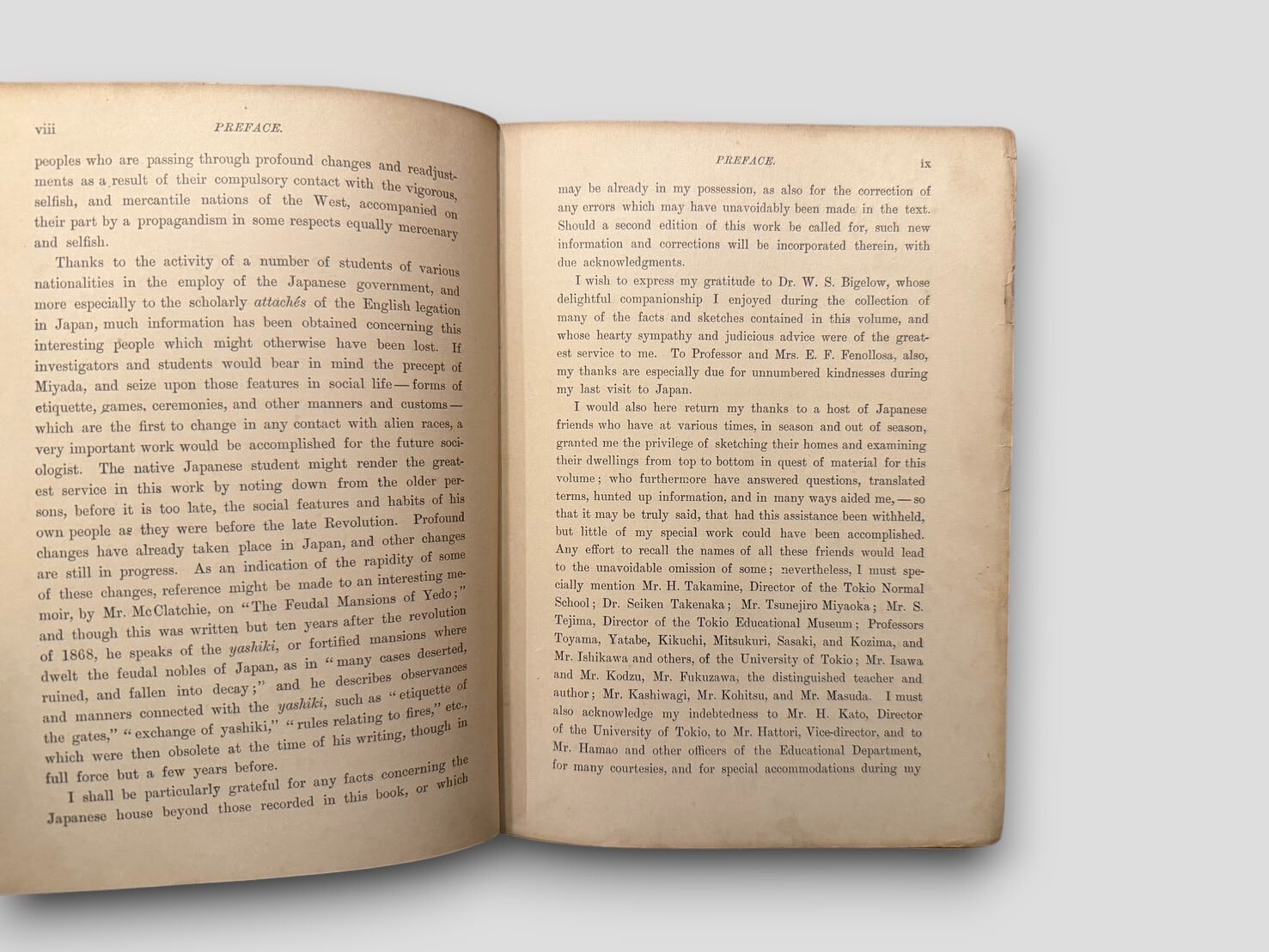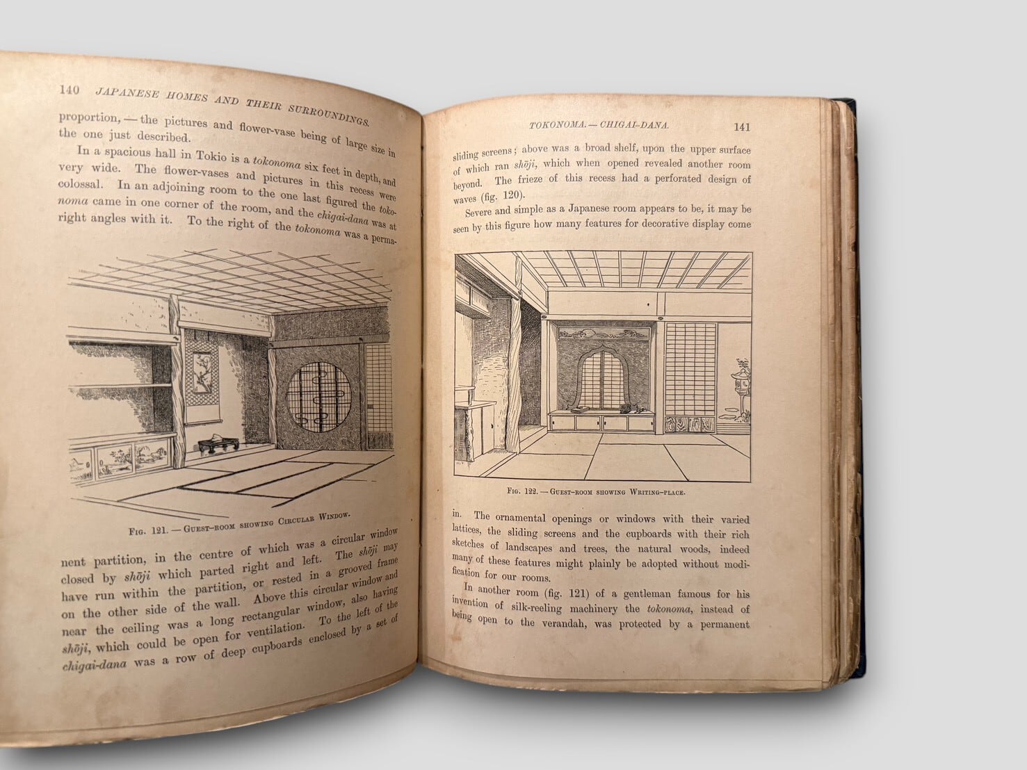 アメリカの動物学者・民族学者エドワード・S・モースが、明治期の日本家屋を徹底的に観察・記録した名著。数百点におよぶ精密なスケッチが収録され、家の構造、建具、庭、道具類、生活空間、古式の風習にいたるまで、日本の住宅文化の本質を科学的かつ文化人類学的に捉えている。台所や土間、押入れや床の間、襖・障子、釘隠、井戸、庭・植栽、外構など、建築・民俗研究に欠かせない項目を網羅。明治の日本家屋を「ありのままの姿」で写し取った貴重な一次資料として、現在でも建築史研究や日本文化史研究に頻繁に引用される。本書は 1888年刊の第四版 にあたり、初期の重要な印刷版として資料的価値が高い1冊。