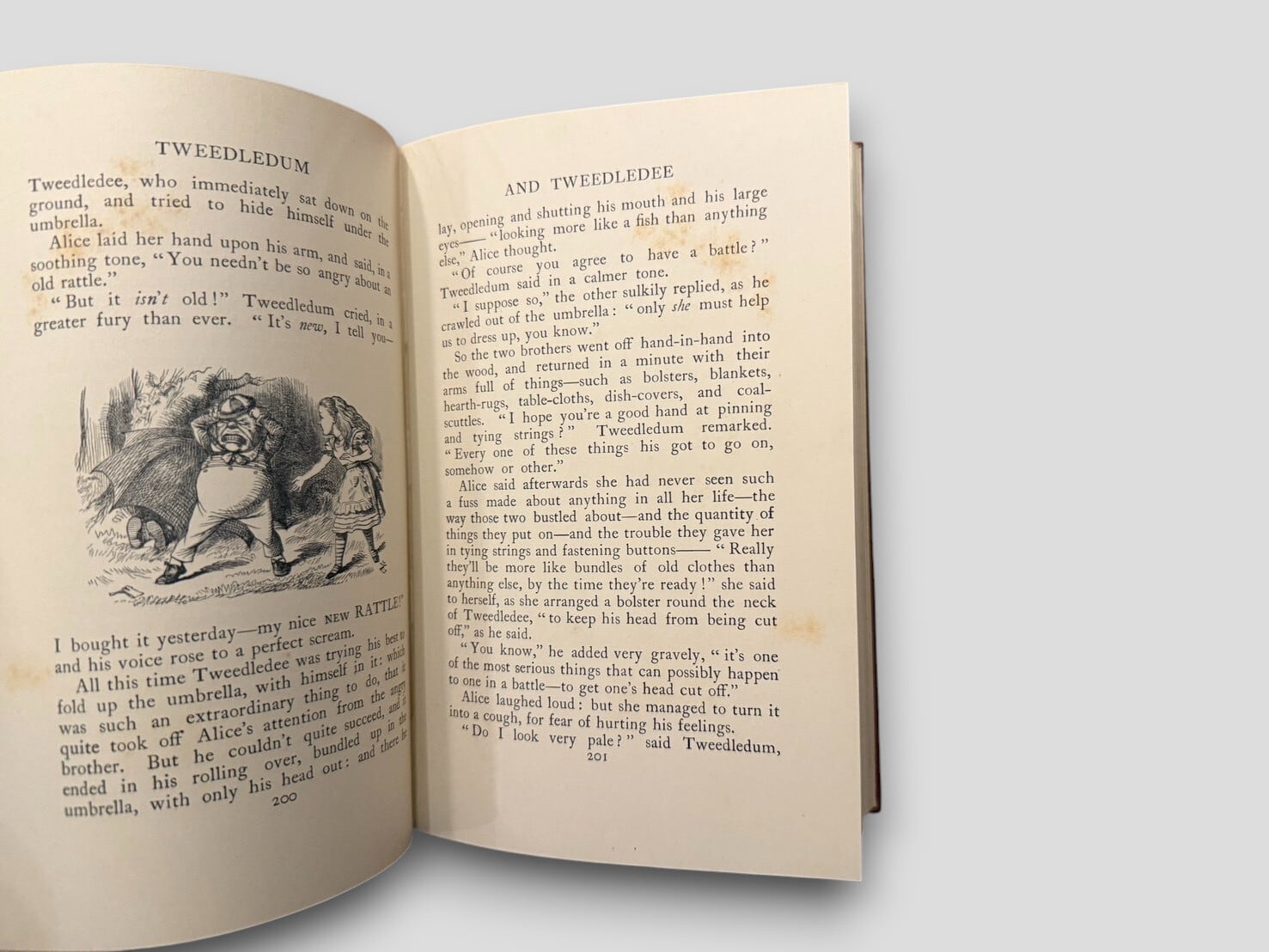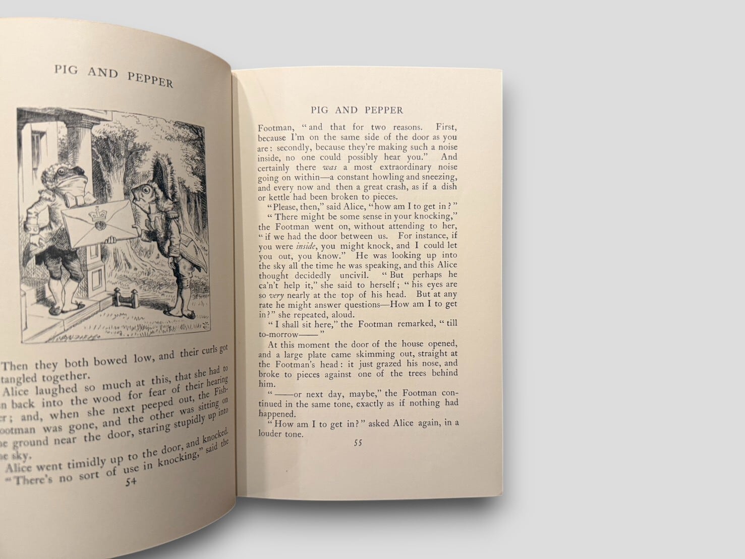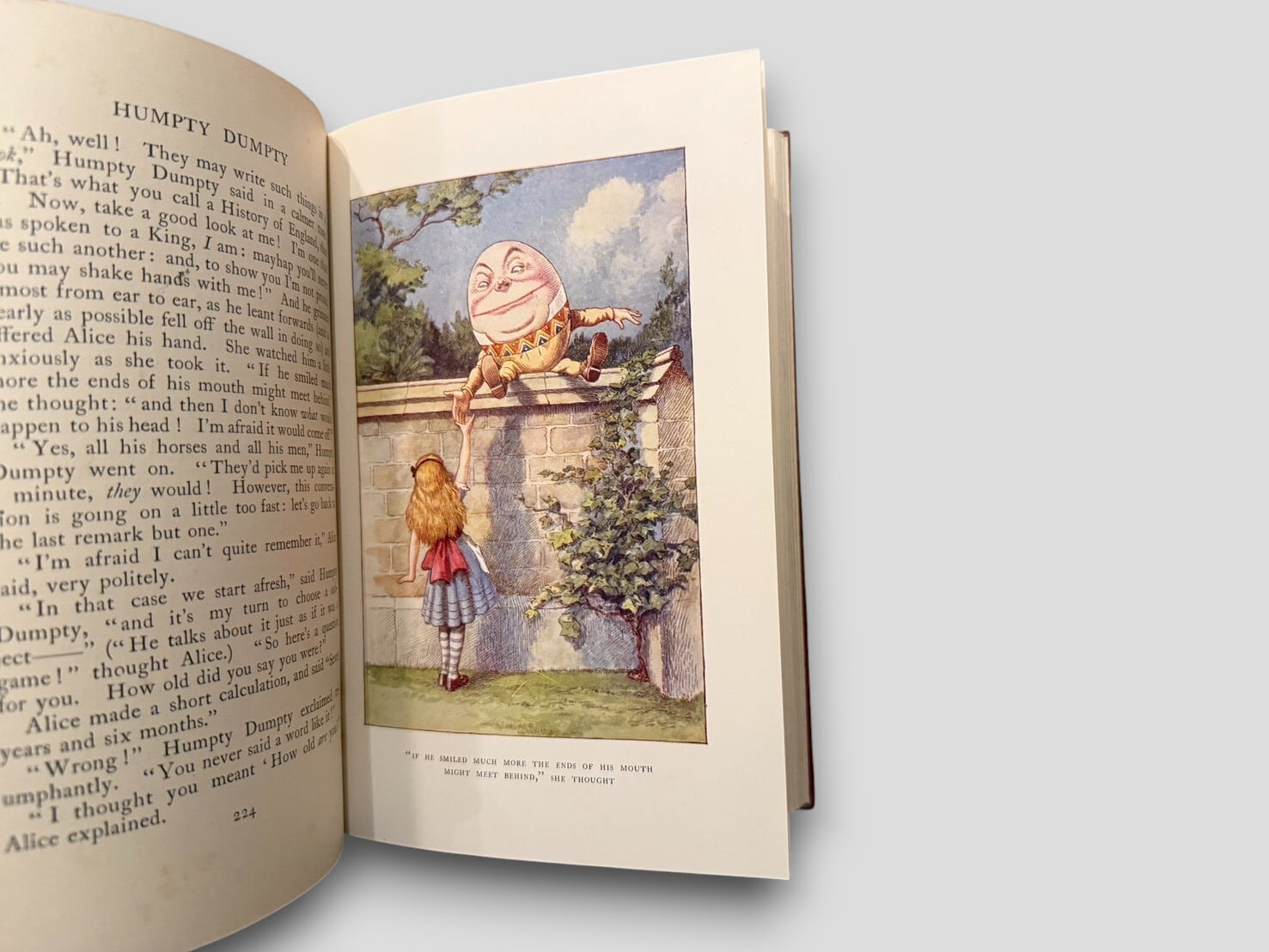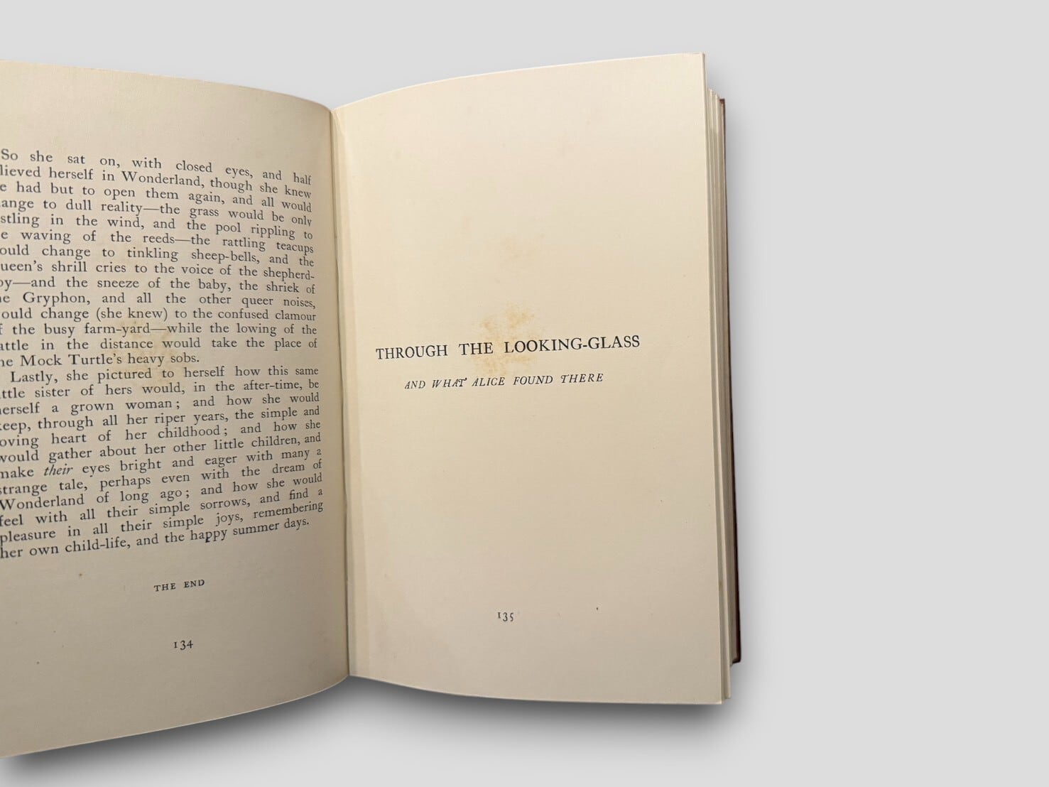 ルイス・キャロルの二大名作『Alice’s Adventures in Wonderland』と『Through the Looking-Glass and What Alice Found There』を1冊にまとめた、1934年マクミラン社刊の新版。ジョン・テニエルによる92点の挿絵(うち8点はカラー口絵)を収録。章扉、ページレイアウト、組みの美しさなど、マクミラン版アリス特有の品格が感じられる仕上がりとなっている。赤いクロス装に金箔押しのホワイトラビットが映える、愛蔵にもギフトにもふさわしい一冊。