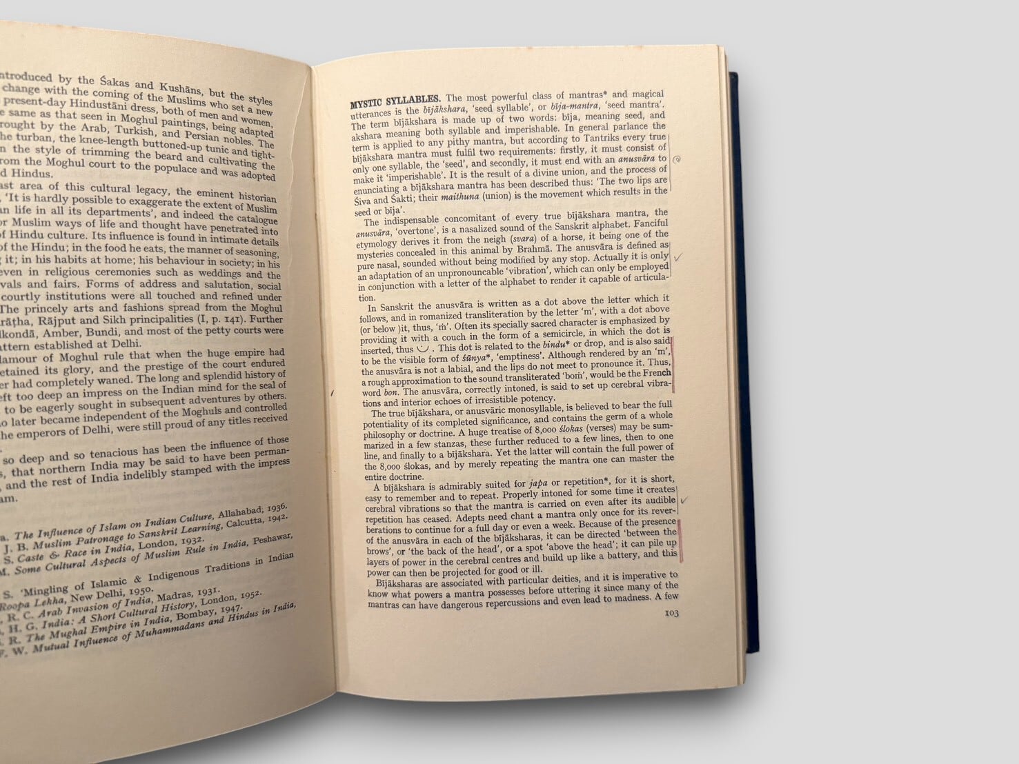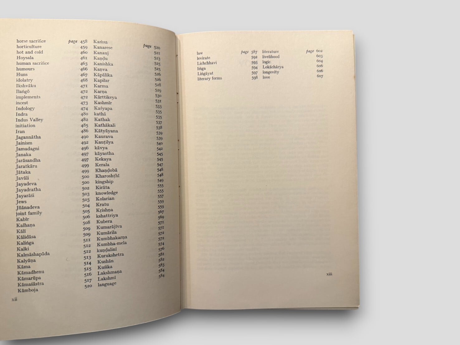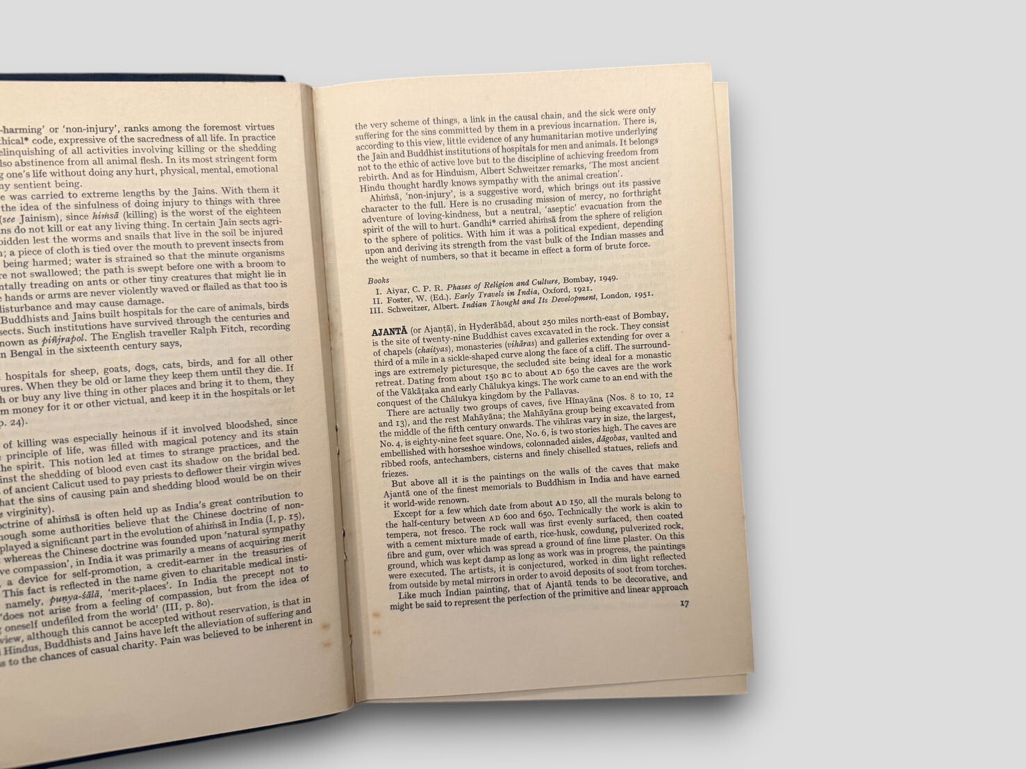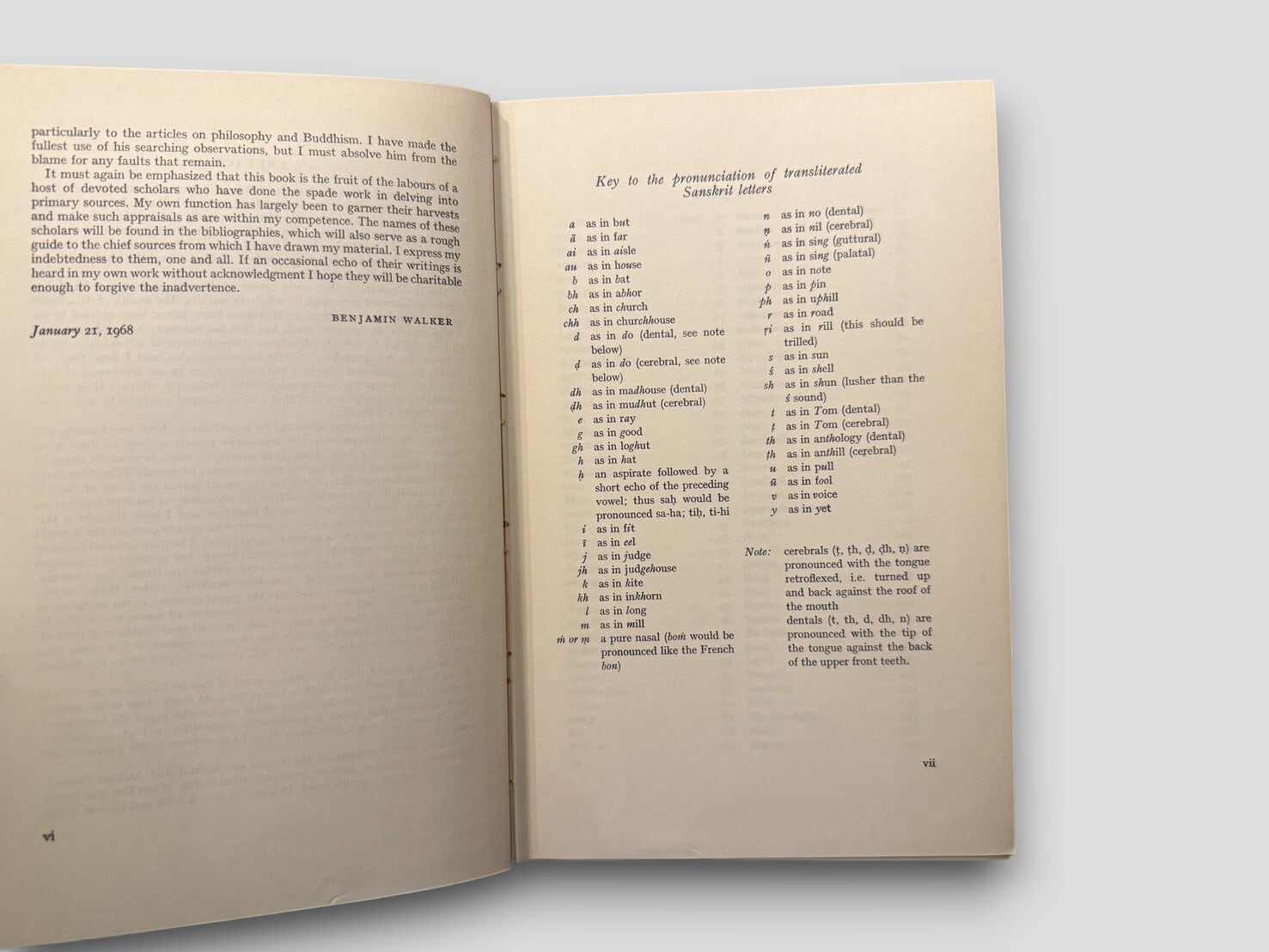イギリスの宗教学者 Benjamin Walker による、ヒンドゥー教を百科事典的に網羅した大著『Hindu World』の全2巻セット。ヒンドゥー思想・哲学・神話・宗教実践・儀礼・人物・歴史・文化・民族学的事項に至るまで、A〜Zの項目形式で約600ページずつ収録し、ヒンドゥー世界を総合的に理解するための極めて貴重な参考書である。主要文献を渉猟しつつ、聖典・伝統・神話・民俗・象徴体系にわたる広大な領域を一冊に整理した点に大きな価値がある。サンスクリット語の転写・発音表や、各項目に関連した学術的参照も充実しており、宗教研究・南アジア研究・比較神話学の領域でも高く評価されている。現在では入手の難しい、1968年初版セット。