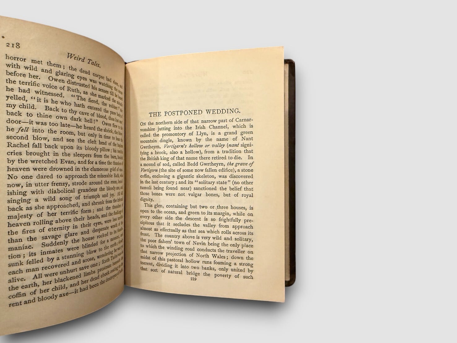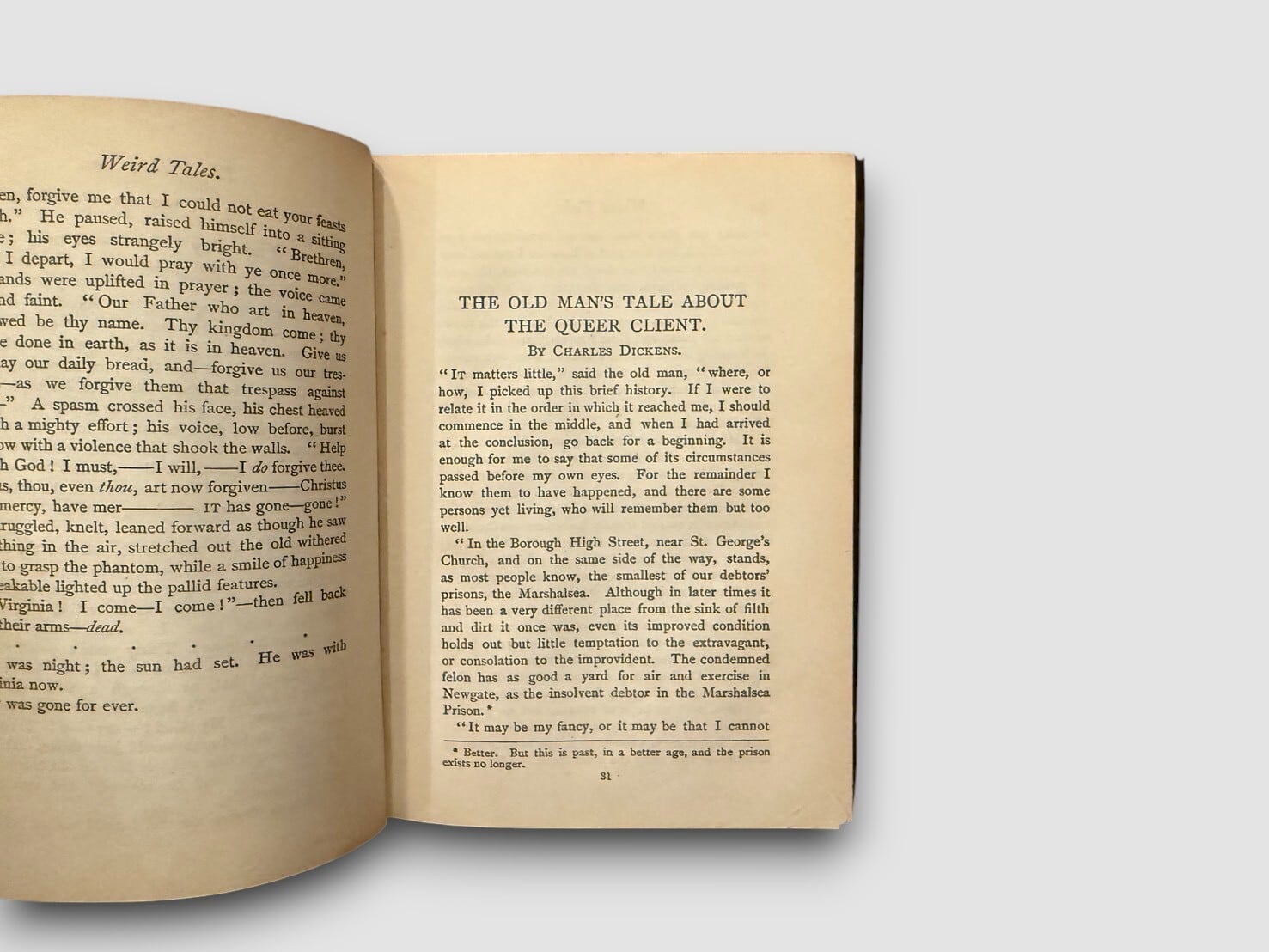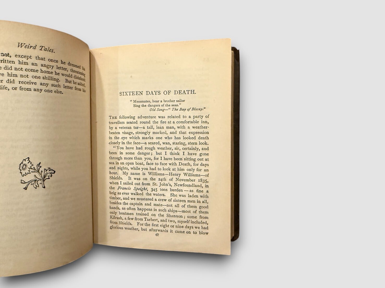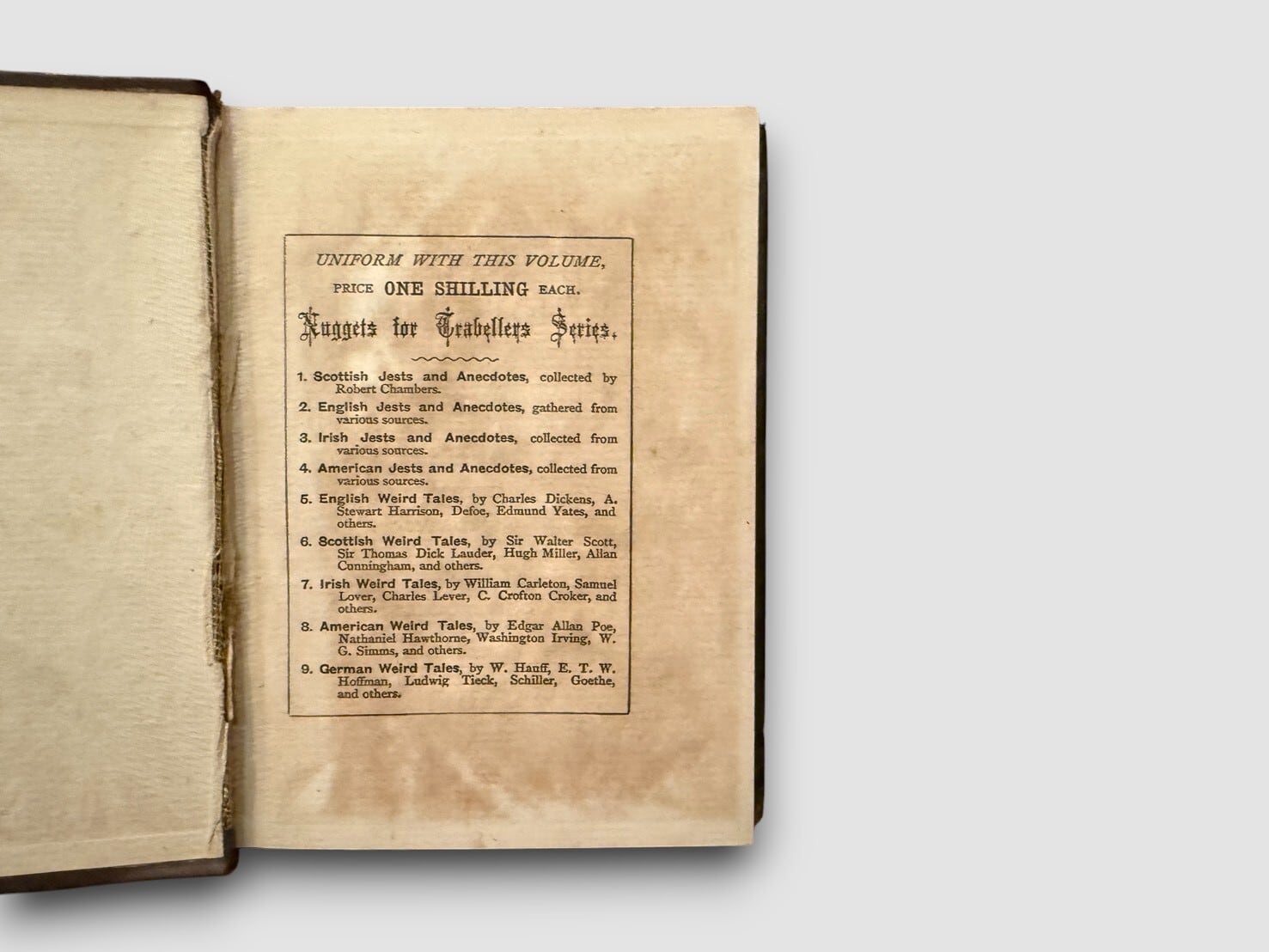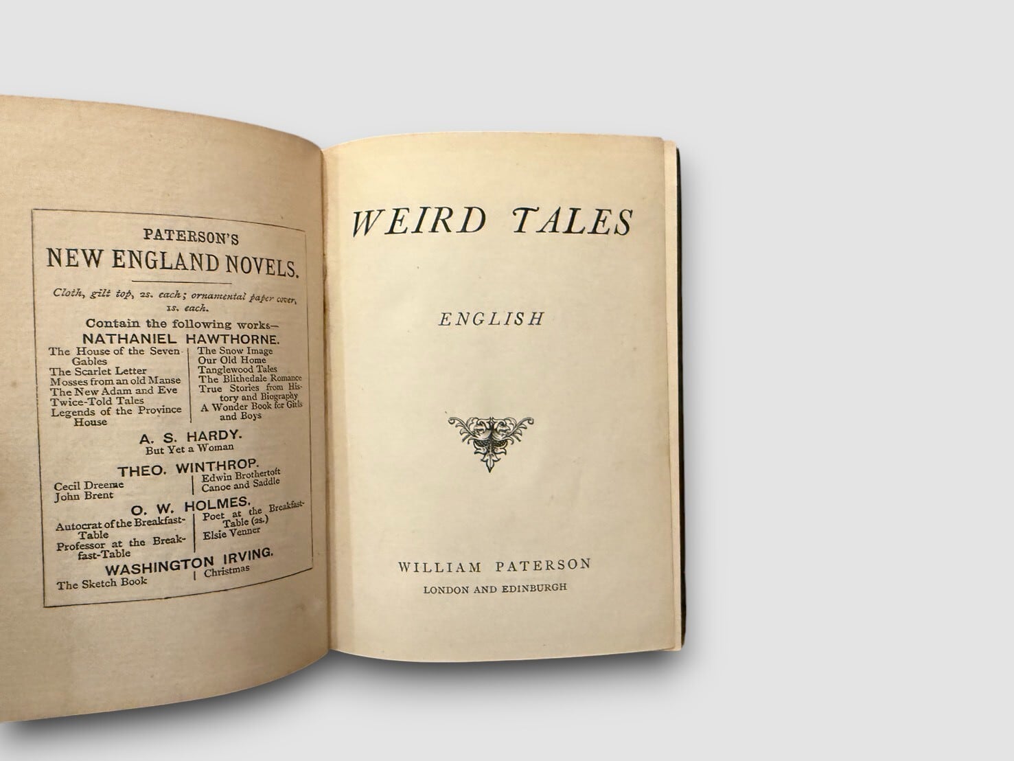 19世紀後半にロンドンの William Paterson 社から刊行された “Weird Tales” シリーズの一冊で、英語圏の怪談・奇譚・民間伝承を中心とした短編集。Charles Dickens、Daniel Defoe、A. Stewart Harrison、Edmund Yates、Charles Ollier など、英国文学や新聞文学で知られる著者の作品が収められており、当時の怪異文学や大衆文学の一端を知る資料として参照されることがある。刊記に出版年の明記はないが、装丁の特徴および同シリーズの既知書誌情報から、ca.1888 年頃に刊行された初期刷(Likely First Edition) と推定される。