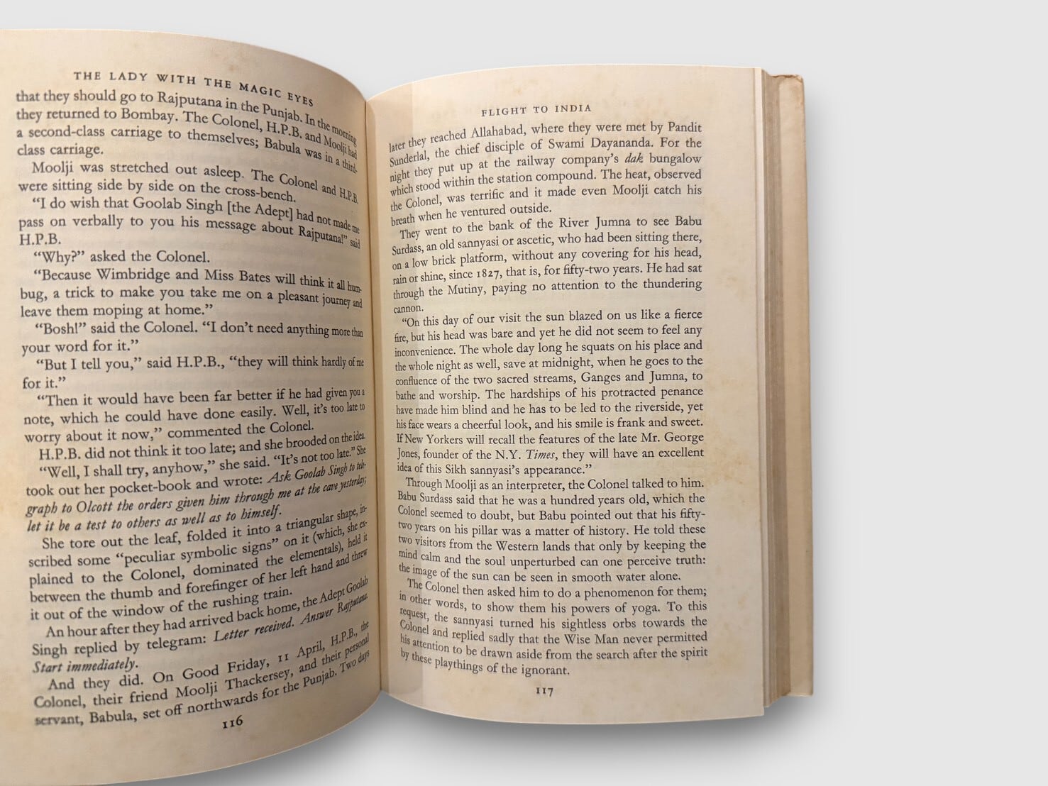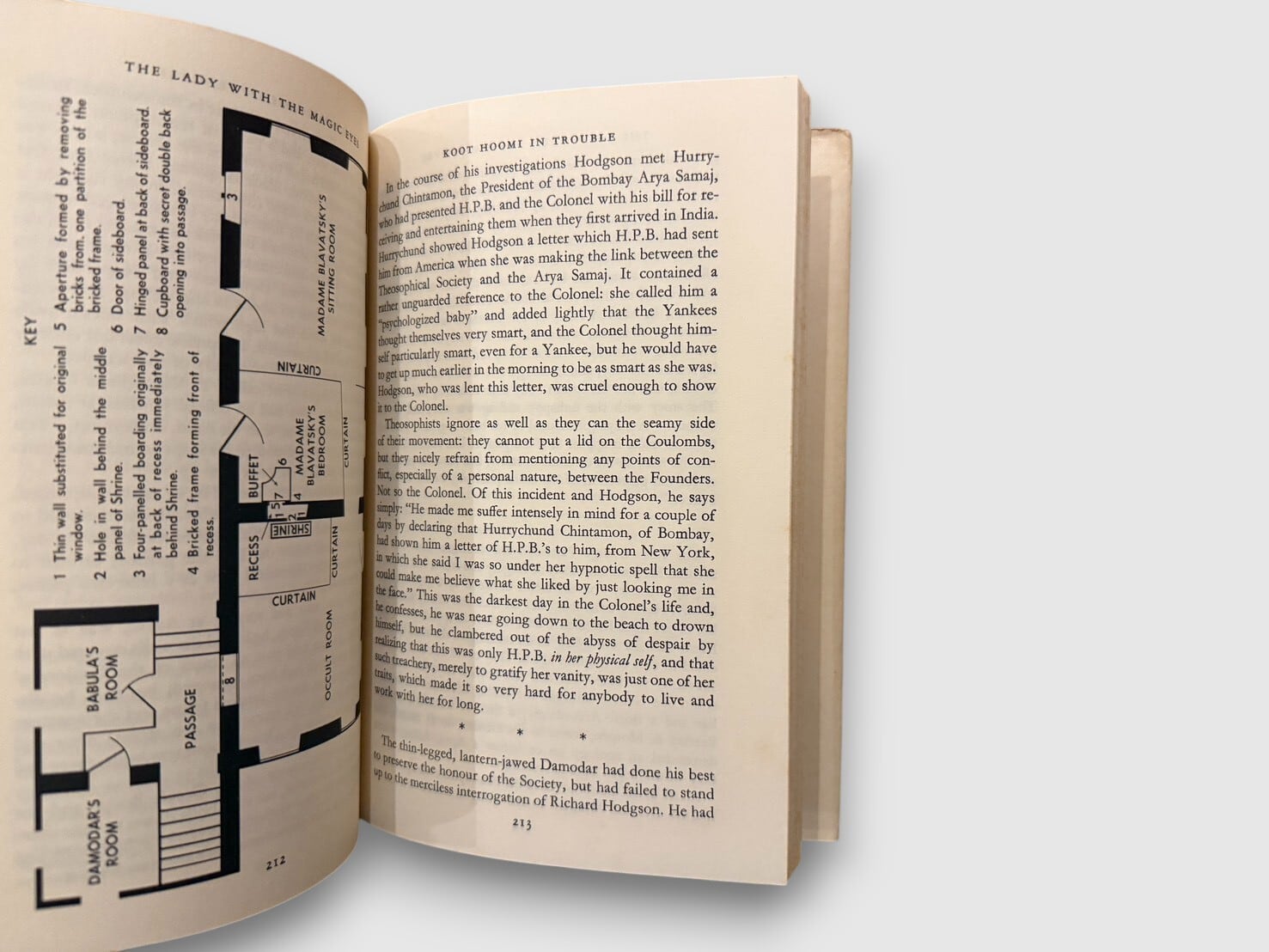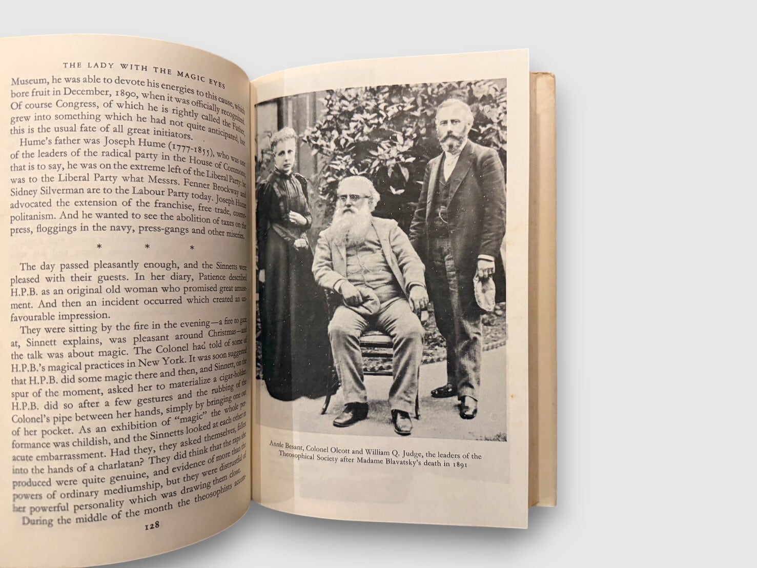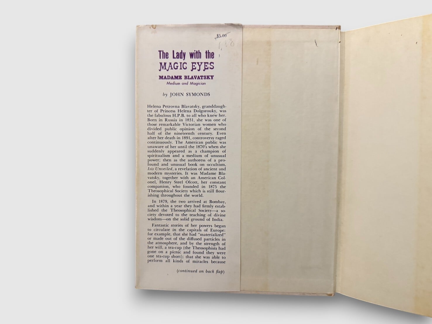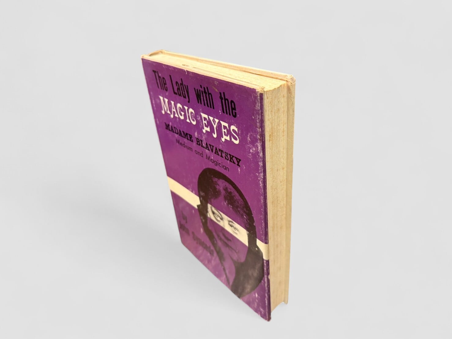 アレイスター・クロウリーの伝記で知られるジョン・シモンズが、近代神智学の創設者H. P. ブロヴァツキー夫人の生涯をたどった伝記。ブロヴァツキーの劇的な半生を、豊富な資料・証言・写真をもとに立体的に描き出しており、神秘家としての側面だけでなく、近代思想に影響を与えた人物としての姿にも触れている。インド、ヨーロッパ、アメリカへと広がる旅路、弟子たちとの関係、論争に揺れた時期など、彼女が歩んだ複雑な道を物語的に追う構成は読み応え十分。巻頭・本文に収められた写真と図版は本書の大きな魅力で、彼女の“魔法の眼差し”と呼ばれた表情や、神智学協会周辺の人物たちを鮮明に伝える。紫のオリジナル・ダストジャケット付きの初版は、入手が難しい希少な1冊。